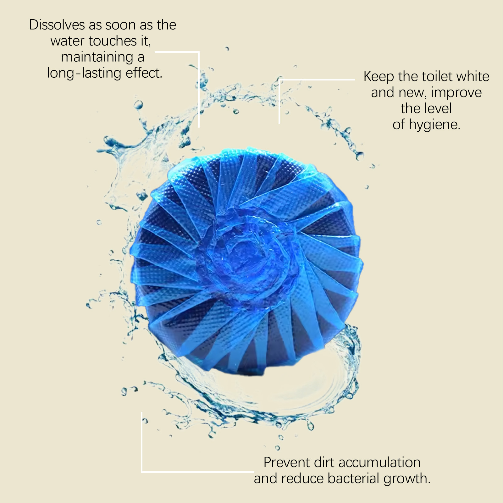 我们的马桶清洁块,由粘度剂、染料、香精精心调配而成。专为持续释放清新香味,改善浴室环境设计。使用方法极为便捷:取一片产品,并将其丢入马桶水箱,等待15分钟让它溶解。按下冲水按钮清洁马桶。并且可以简单放置,无需手动清洁。