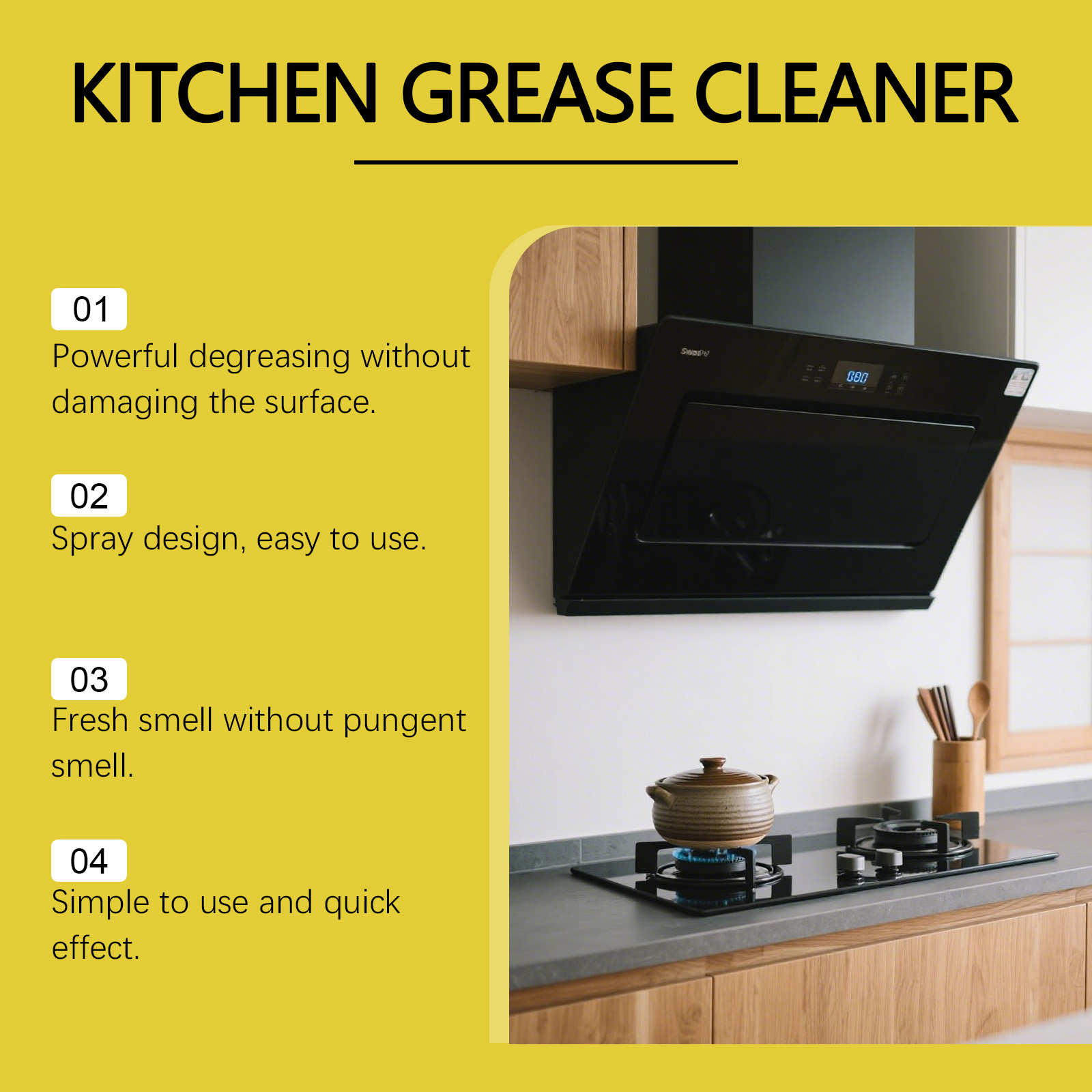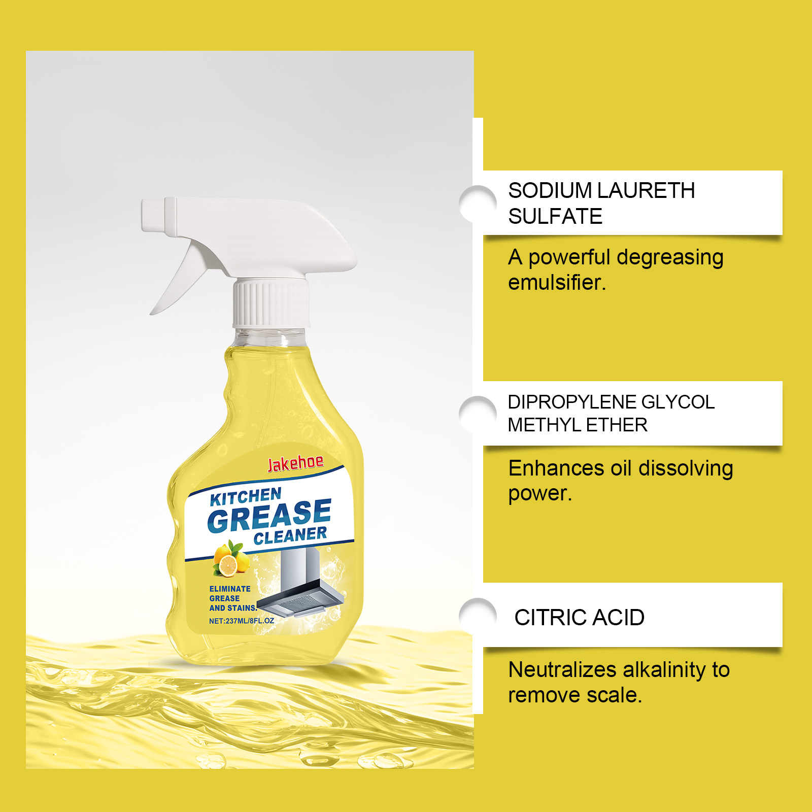 我们的油污净喷雾,由脂肪醇聚醚-9、二丙二醇甲醚精心调配而成。专为快速分解顽固油渍设计。使用方法极为便捷:使用前摇匀。将瓶子垂直对准油渍区域并直接喷洒,等待几分钟。污渍溶解后,用布擦拭干净。并且可以轻松去除炉灶上的油渍。