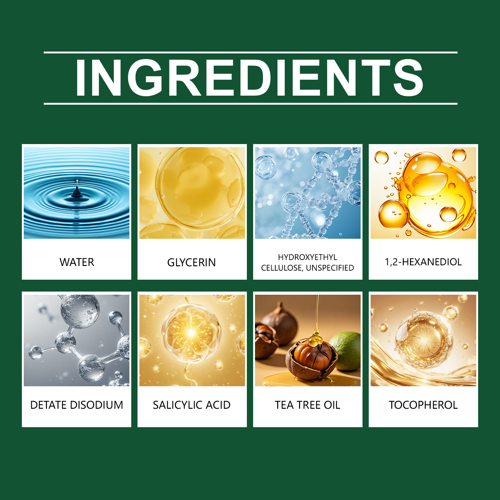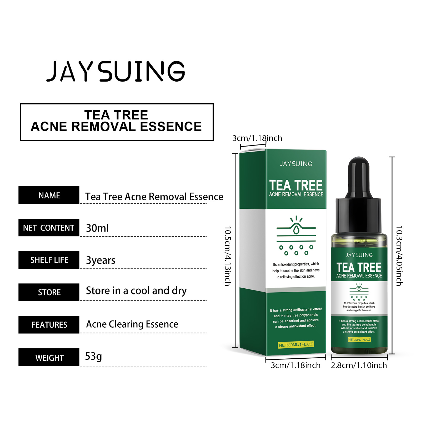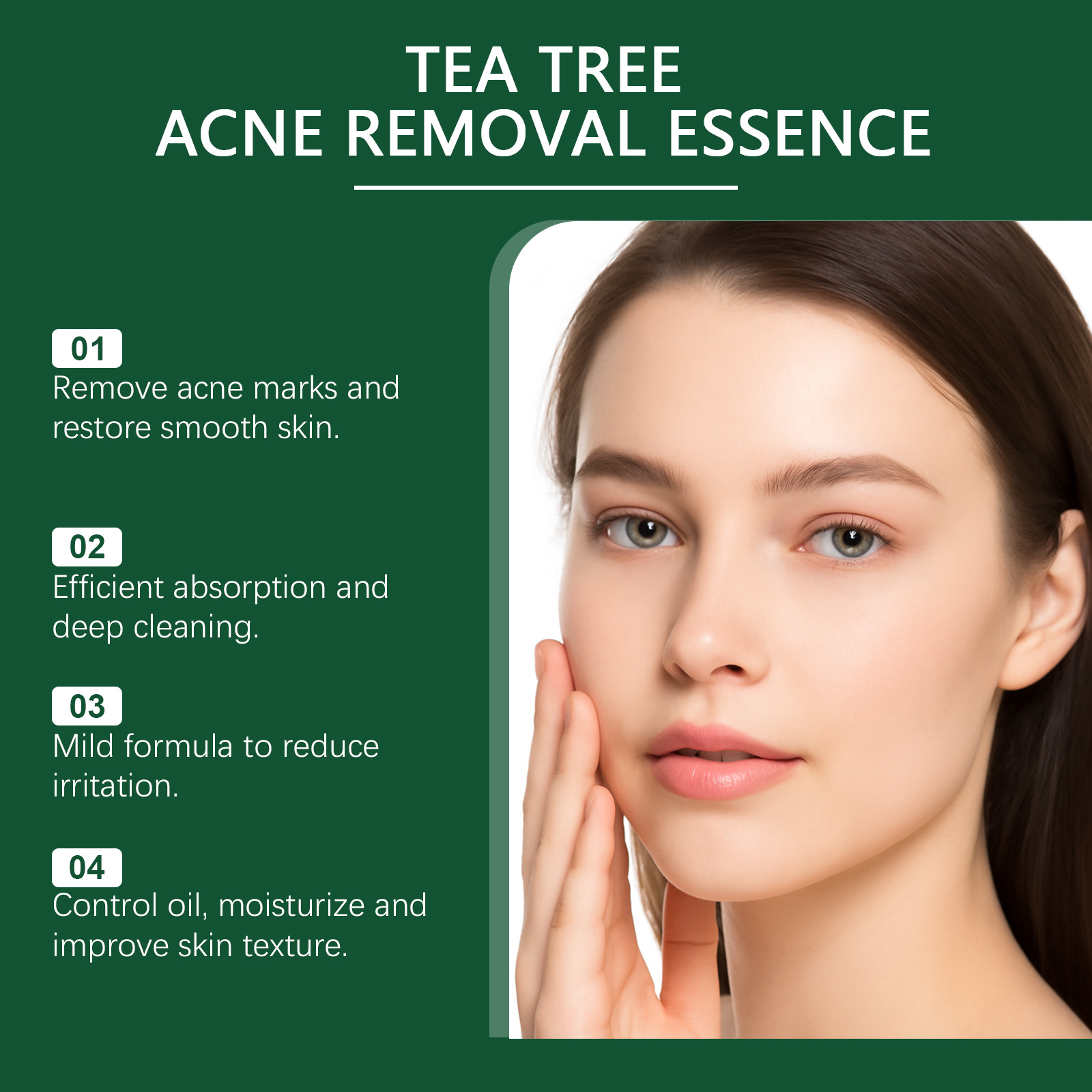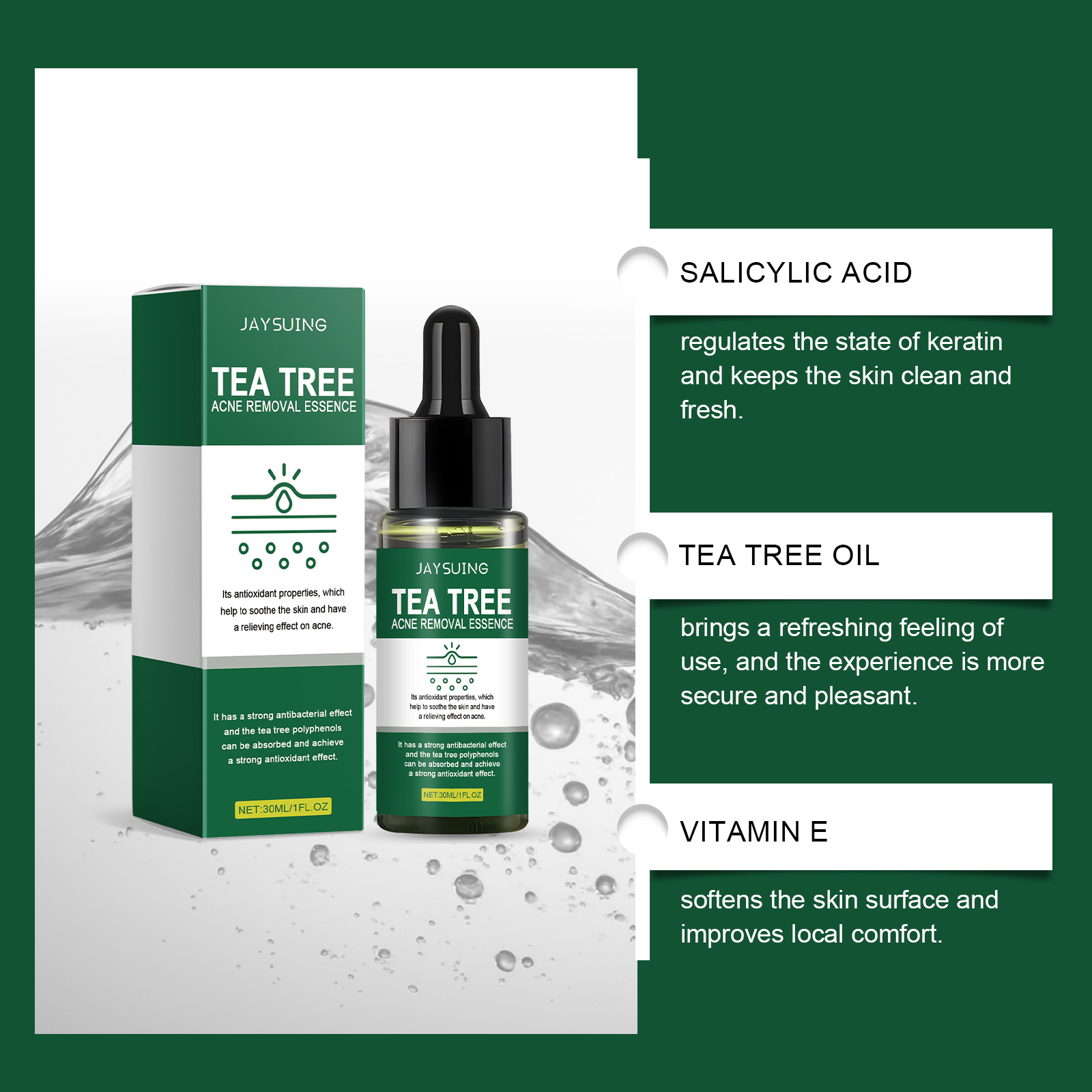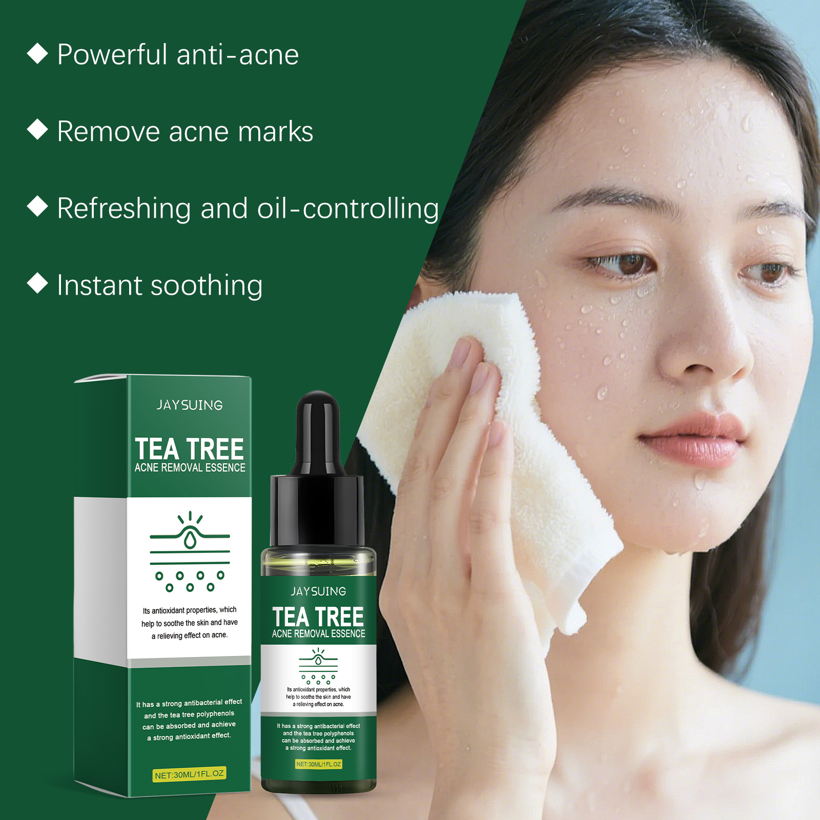 我们的保湿护肤精华液,由茶树油、生育酚(维生素E)精心调配而成。专为有效去除痘印设计。使用方法极为便捷:1.彻底清洁并擦干面部皮肤。2.取适量本产品,均匀涂抹于面部肌肤。3.轻轻按摩,以促进完全吸收。并且可以缓解痤疮,淡化痤疮疤痕和痤疮印记。