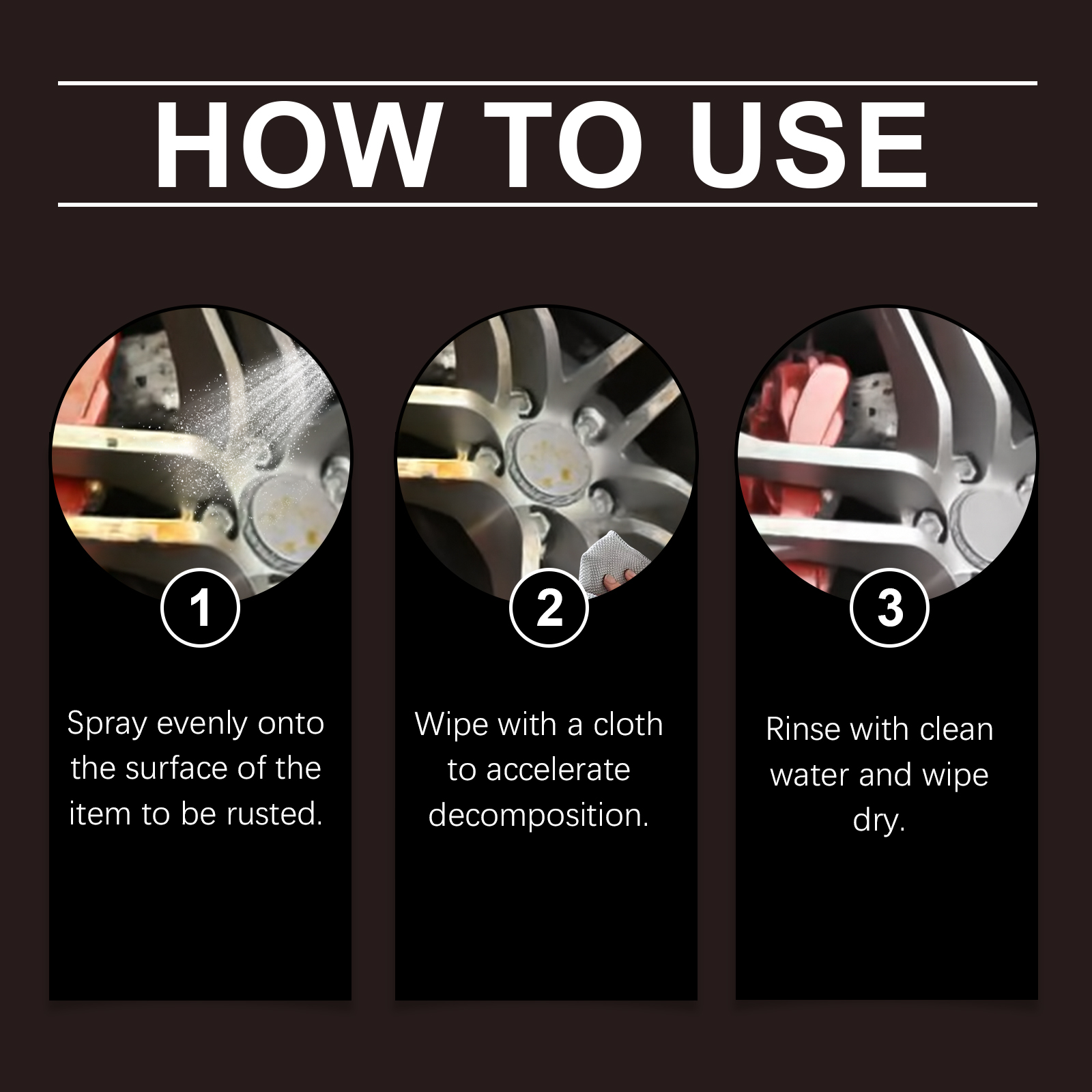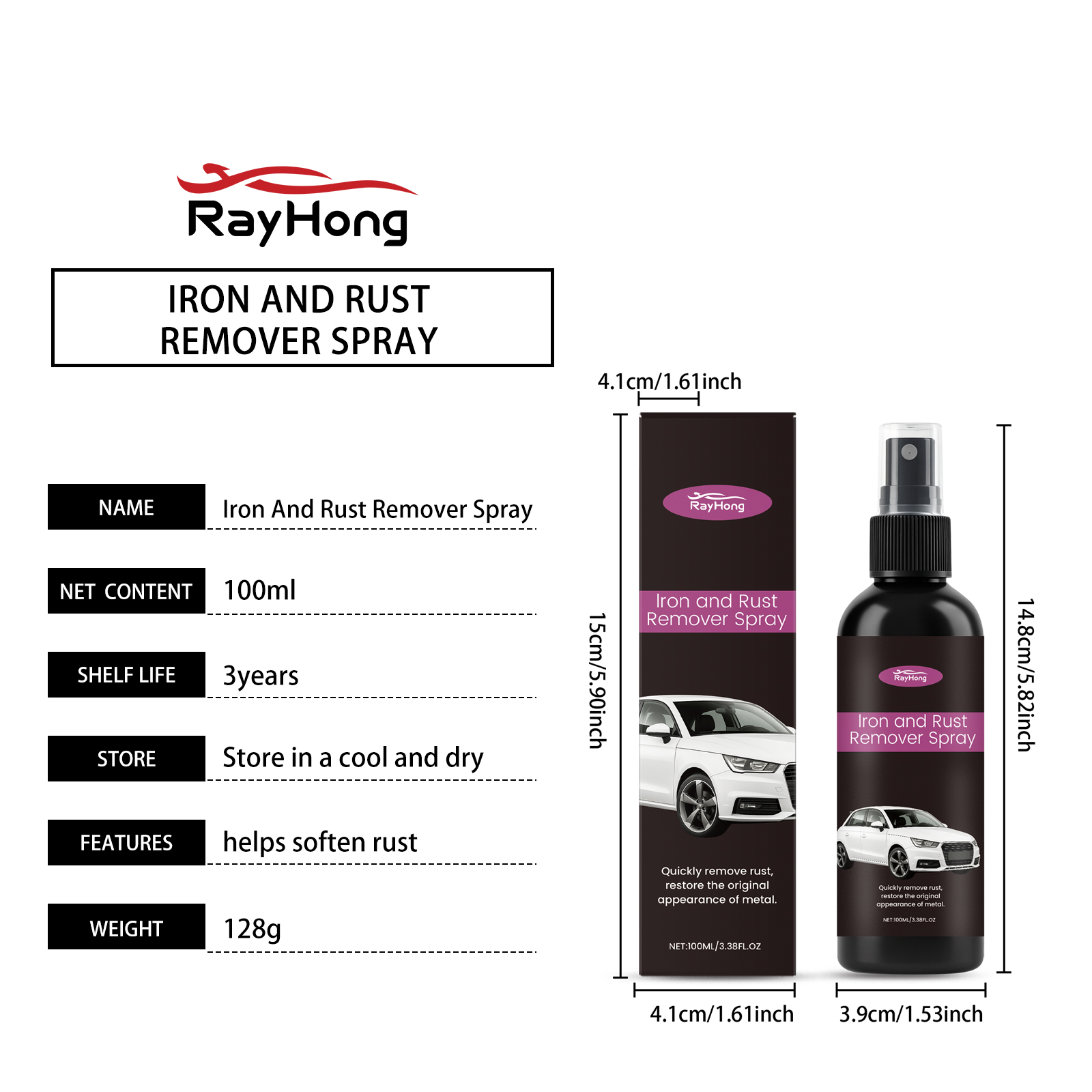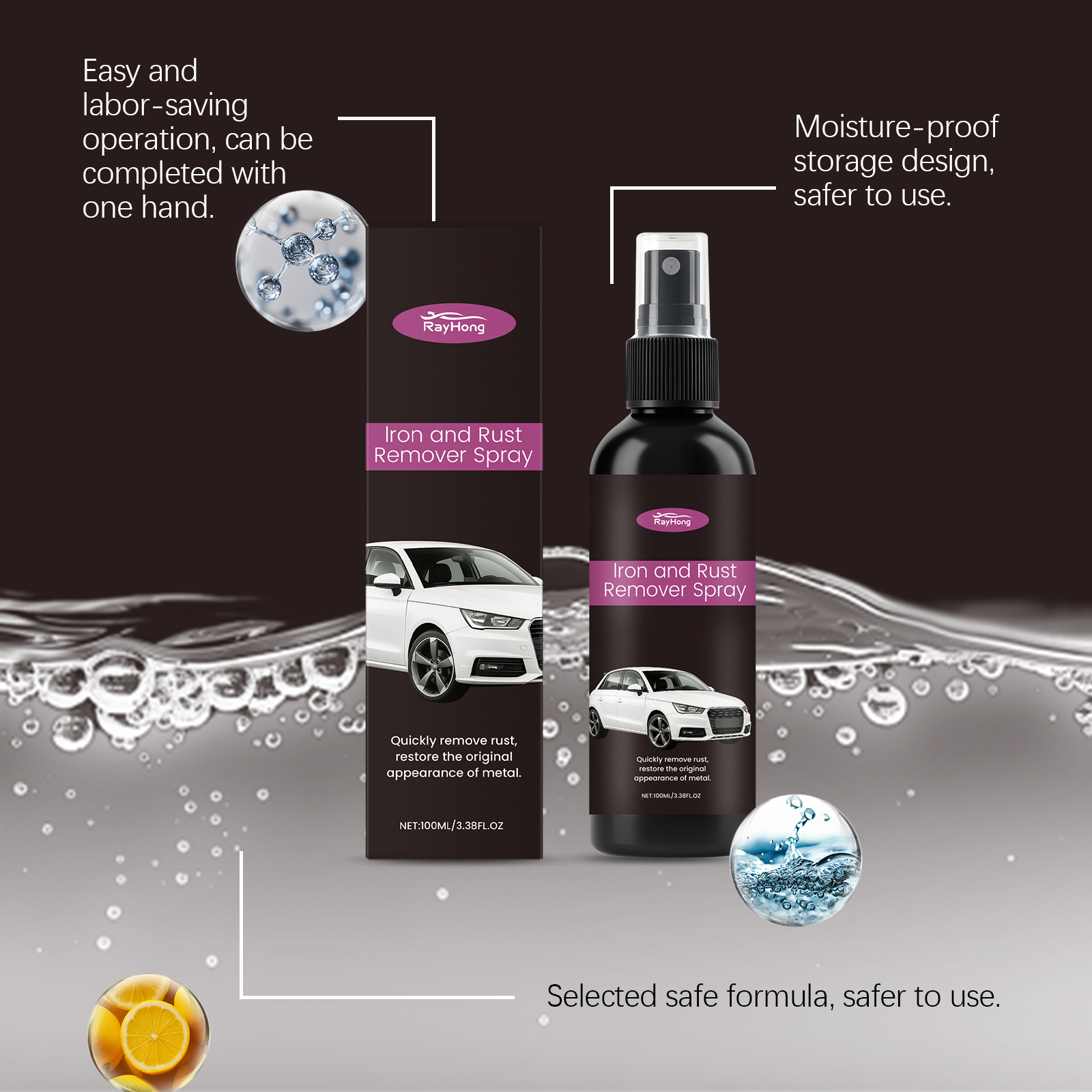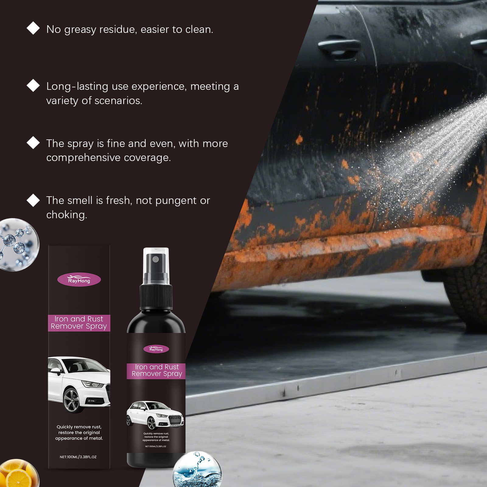 我们的汽车除锈喷雾,由柠檬酸、葡萄糖酸钠精心调配而成。专为快速去除铁锈,恢复金属原貌设计。使用方法极为便捷:均匀喷洒在要防锈的物品表面。用布擦拭以加速分解。用清水冲洗并擦干。并且简单喷洒擦拭即可,适用于多种金属表面,除锈效果显著。