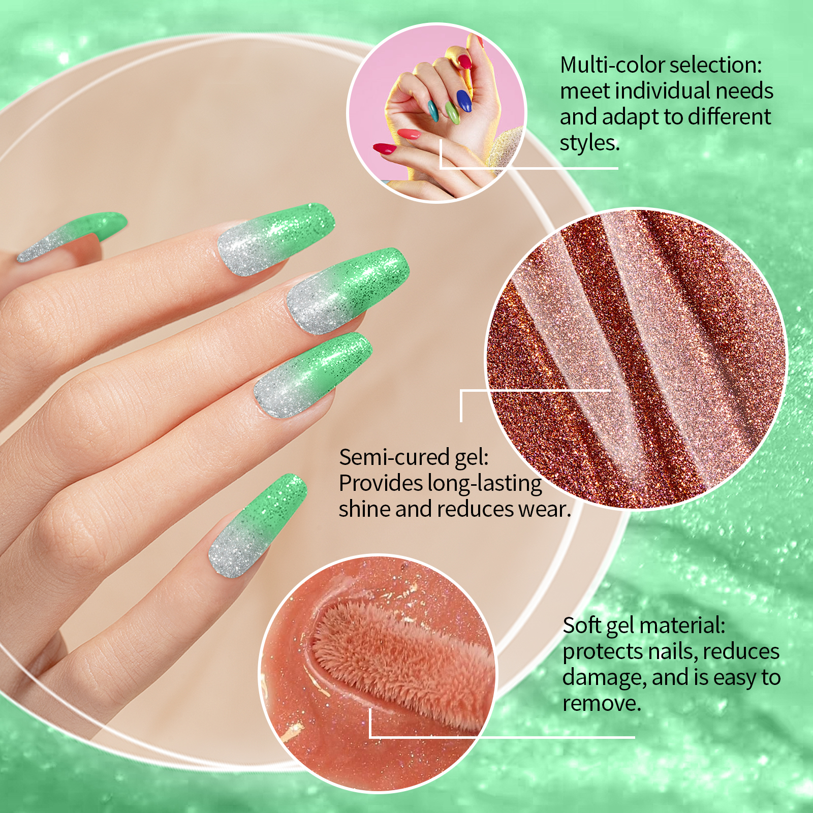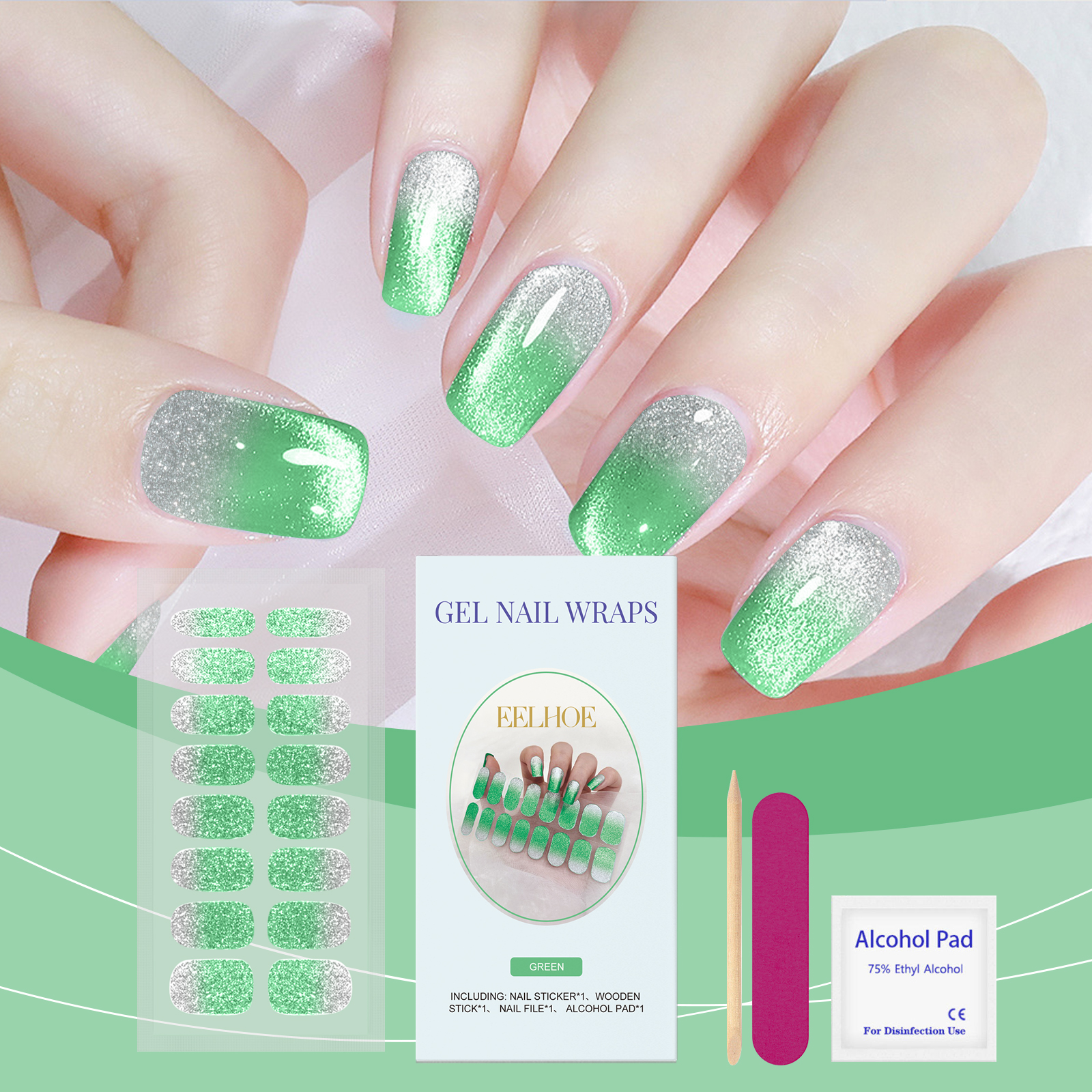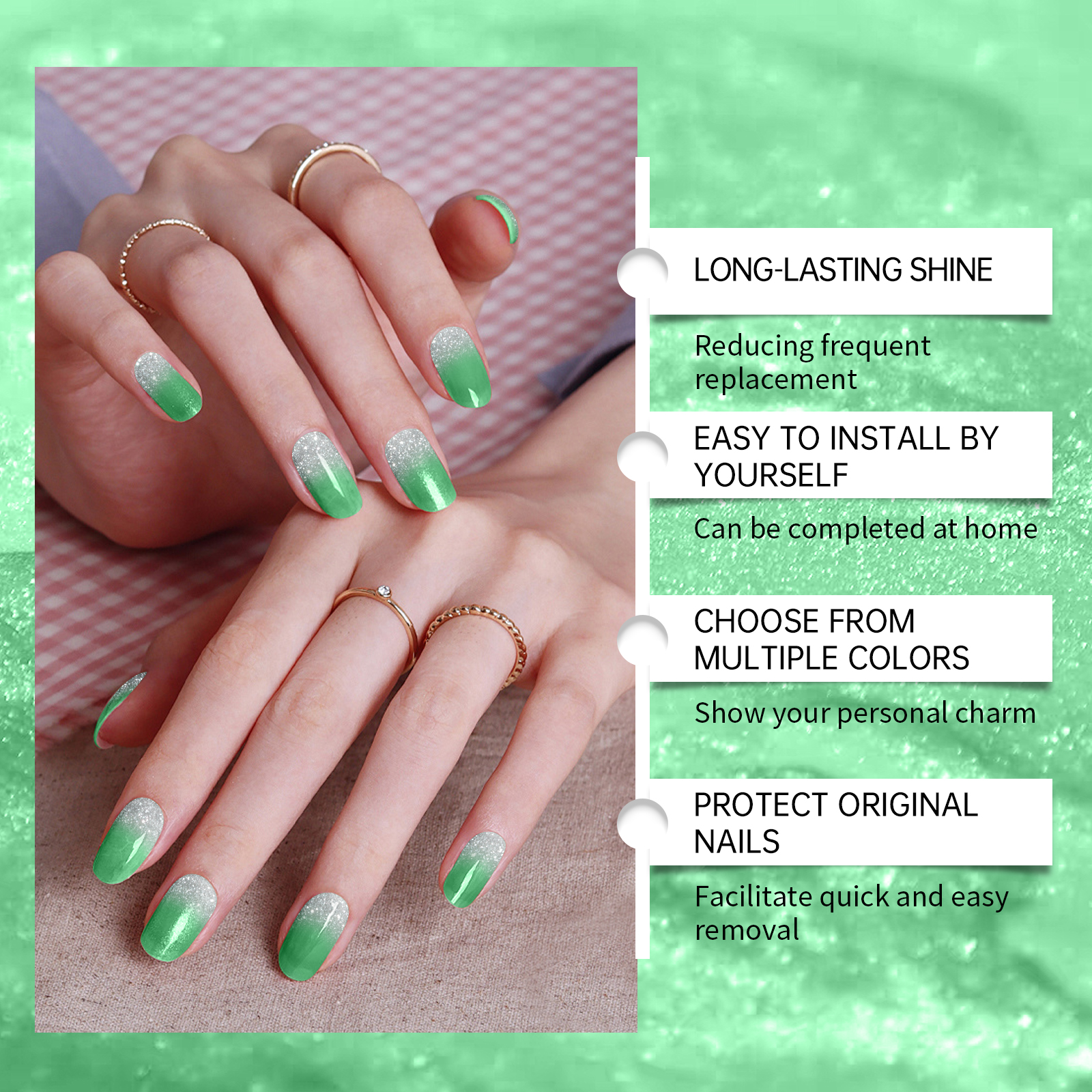 我们的软凝胶指甲贴套装(闪光绿色),由半固化凝胶精心调配而成。专为轻松恢复指甲原有状态设计。使用方法极为便捷:1.用酒精垫清洁指甲,选择适合你指甲的尺寸;2.把钉贴贴在钉子上,用木棒沿边缘压紧,用钉子把多余的部分剪掉;3.最后用指甲锉和剪刀把指甲的边缘打磨一下。并且可以提供多种颜色,满足不同需求。
