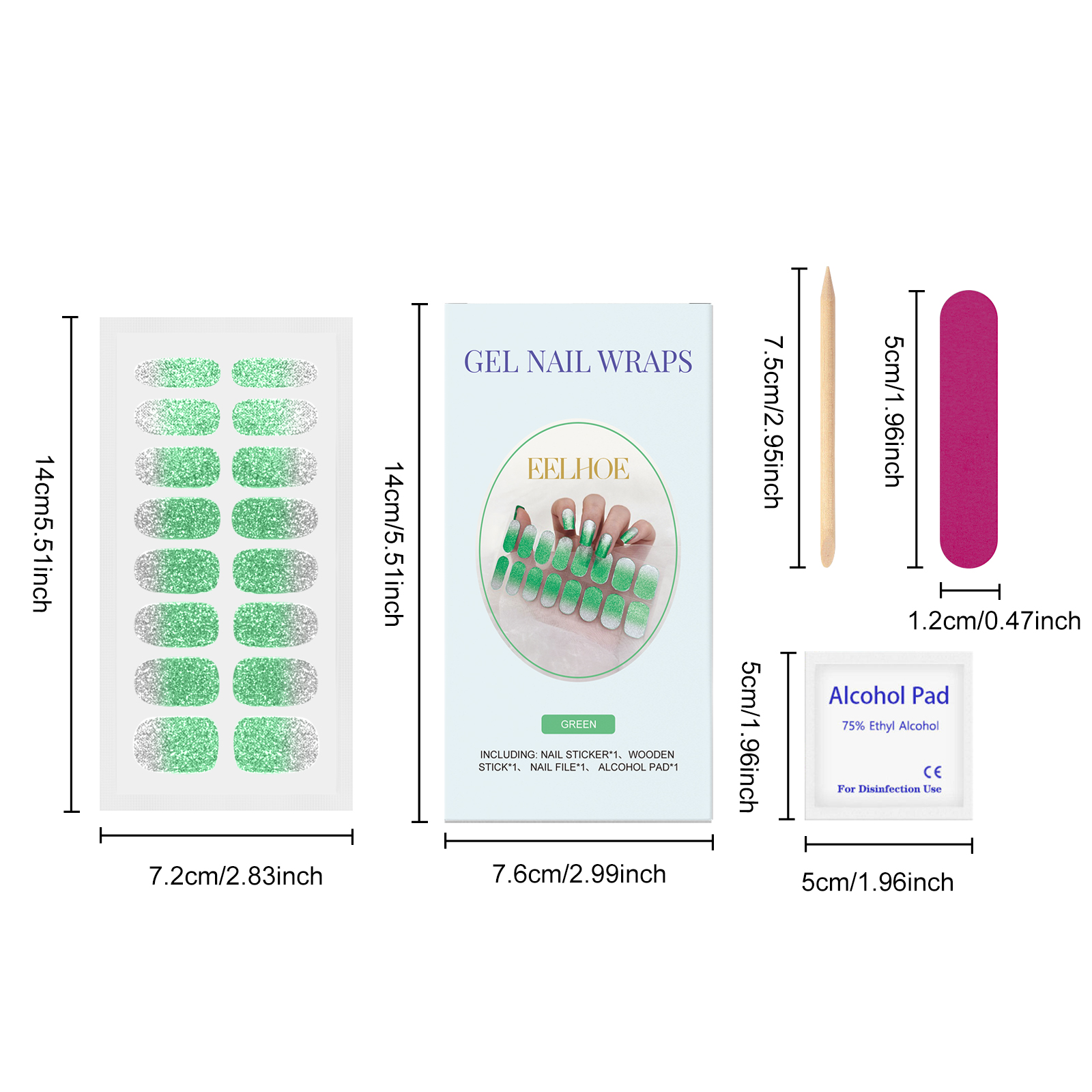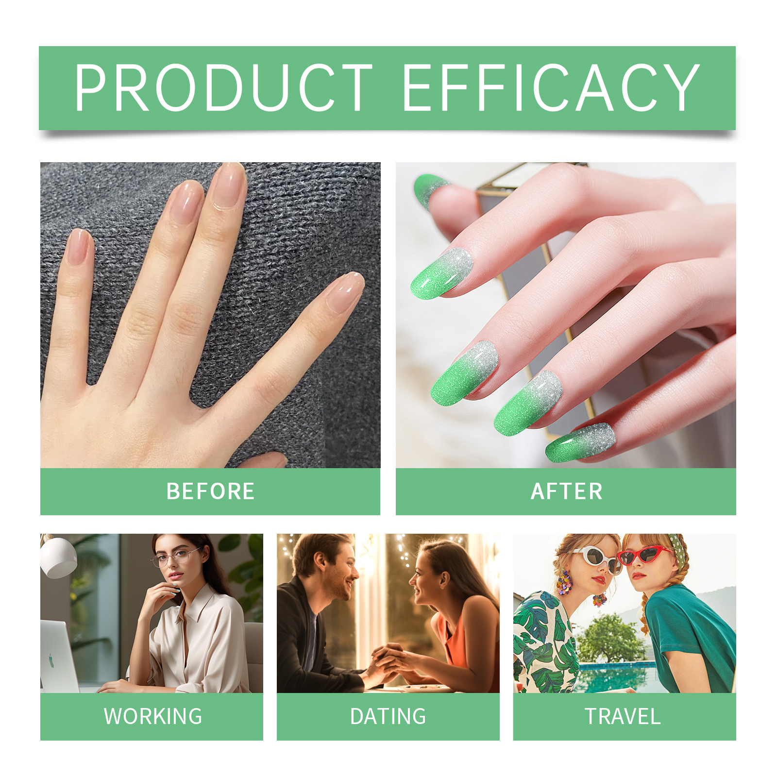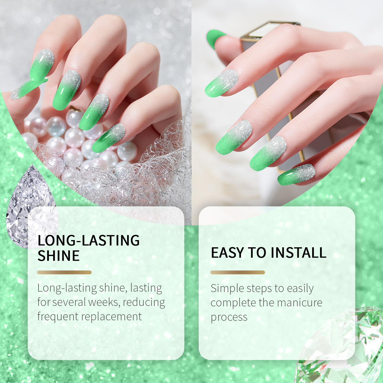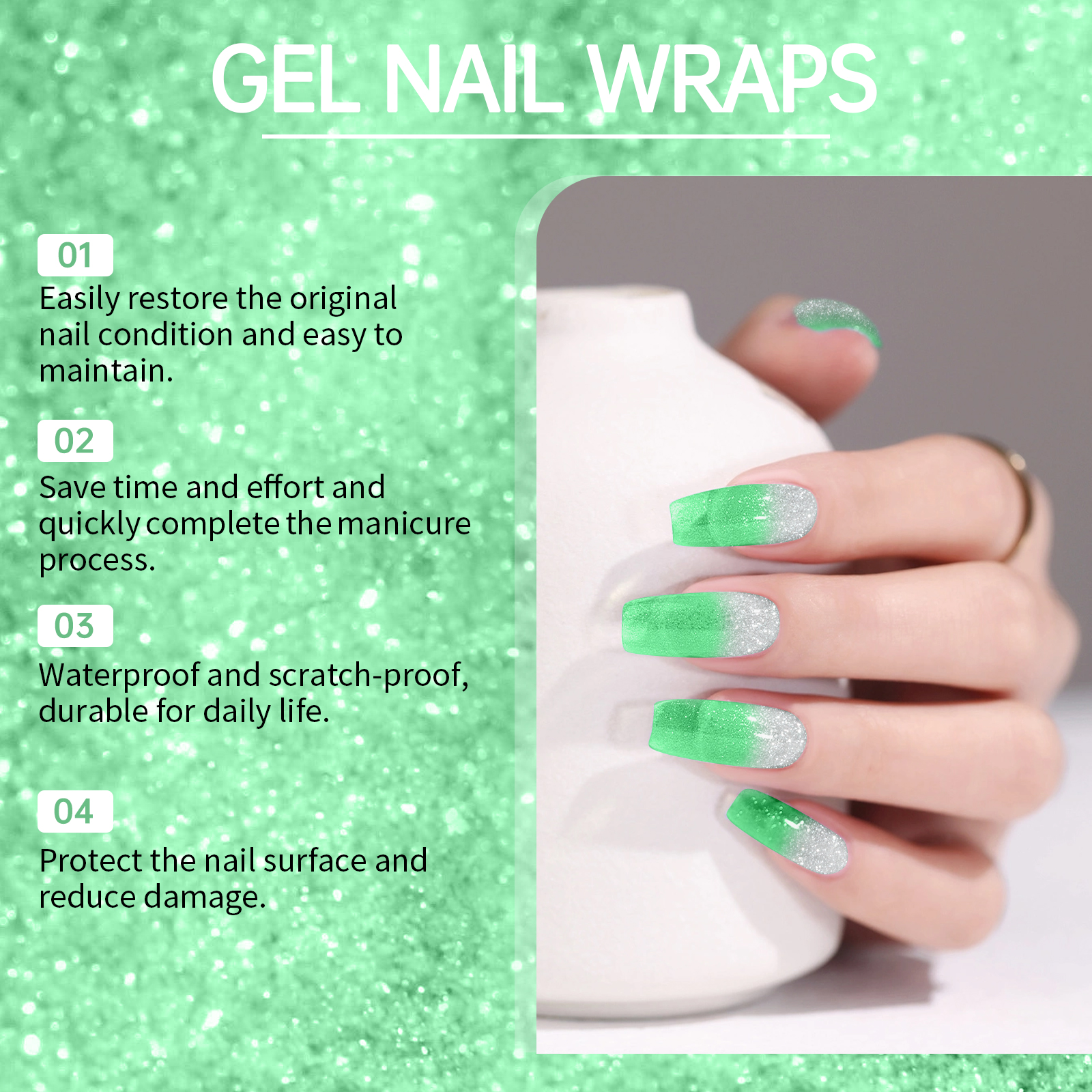 我们的软凝胶指甲贴套装(闪光绿色),由半固化凝胶精心调配而成。专为轻松恢复指甲原有状态设计。使用方法极为便捷:1.用酒精垫清洁指甲,选择适合你指甲的尺寸;2.把钉贴贴在钉子上,用木棒沿边缘压紧,用钉子把多余的部分剪掉;3.最后用指甲锉和剪刀把指甲的边缘打磨一下。并且可以提供多种颜色,满足不同需求。
