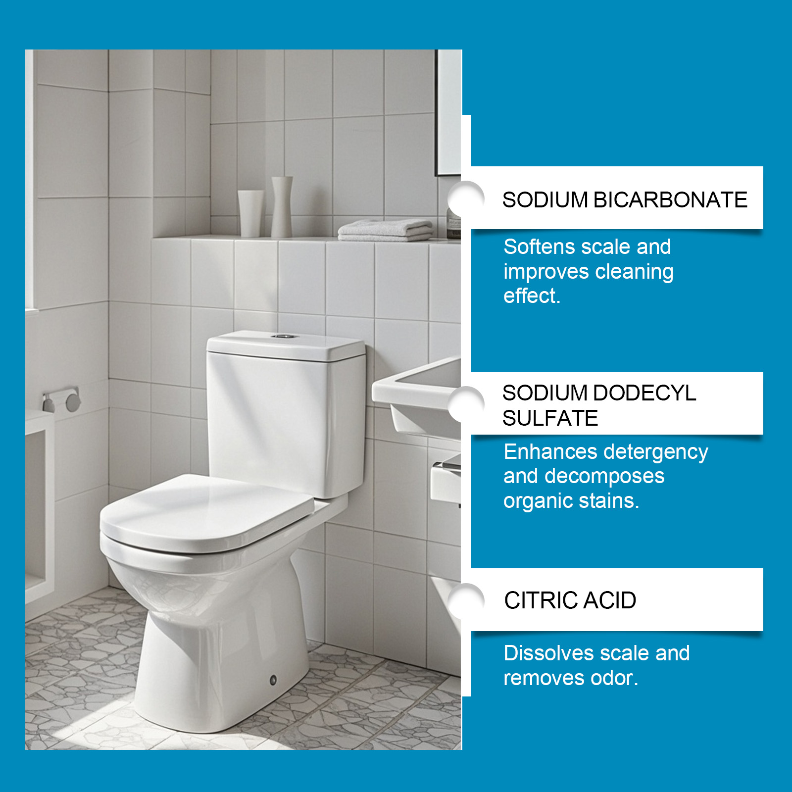 我们的马桶清洁粉,由十二烷基硫酸钠、柠檬酸精心调配而成。专为深入马桶缝隙,溶解顽固污渍设计。使用方法极为便捷:将热水倒入马桶加入适量的本产品,并静置2小时。用刷子轻轻擦拭马桶直到污渍被清除。并且可以减少浴室异味带来的麻烦。