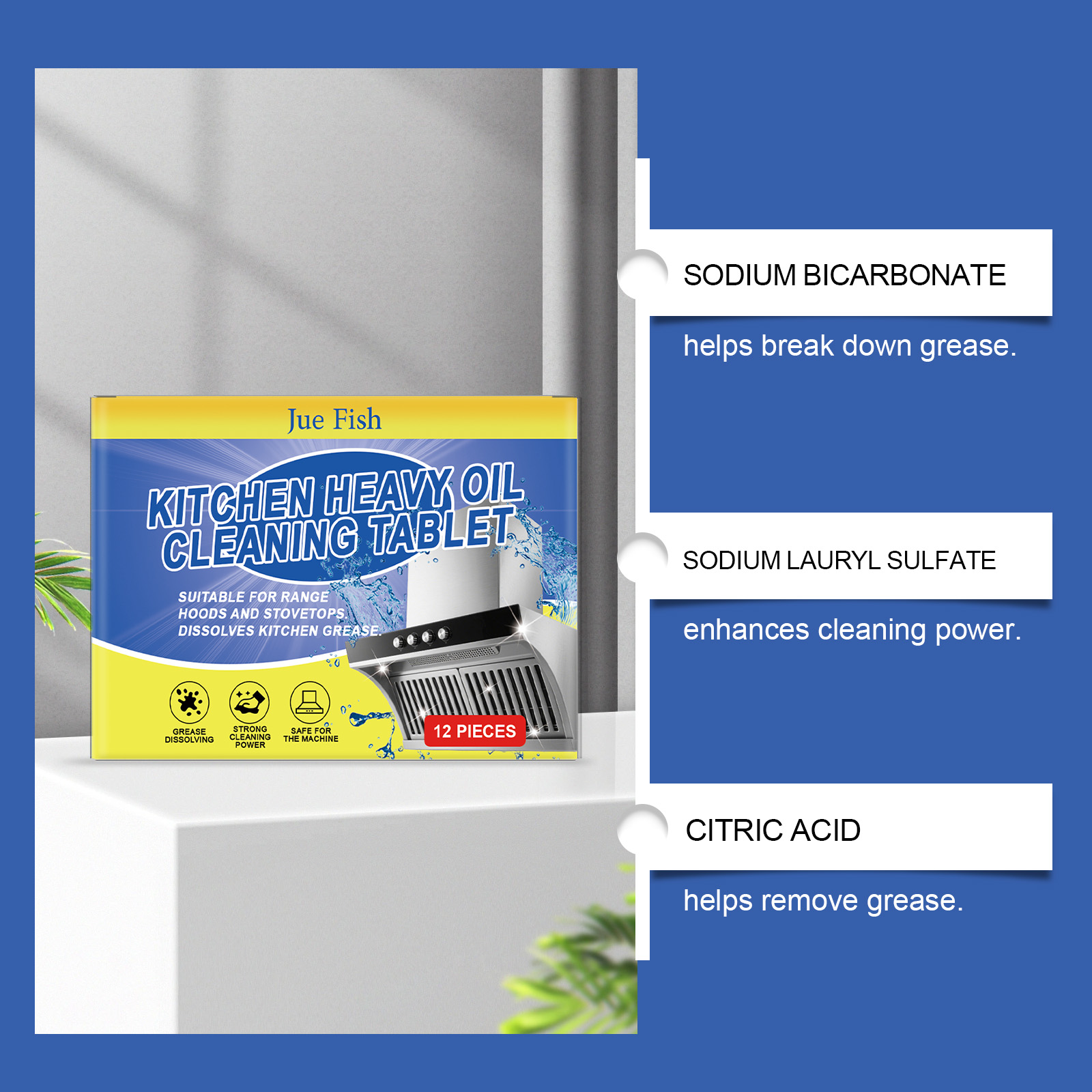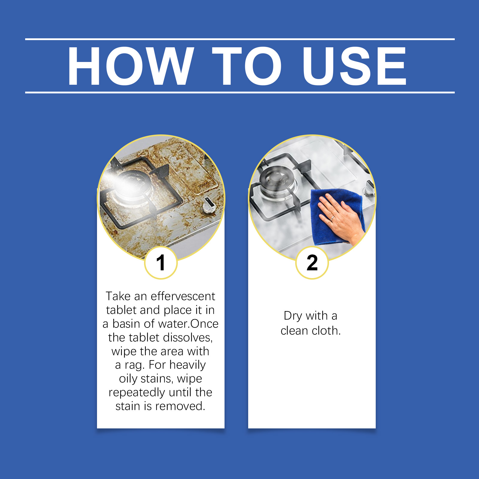 我们的油污清洁泡腾片,由碳酸氢钠、十二烷基硫酸钠精心调配而成。专为有效分解顽固的厨房油渍设计。使用方法极为便捷:取一片泡腾片,将其放入一盆水中。一旦药片溶解后,用抹布擦拭该区域。对于重油渍,反复擦拭直到污渍去除为止。用干净的布擦干。并且可以帮助去除抽油烟机和炉灶等区域的顽固油脂。