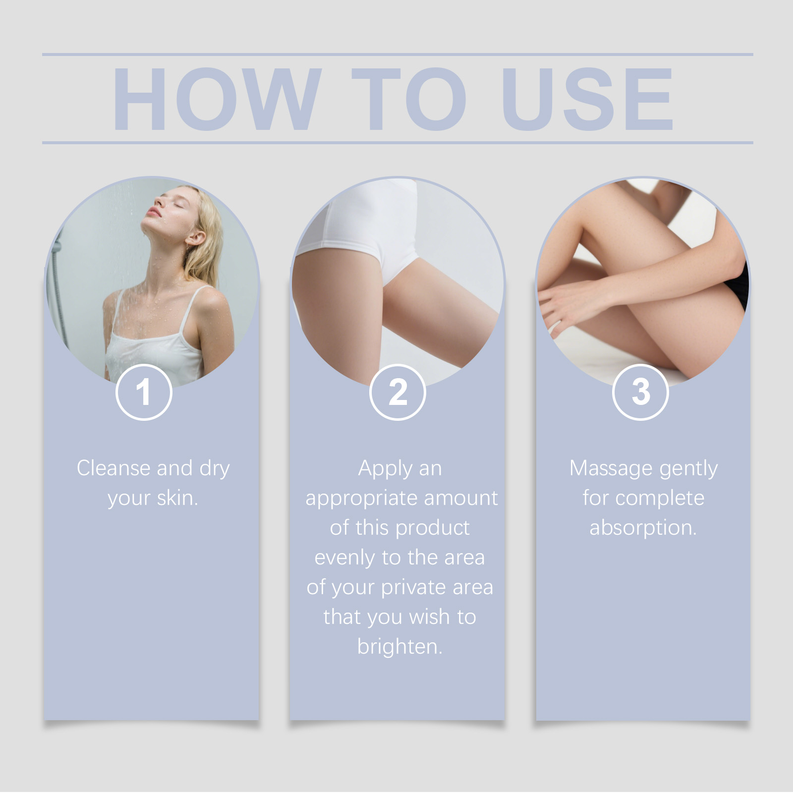 我们的女士护理精华乳,由烟酰胺、维生素E精心调配而成。专为缓解不适设计。使用方法极为便捷:清洁并擦干皮肤。将适量的本产品均匀涂抹在您希望提亮的私处区域。轻轻按摩直至完全吸收。并且温和且不刺激,适合身体多个部位使用。