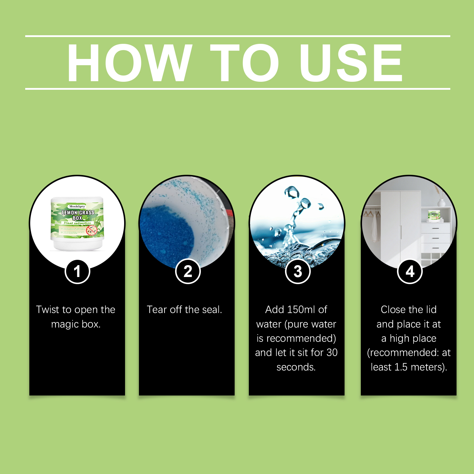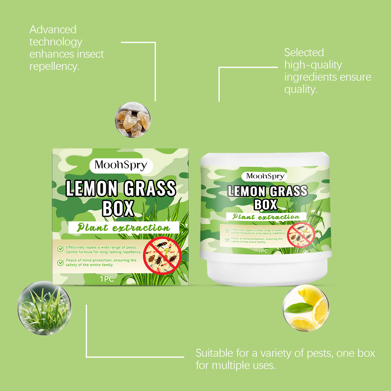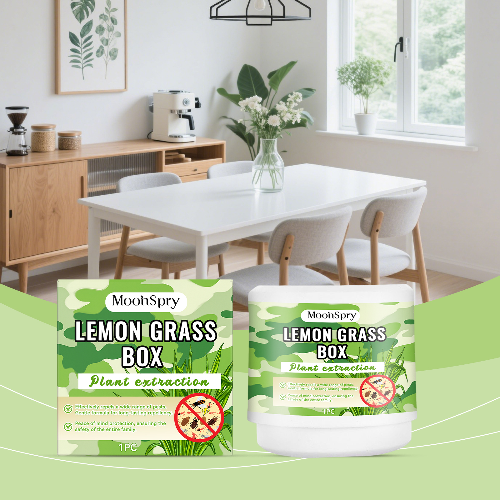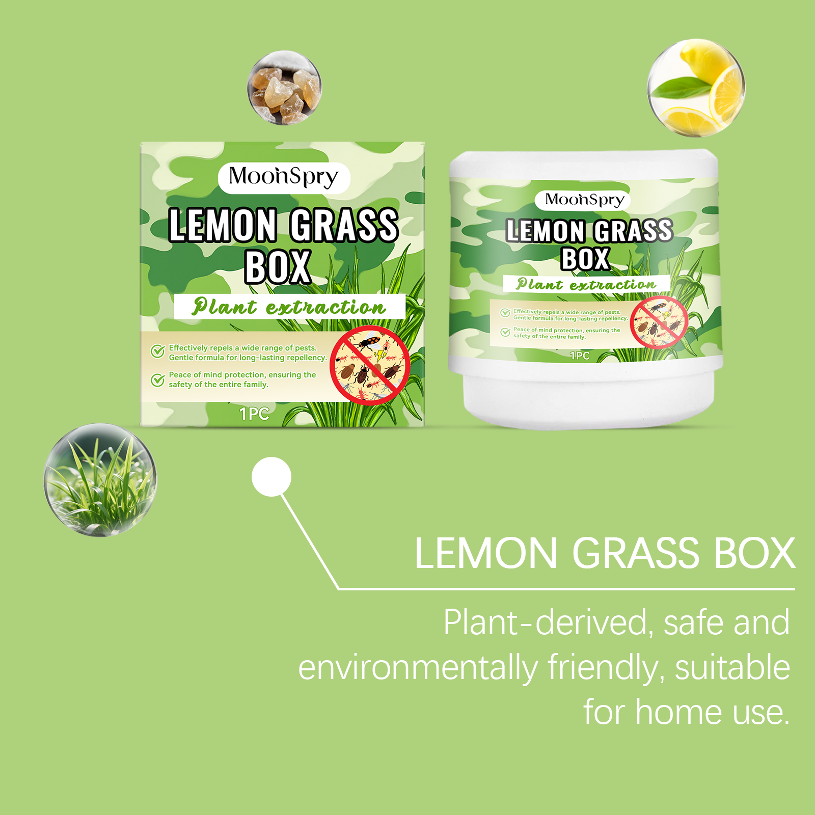 我们的害虫驱避盒,由柠檬桉叶提取物、香茅提取物精心调配而成。专为有效驱赶害虫设计。使用方法极为便捷:扭动打开魔法盒,撕掉封条。加入150毫升水(建议使用纯净水),静置30秒。盖上盖子并将其放置在高处(建议:至少1.5米)。并且采用安全成分,无害。