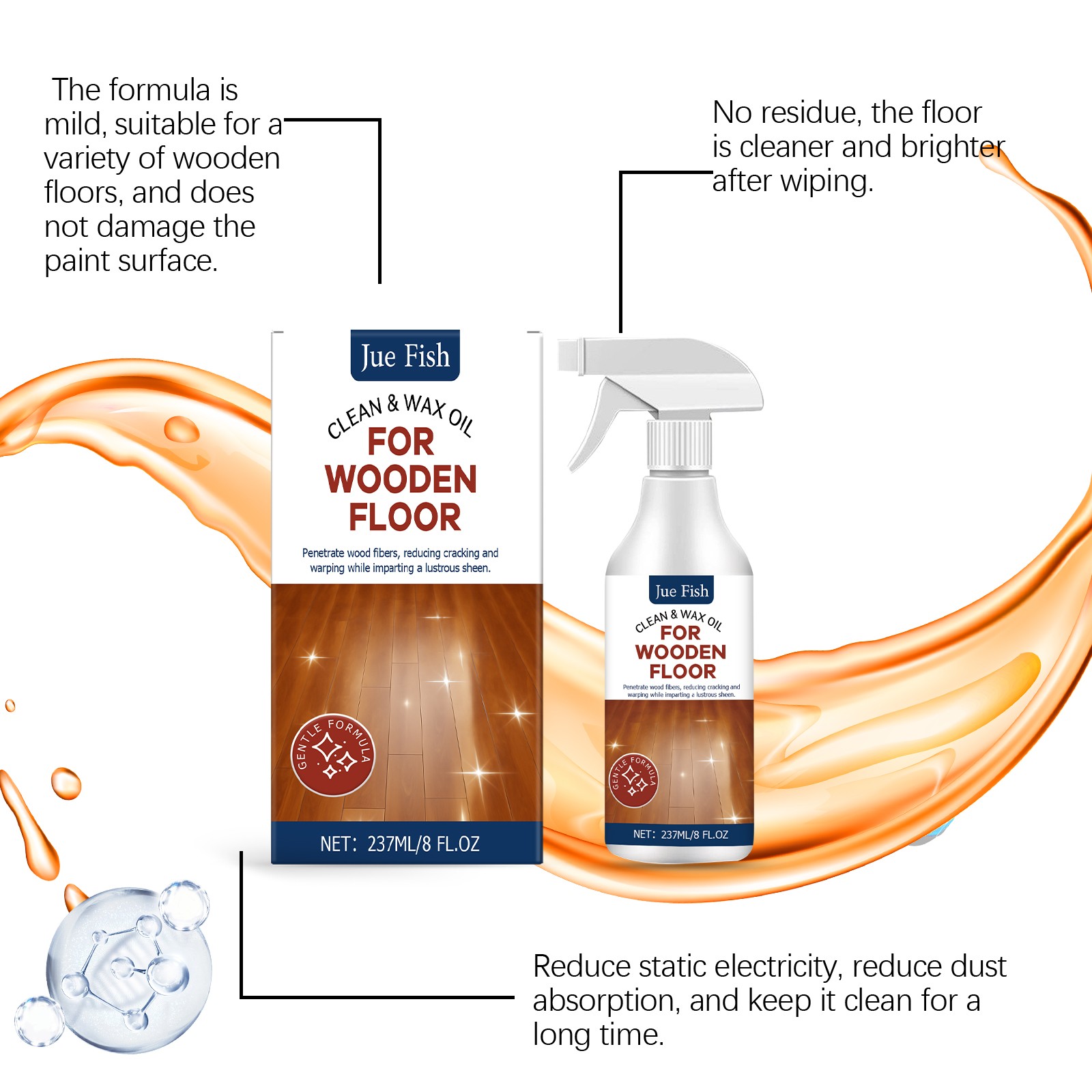 我们的木地板抛光喷雾,由柠檬香精、甲基异噻唑啉酮精心调配而成。专为轻松去除日常污渍设计。使用方法极为便捷:清洁地板后,将适量的本产品均匀喷洒在地板表面。使用干净的、略微湿润的拖把均匀地在地板上拖拭清洁剂。等待1-2分钟,让地板完全吸收。然后用干净的布来回擦拭,以抛光。并且可以保持木地板明亮和新,减少磨损和划痕。