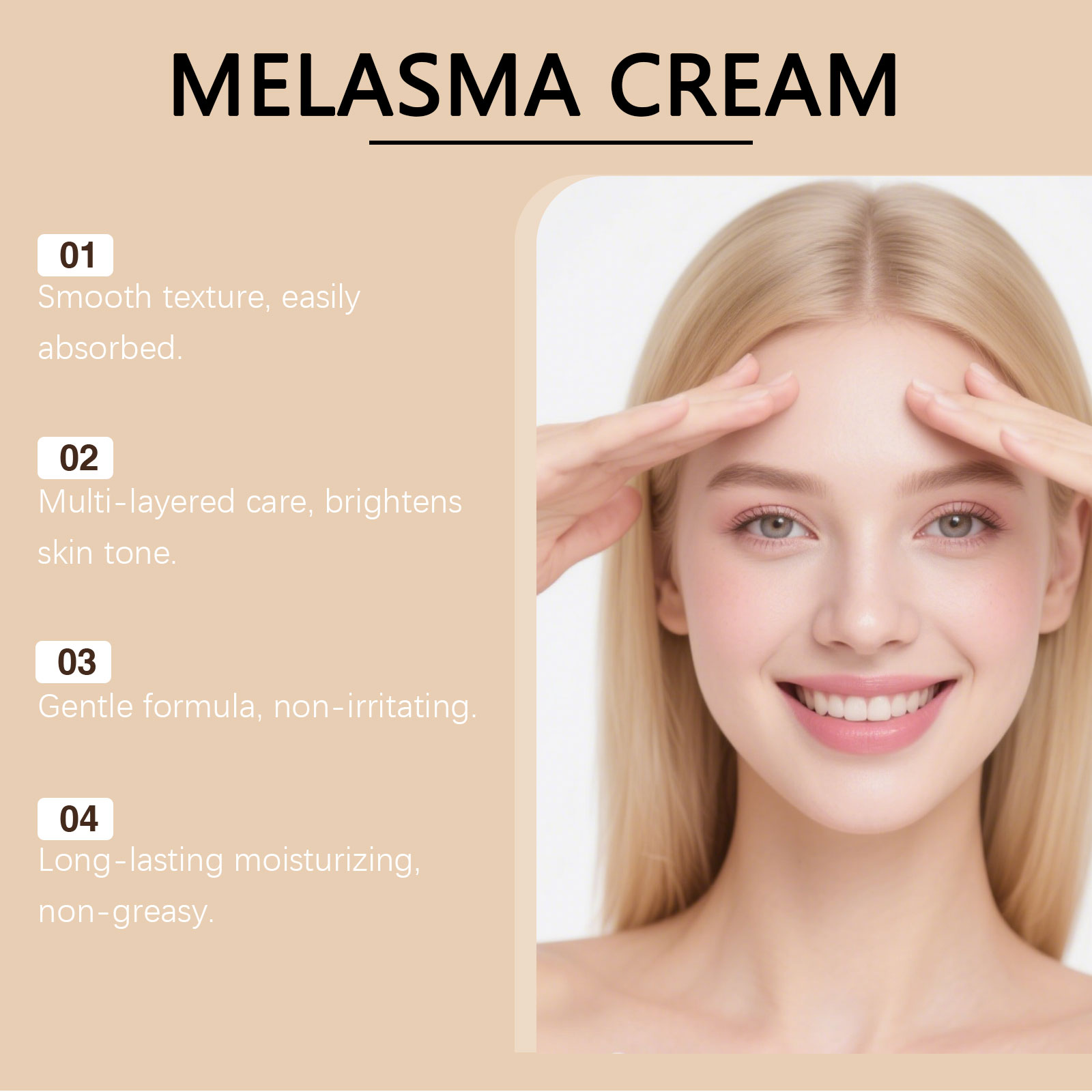 我们的焕颜透亮霜,由三乙醇胺、卡波姆精心调配而成。专为减少暗沉,打造明亮的肤色设计。使用方法极为便捷:清洁后,取适量本产品均匀涂抹于面部,并轻轻按摩至吸收。并且可以减少暗斑并改善肤色。