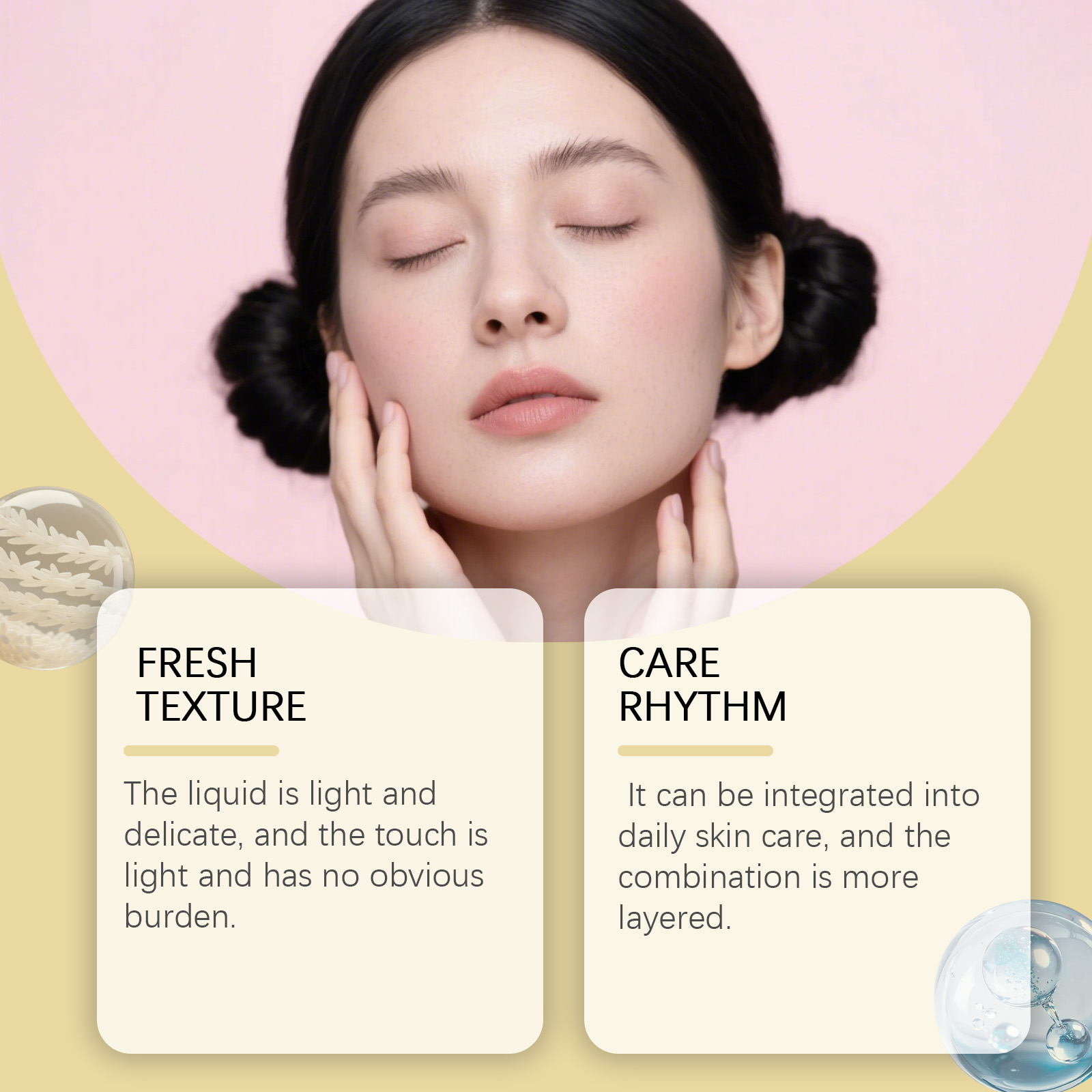 我们的大米角质护理精华液,由甘油、矿油、甘油硬脂酸酯精心调配而成。专为有助于温和去除老废角质,提亮肤色,让您的肌肤焕发亮丽光采,有助于深入滋养肌肤,提升水润饱满感设计。使用方法极为便捷:1.清洁面部肌肤并保持干燥。2.取适量本品均匀涂抹在面部肌肤,轻轻按摩30-60秒以去除死皮。3.用温水洗净即可。并且它可以有助于改善粗糙与暗沉,令您的肌肤触感细腻柔滑更有弹性,有效深层保湿同时锁水,强韧您的肌肤屏障,维持健康状态。