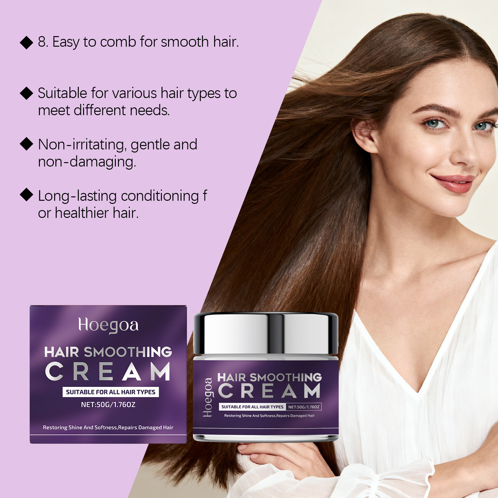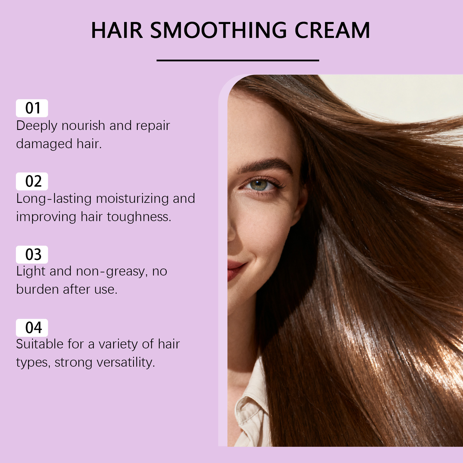 我们的滋养直发霜,由椰子油、乳酸精心调配而成。专为深层滋养和修复受损发质设计。使用方法极为便捷:1.洗净头发并擦干至半干。2.取适量本产品涂抹于头发和头皮。3.用手轻轻按摩头发和头皮。4.用清水冲洗干净。并且适用于多种发质,具有很强的多功能性。
