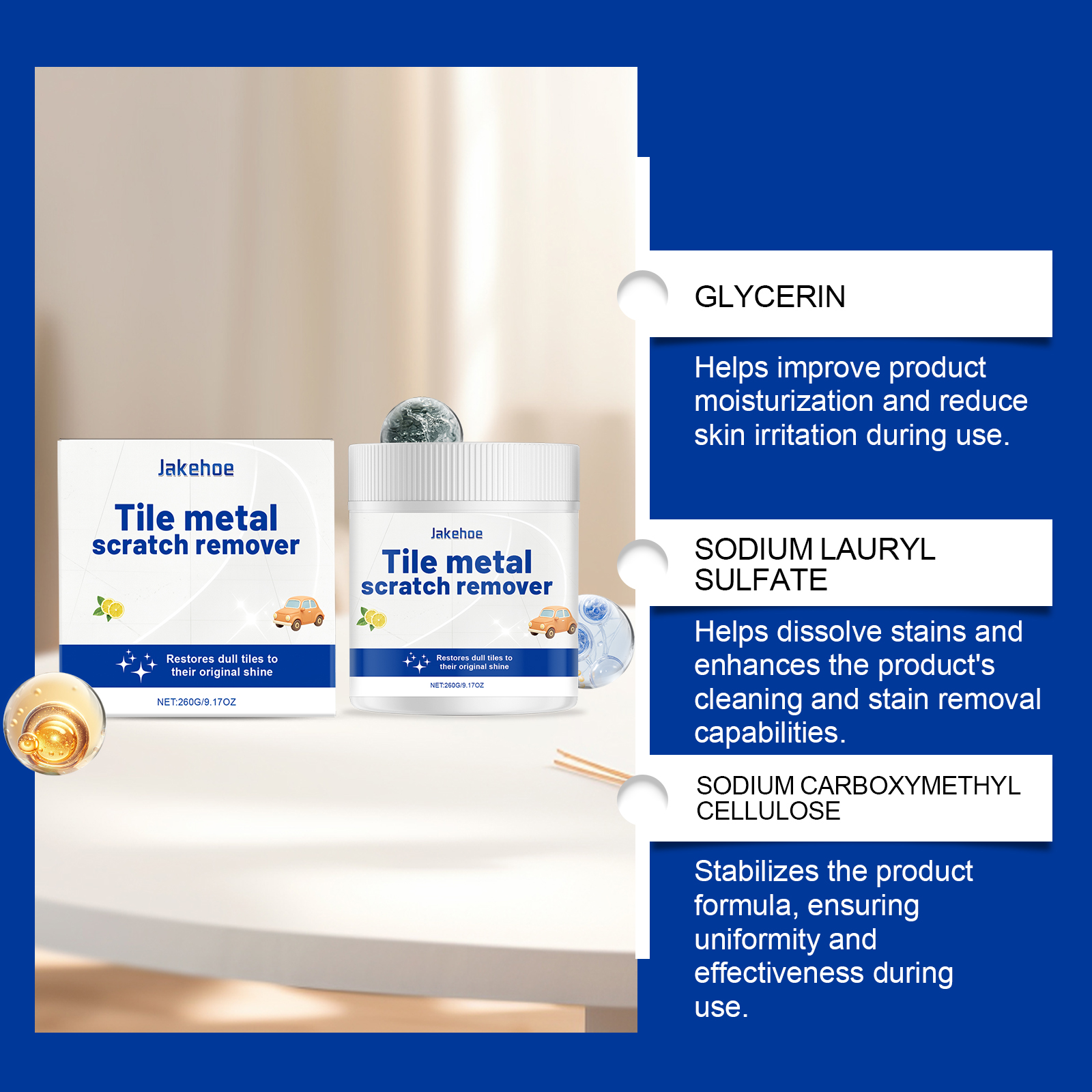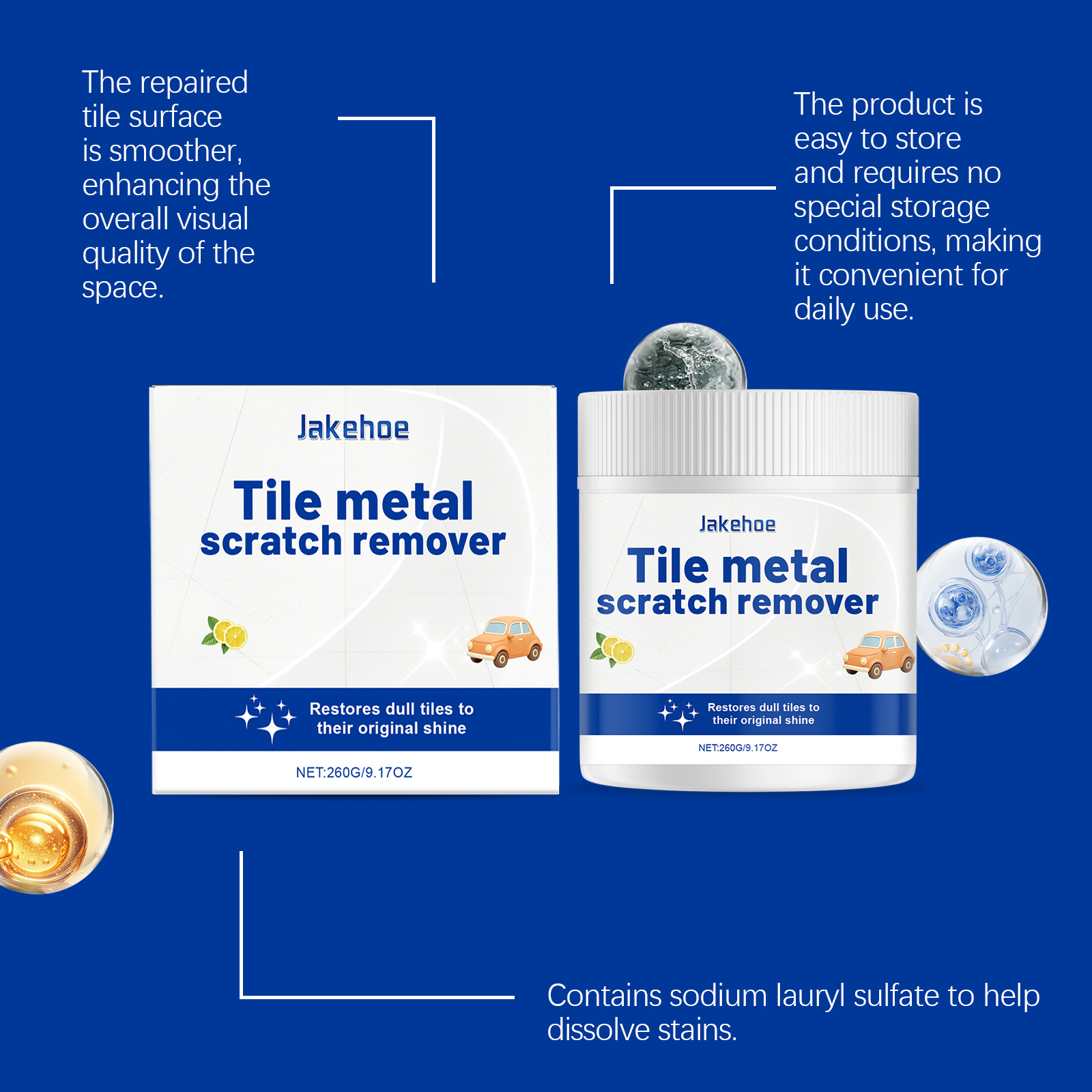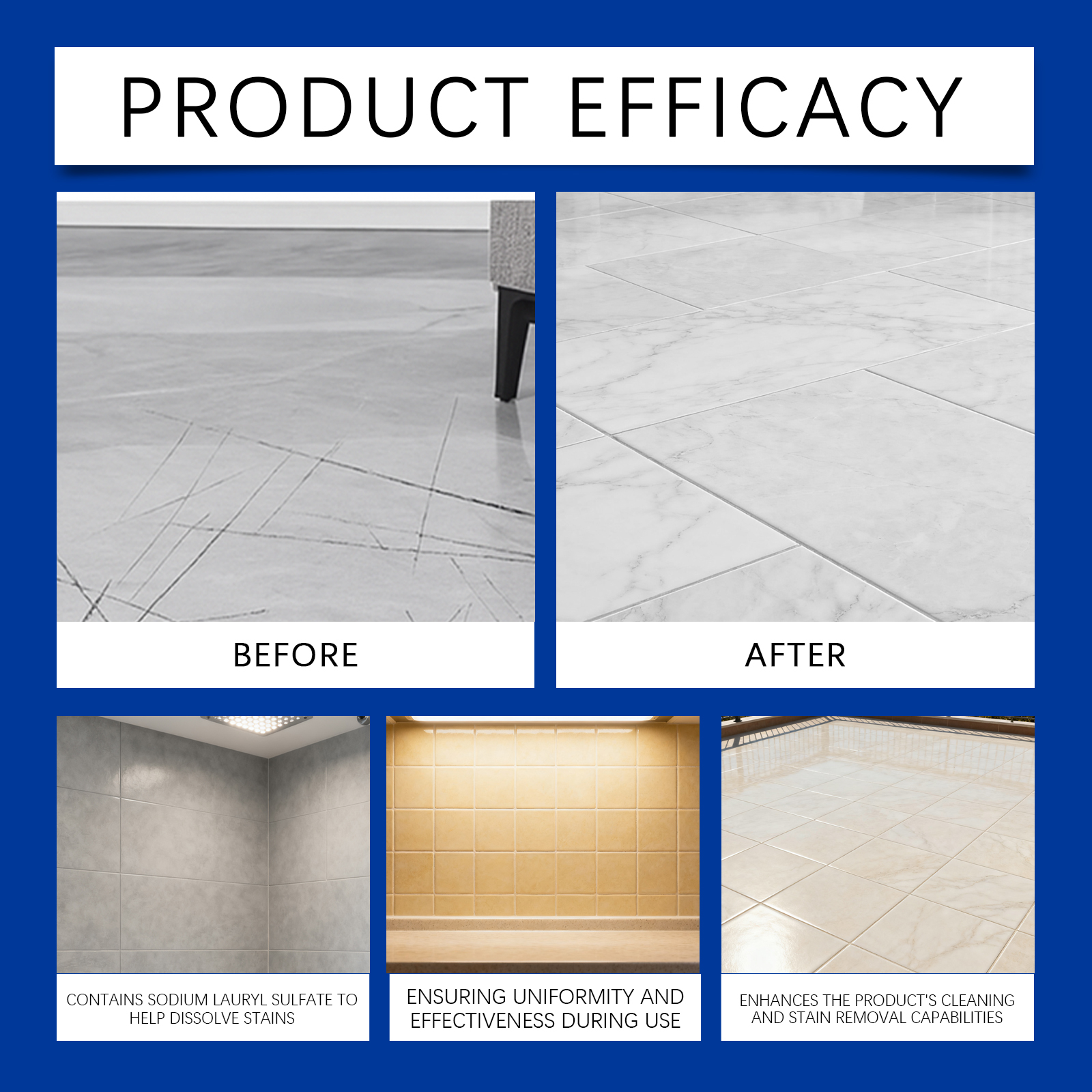 我们的瓷砖划痕清洁剂,由碳酸钙、去离子水精心调配而成。专为可溶解黑色磨损痕迹、锈迹与划痕,无需复杂操作,让暗淡瓷砖恢复原有光泽,表面洁净美观设计。使用方法极为便捷:1.迅速用湿布擦拭表面,以清除附着的灰尘。2.在有划痕的瓷砖上均匀涂抹适量的此产品。3.以圆周运动的方式轻轻揉搓。用毛巾擦掉任何残留物,然后彻底冲洗干净。并且它可以清洁修复过程中不去除瓷砖任何材料,无损基材,仅需轻轻一抹,操作简单高效。