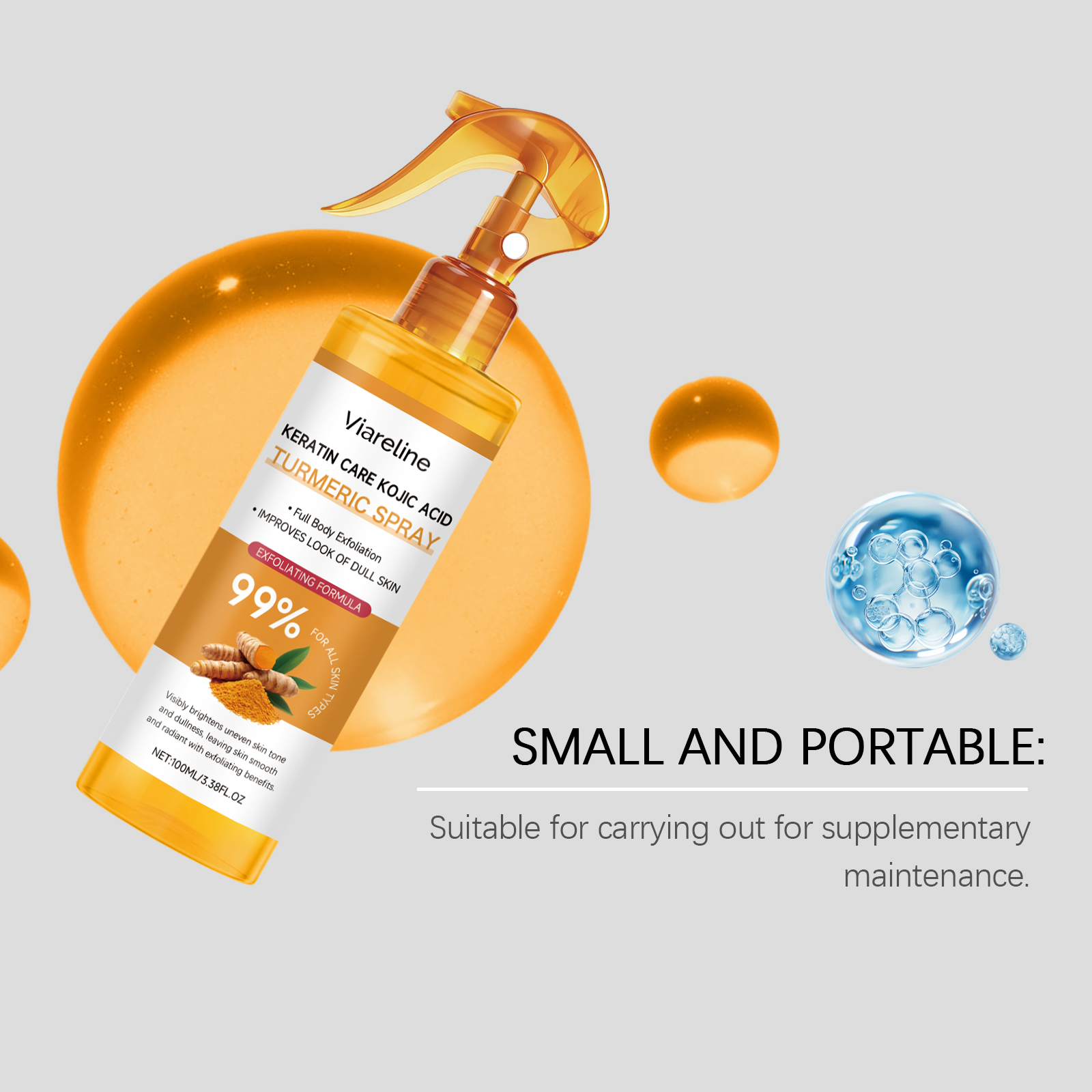 我们的姜黄角质喷雾,由甘油、1,2-己二醇精心调配而成。专为助力调节肤色差异,明显提亮局部暗沉区域,让肤色更显均匀,针对性改善肌肤无光泽问题,通过温和作用减少暗沉感,逐步呈现透亮肤质设计。使用方法极为便捷:1.彻底清洁并擦干皮肤。2.将适量本产品均匀喷洒在背部、手部、足部等身体肌肤上。3. 轻柔打圈按摩,帮助软化角质。4. 待片刻后,用温水冲洗干净。并且它可以可轻柔去除老废角质,减少粗糙触感,让肌肤表面更显细腻光滑,兼顾去角质功效与温和性,适配多数肤质,在改善肤质的同时减少肌肤刺激。