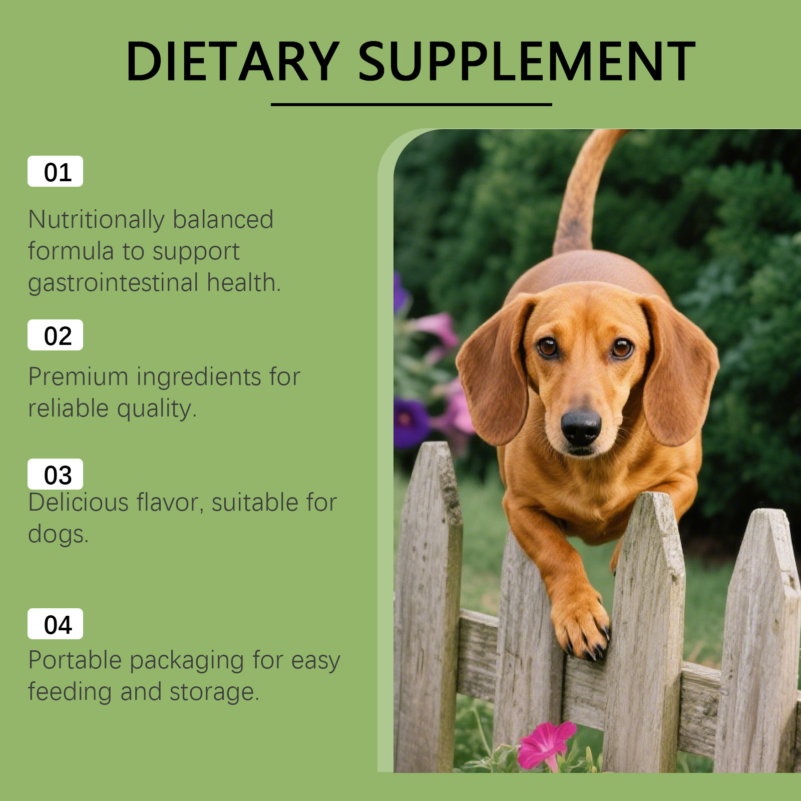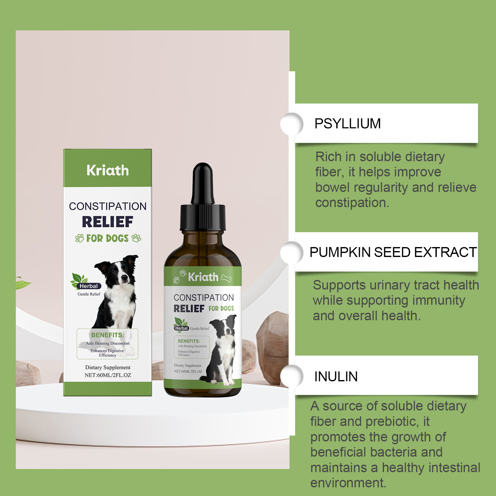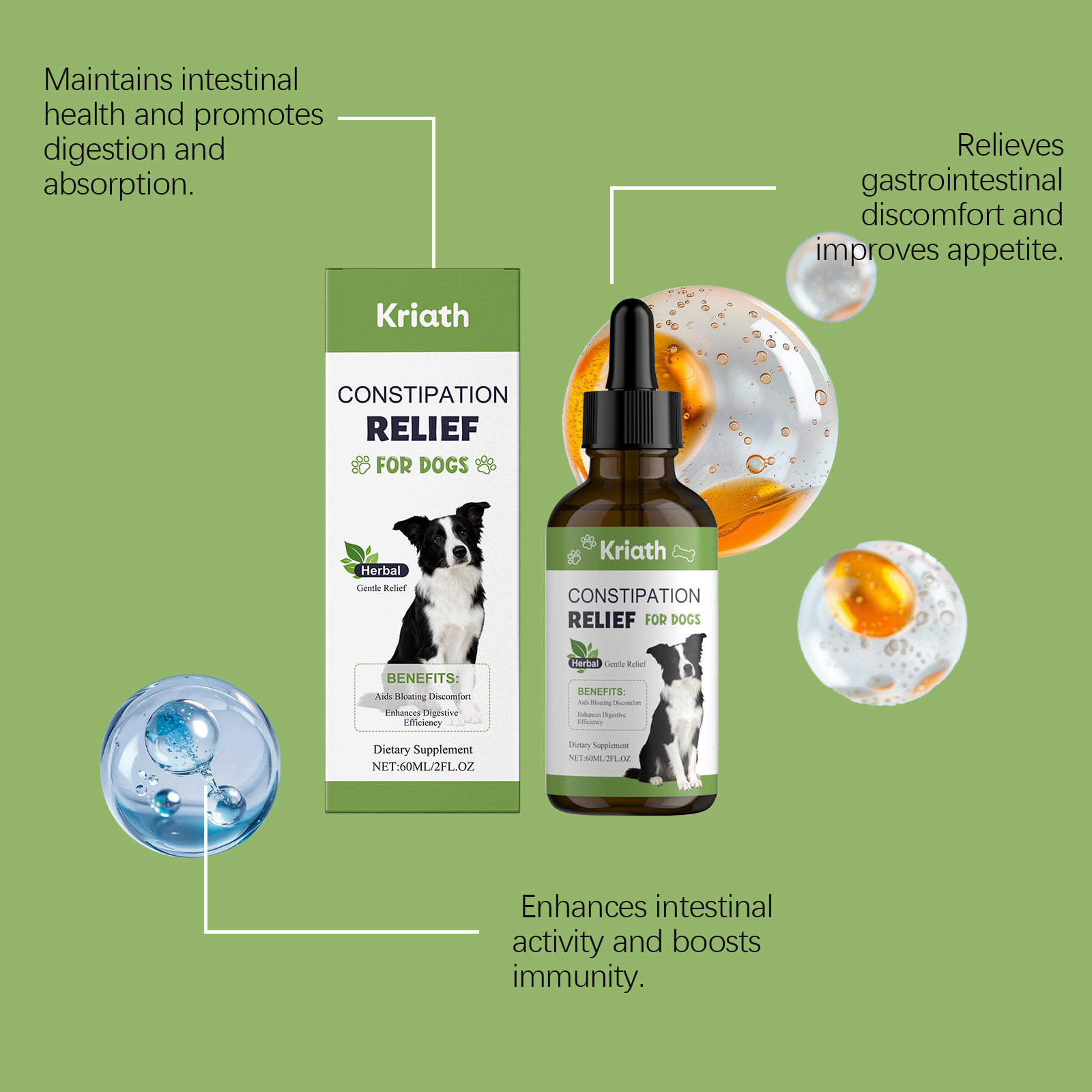 我们的狗狗营养补充液,由洋车前子、南瓜籽提取物精心调配而成。专为促进消化系统健康和肠道功能,平衡肠道菌群设计。使用方法极为便捷:喂养方式:仅限狗狗使用,可直接喂食或与食物混合喂食。使用方法:5磅以下:每份0.5毫升;5-15磅:每份1毫升;15-25磅:每份2毫升;25-35磅:每份3毫升;35磅以上:每份4毫升。并且它可以促进规律排便和温和消化,提供抗氧化支持并增强免疫力,促进整体营养吸收和活力。