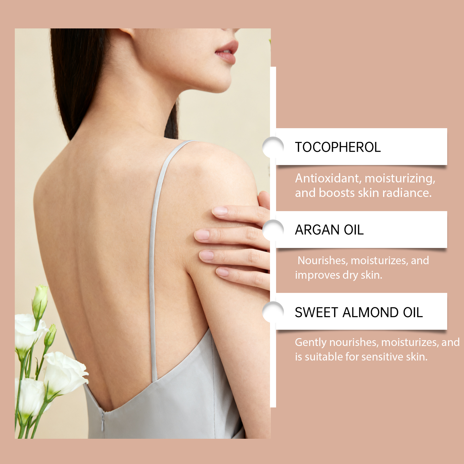 我们的柔滑身体精油,由摩洛哥坚果油、甜杏仁油精心调配而成。专为深层滋养肌肤并补充必需营养设计。使用方法极为便捷:1.清洁并擦干皮肤。2.涂抹适量并均匀涂抹在身体皮肤上。3.轻轻按摩,以促进吸收。并且温和不刺激,适合所有肤质。