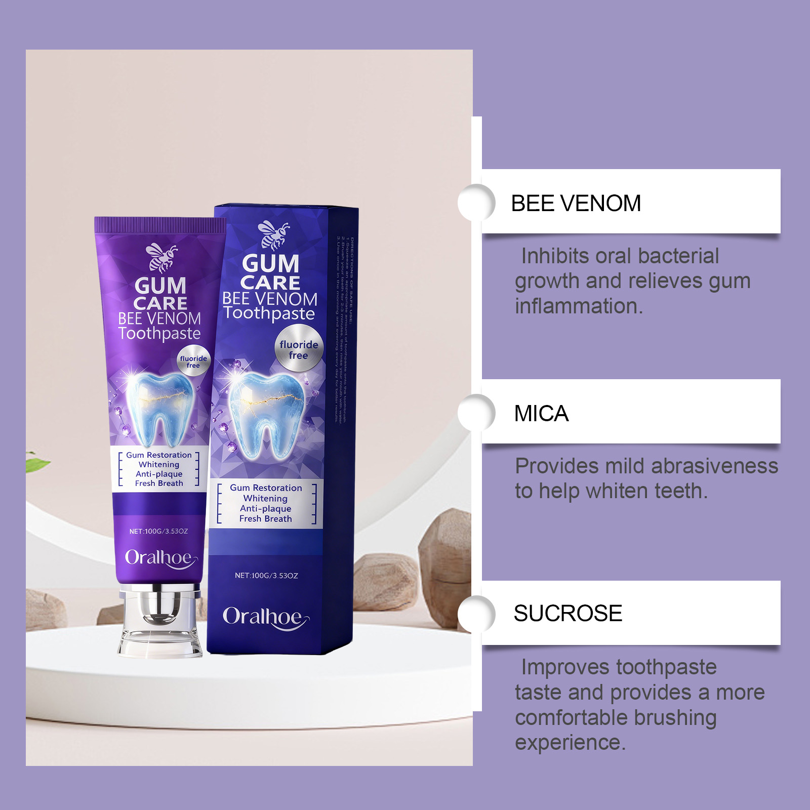我们的蜂毒护理牙膏,由蔗糖、月桂醇硫酸酯钠精心调配而成。专为美白牙齿,绽放洁白笑容,增添自信光彩,清新口气,带来持久薄荷清爽感设计。使用方法极为便捷:1.将适量的牙膏挤到牙刷上。2.刷牙2-3分钟,然后用水漱口。3.每天早晚各用一次,以获得更好的效果。并且它可以助力维持牙龈健康,支持整体口腔良好状态,帮助改善牙釉质状况,坚固牙齿。
