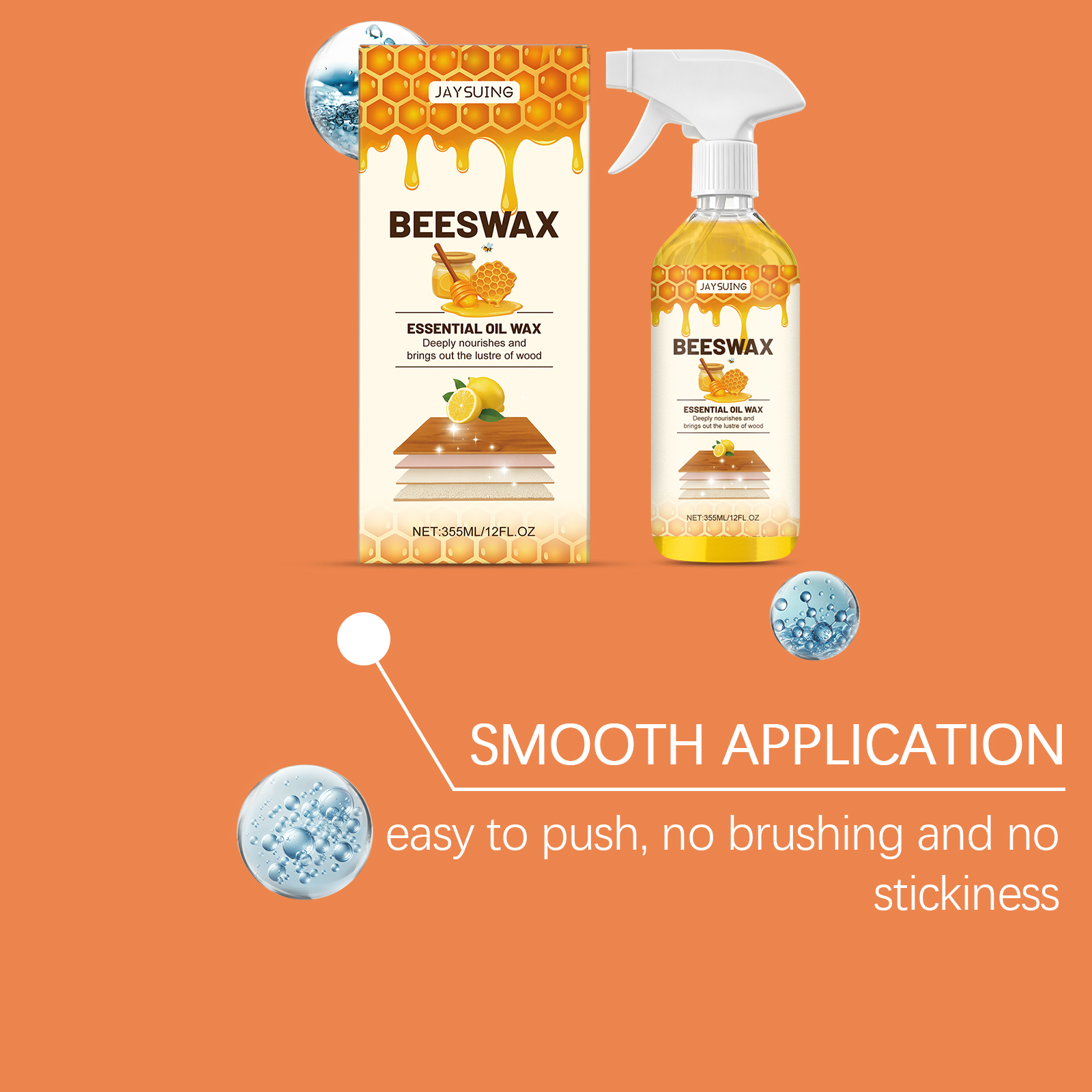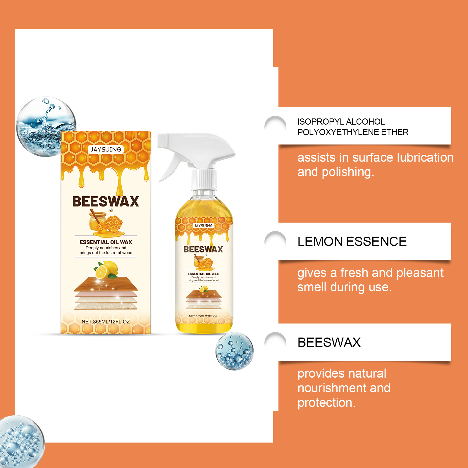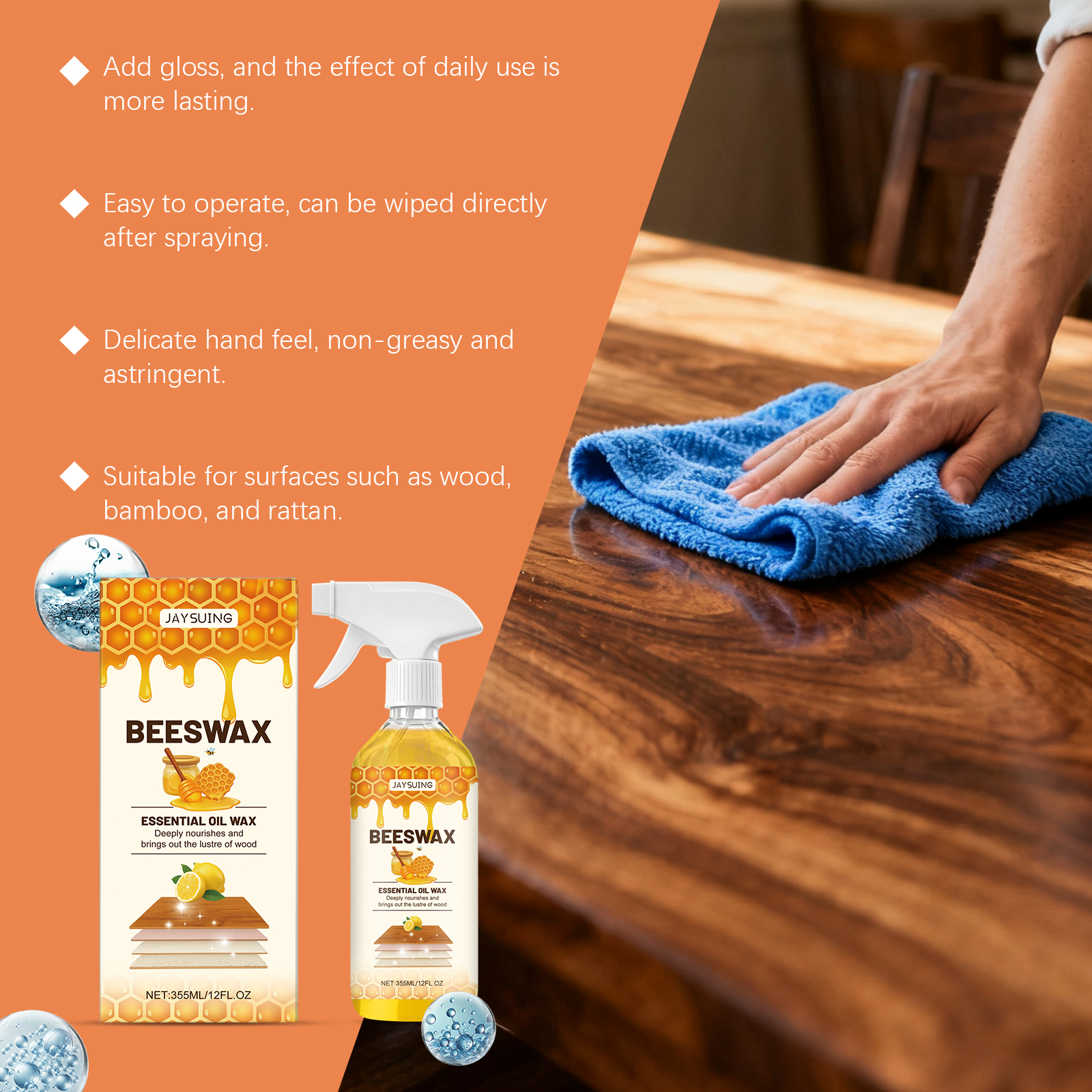 我们的木制家具抛光喷雾,由去离子水、异构醇聚氧乙烯醚精心调配而成。专为兼具多重功效,清洁同时抛光维护,让家具焕发持久光彩设计。使用方法极为便捷:1. 清洁家具表面。2. 将本品均匀喷洒在家具表面。3.沿着木纹方向,用海绵轻轻均匀打圈擦拭家具。4.静置3分钟充分反应,用毛巾抛光至透亮。并且它适用材质广泛,木材皮革不锈钢等皆能轻松应对,清洁无忧,一次喷洒操作,无缝实现清洁抛光维护,省时省力超高效。