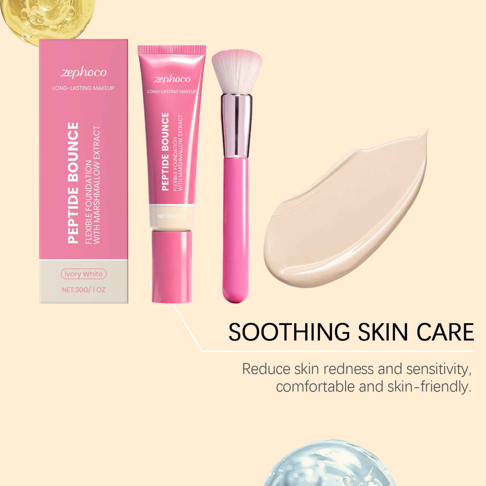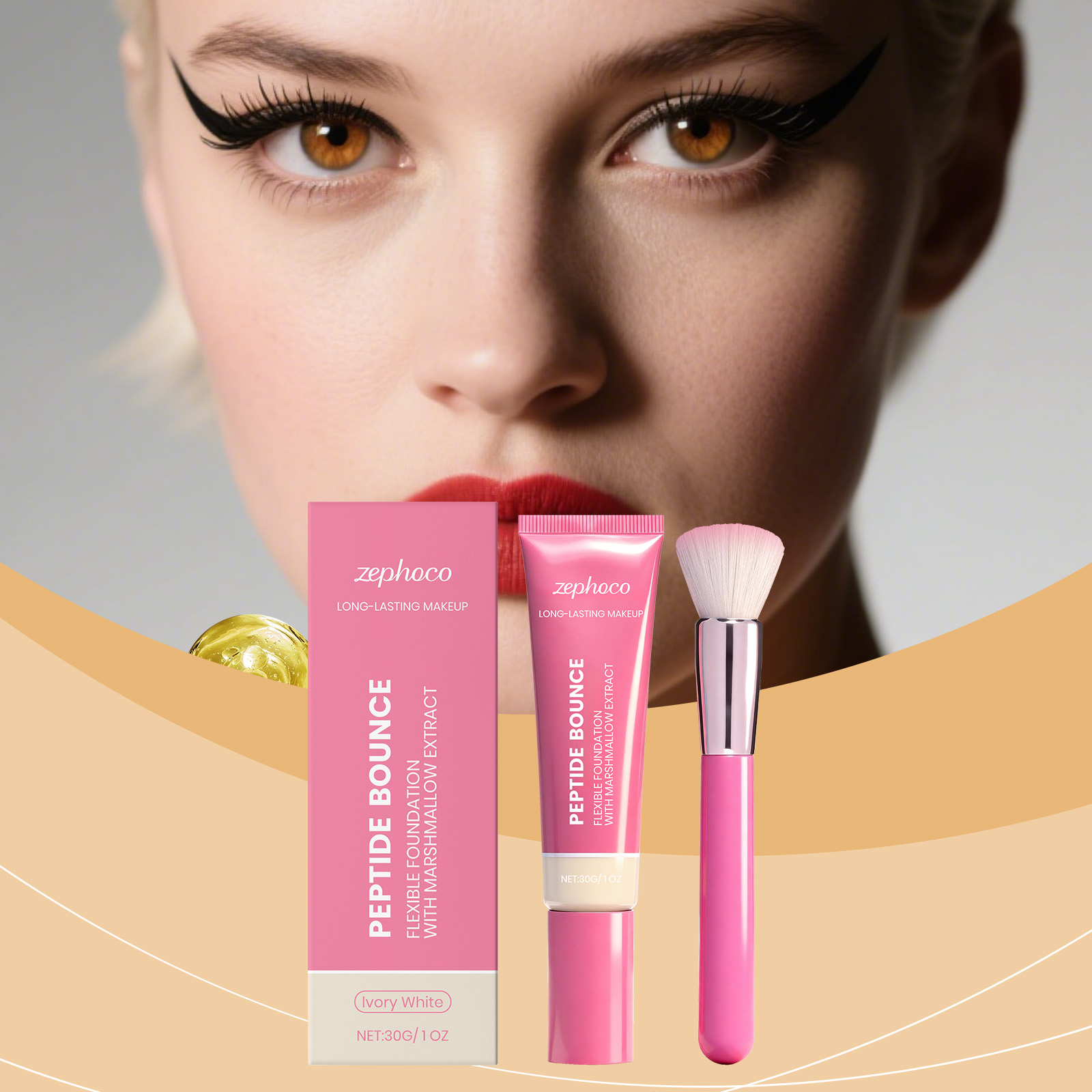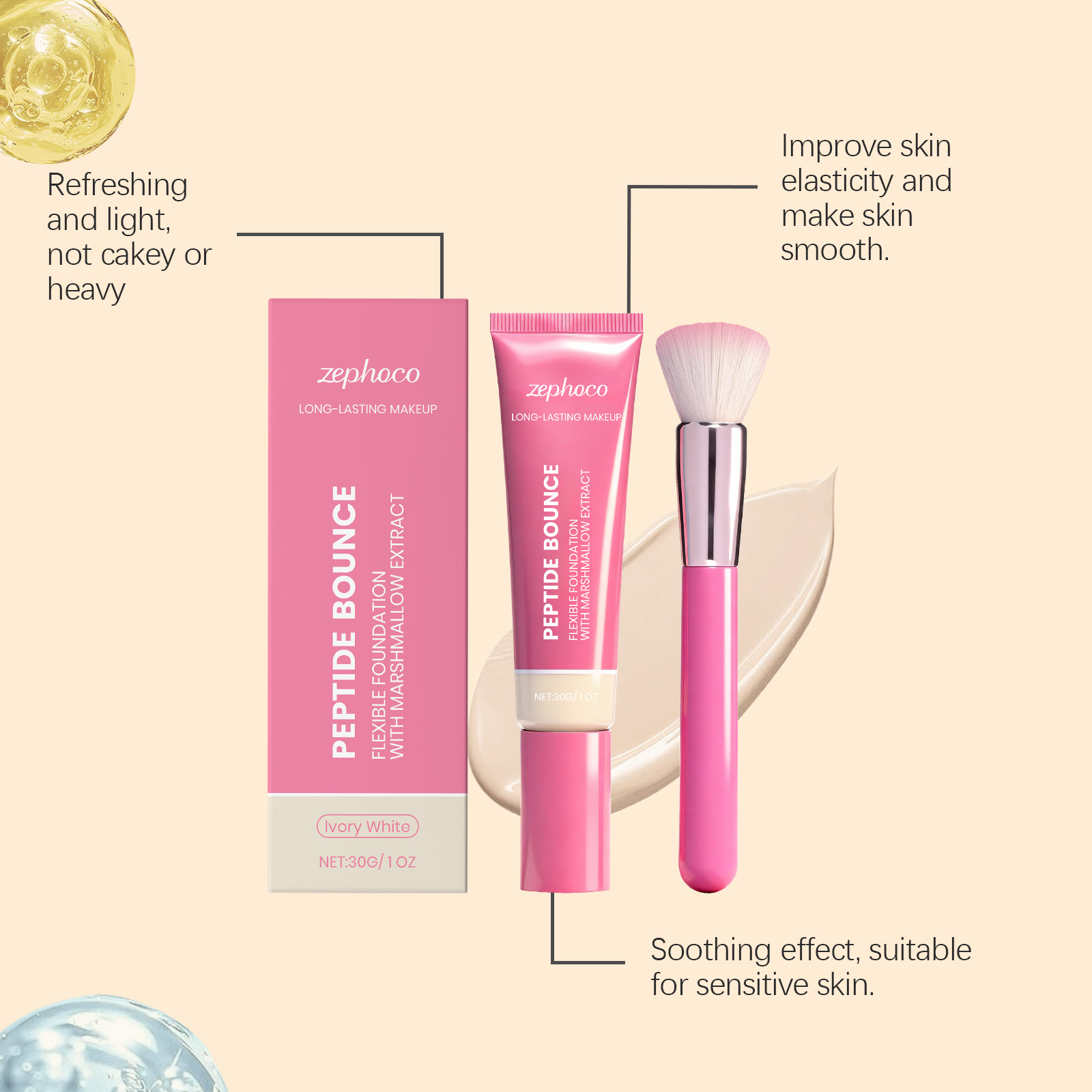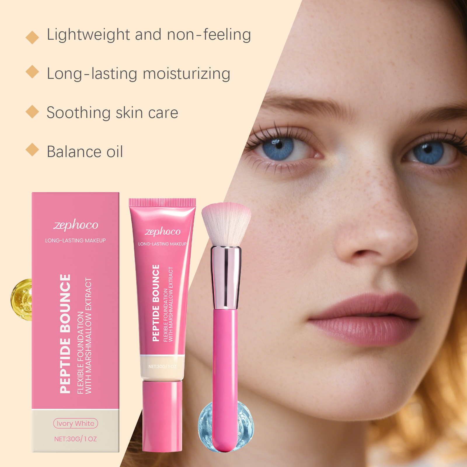 我们的轻盈持妆粉底液(象牙白),由聚二甲基硅氧烷、二氧化钛精心调配而成。专为有效遮盖暗沉、痘印等瑕疵,均匀肤色,同时滋养肌肤、修护肌肤屏障,持妆控油的同时遮盖泛黄、斑点等面部瑕疵,打造细腻光滑肤感设计。使用方法极为便捷:1.清洁面部肌肤并保持干燥。2.取适量本品在手上,用粉底刷涂抹在面部需要遮瑕的肌肤上,轻轻拍打直至其均匀覆盖面部。并且它可以有效遮盖多种面部瑕疵以均匀肤色,持妆控油不脱妆,兼具滋养肌肤与抵御氧化的作用,持妆控油且打造细腻光滑肤感,同时修护肌肤屏障、抵御氧化。
