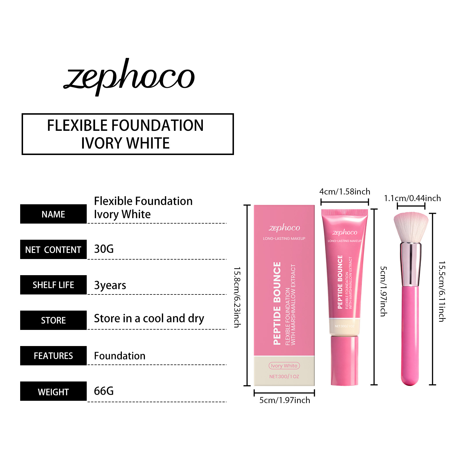 轻盈持妆粉底液:4*2.5*13.5cm,粉底刷:1.1*15.5cm