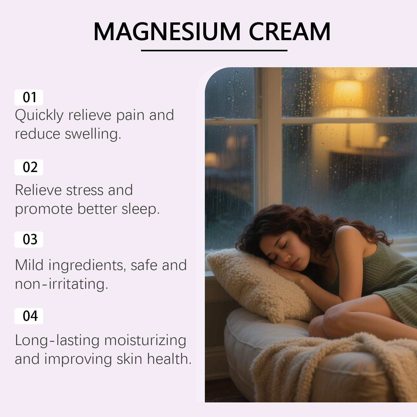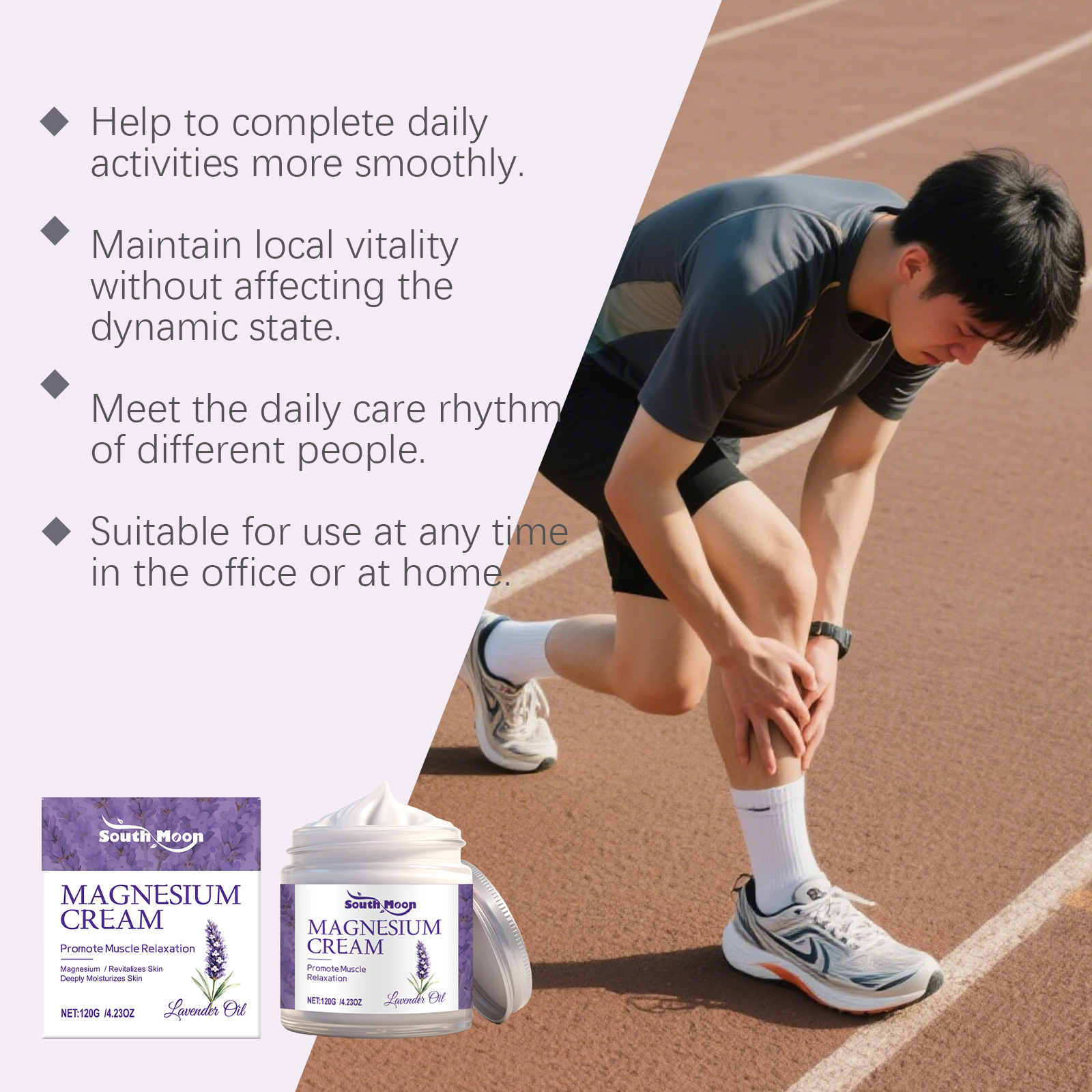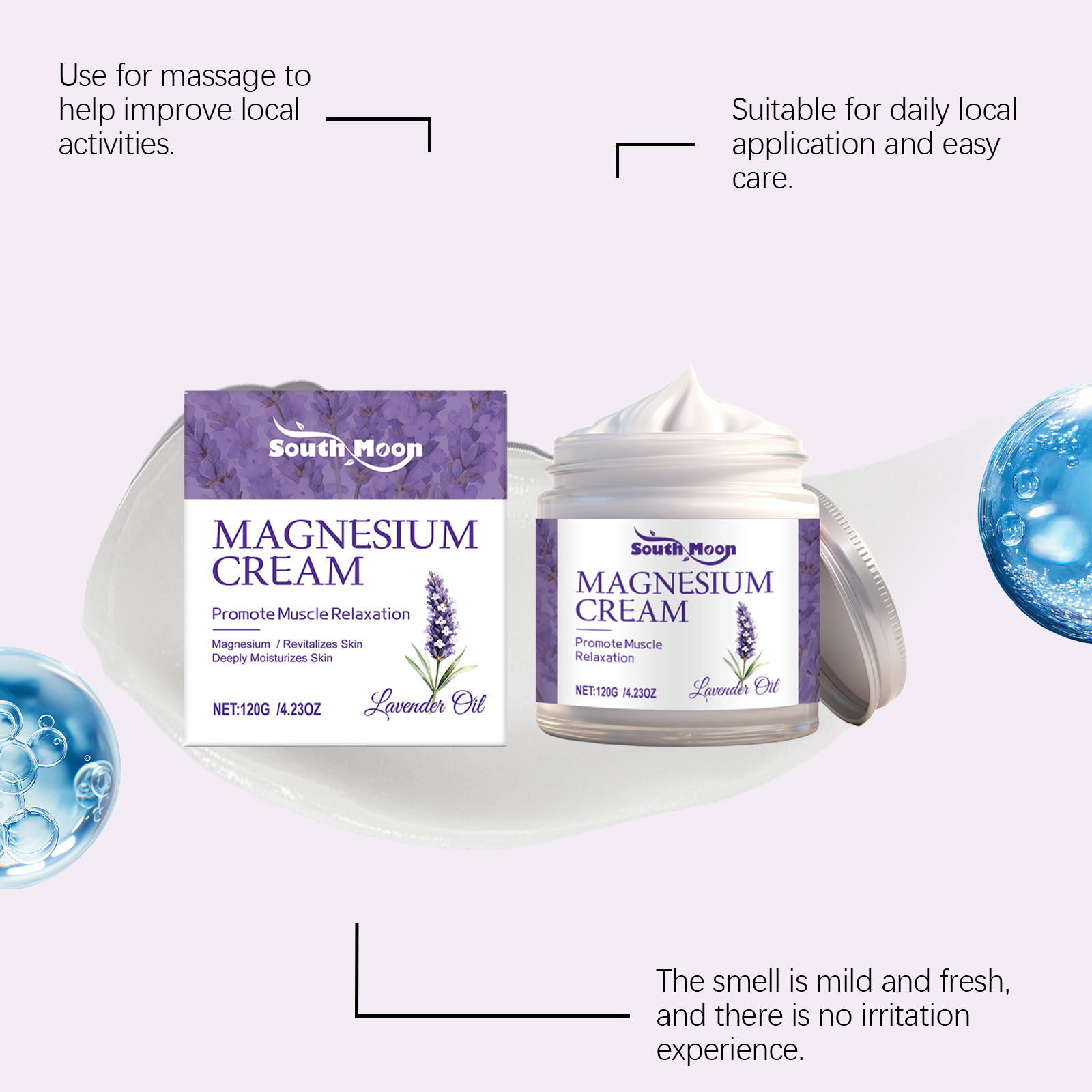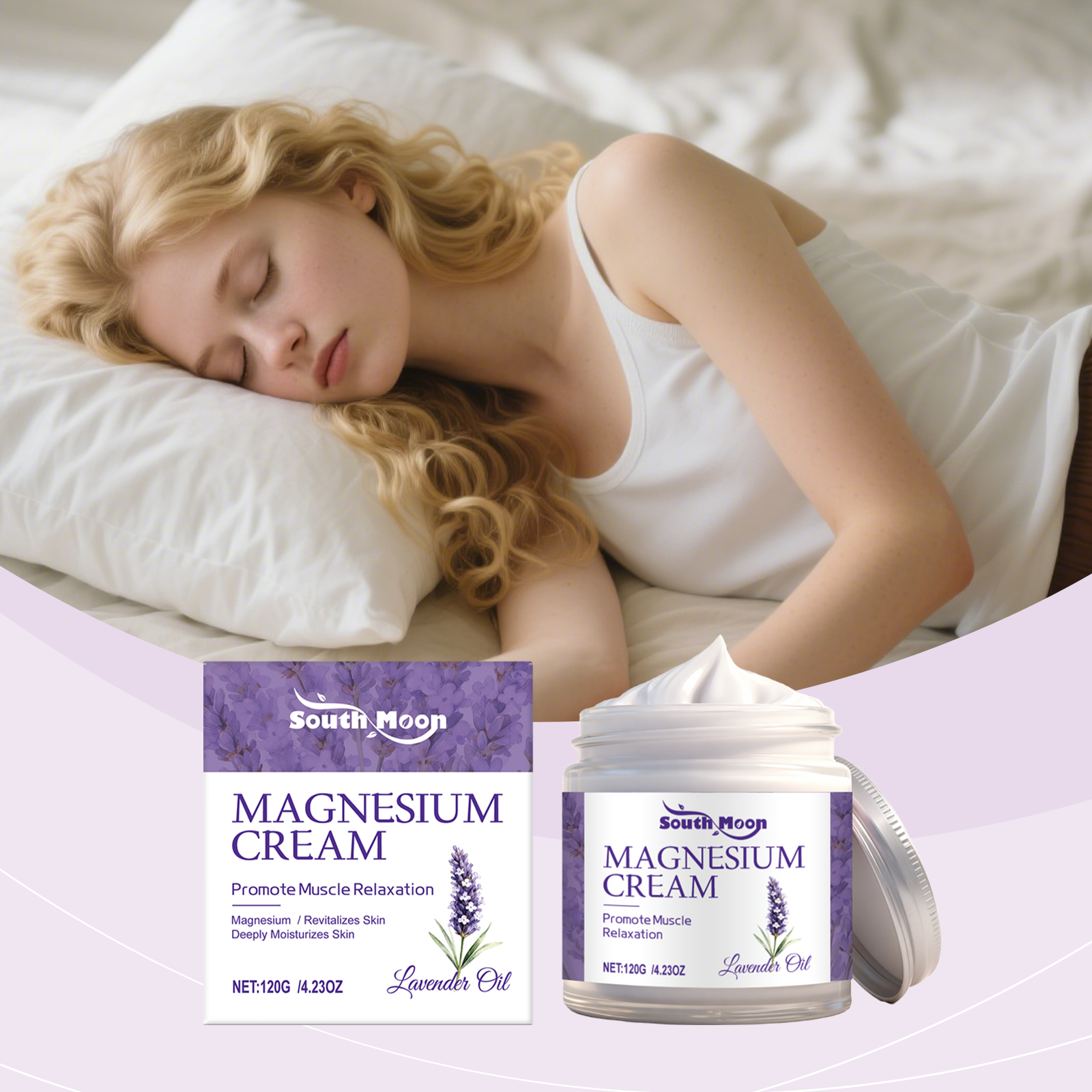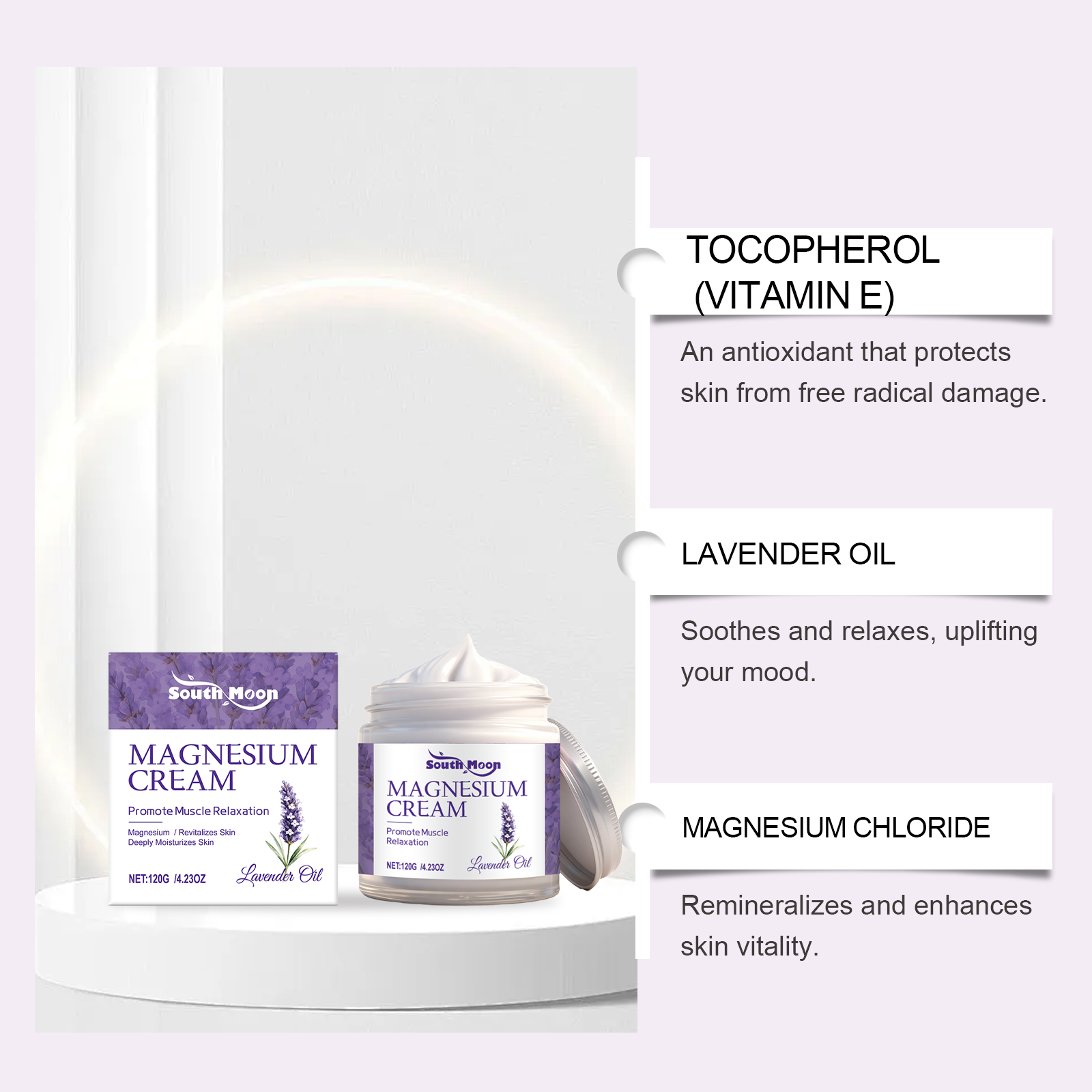 我们的薰衣草镁润护霜,由甘油、矿油、甘油硬脂酸酯精心调配而成。专为镇静神经系统改善睡眠质量设计。使用方法极为便捷:清洁皮肤并干燥,取适量本品涂抹在疼痛患处并轻轻按摩促进吸收。并且它可以缓解肌肉痉挛僵硬和酸痛;深层滋润肌肤,促进修复皮肤屏障。