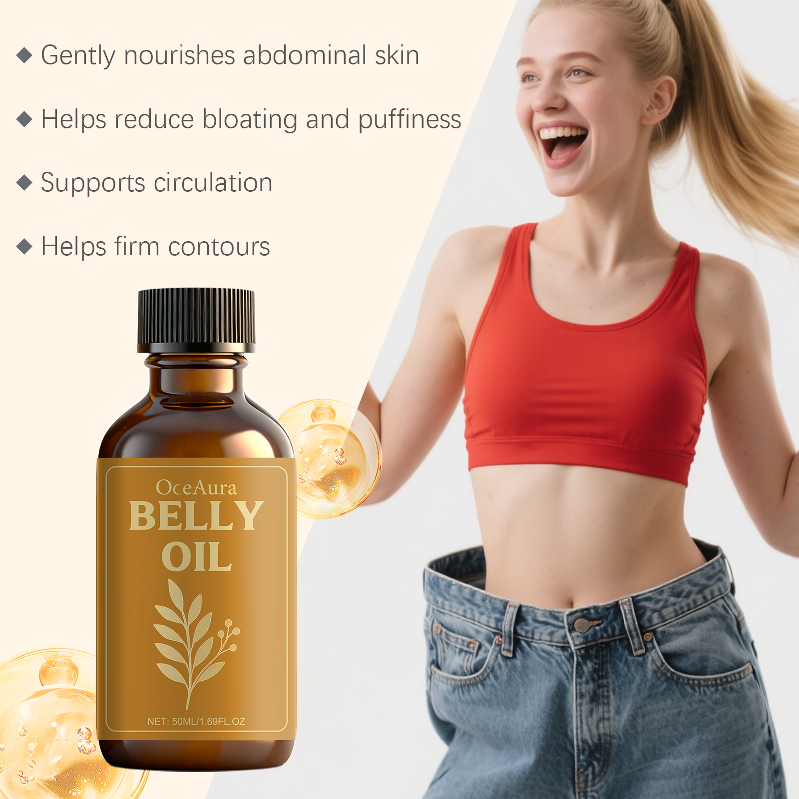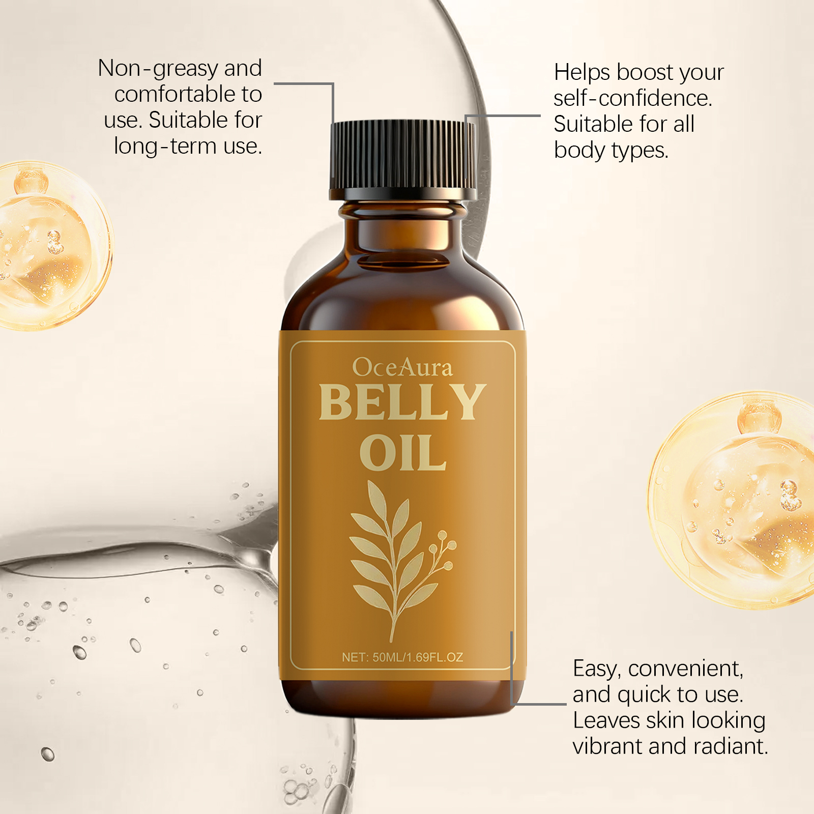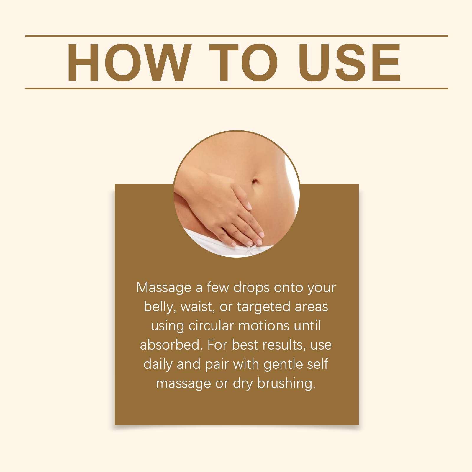 我们的腹部温和护理油,由胡椒籽提取物、生姜提取物精心调配而成。专为促进皮肤新陈代谢设计。使用方法极为便捷:将几滴按摩油涂抹在腹部、腰部或目标区域,用打圈的方式按摩至吸收。为了达到最佳效果,请每天使用,并配合温和的自我按摩或干刷。并且随时随地轻松使用。