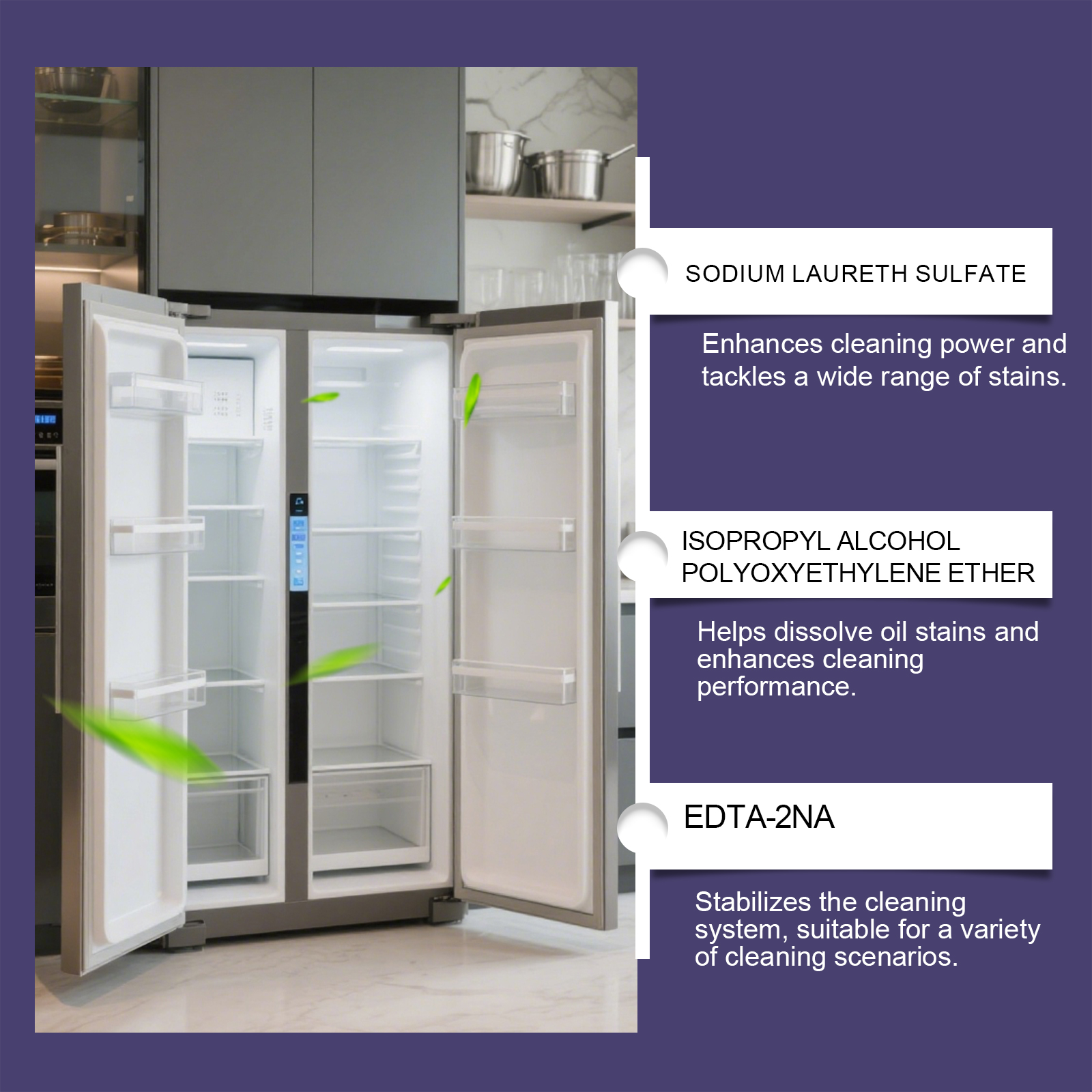我们的冰箱清洁剂,由甲基异噻唑啉酮、香精精心调配而成。专为去除粘性残留物、干涸食物和油腻指纹设计。使用方法极为便捷:将喷嘴转到喷雾模式,打开冰箱,并直接冲洗要清洁表面的前20厘米。让它静置3-5分钟。然后用毛巾擦干净。并且有助于溶解油渍并提高清洁性能。