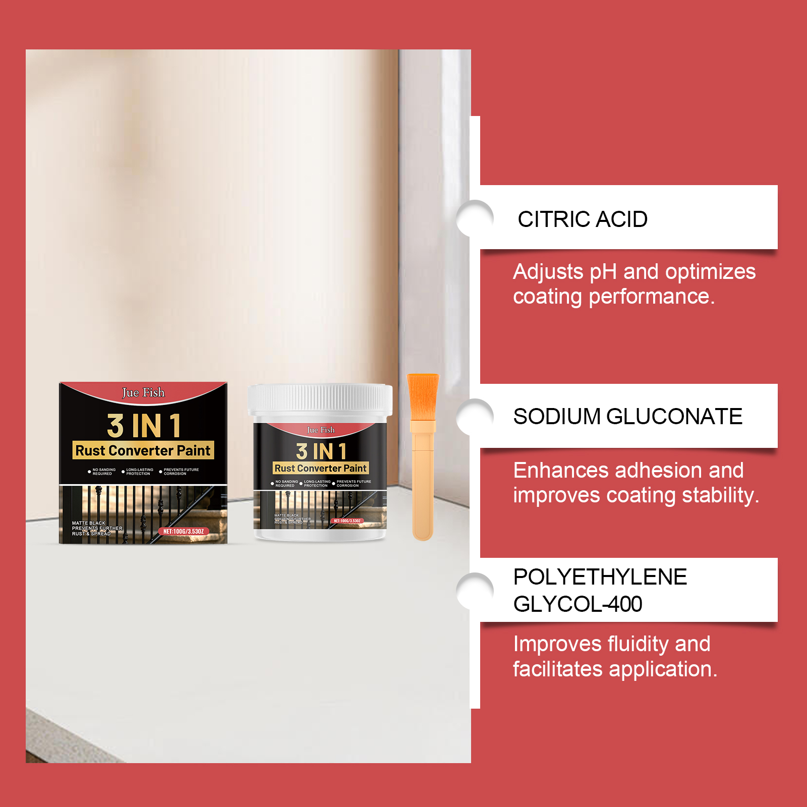 我们的防锈底漆,由葡萄糖酸钠、聚乙二醇-400精心调配而成。专为即时转化,形成黑色聚合物保护层设计。使用方法极为便捷:清洁表面并确保其无灰尘颗粒。用刷子将防锈漆均匀地涂在表面上自然晾干。并且耐候性好,适应多种环境。
