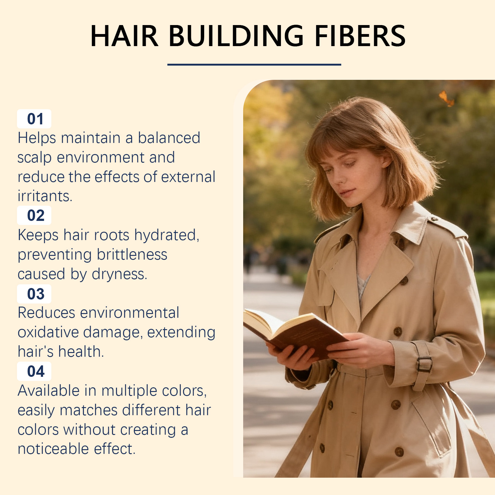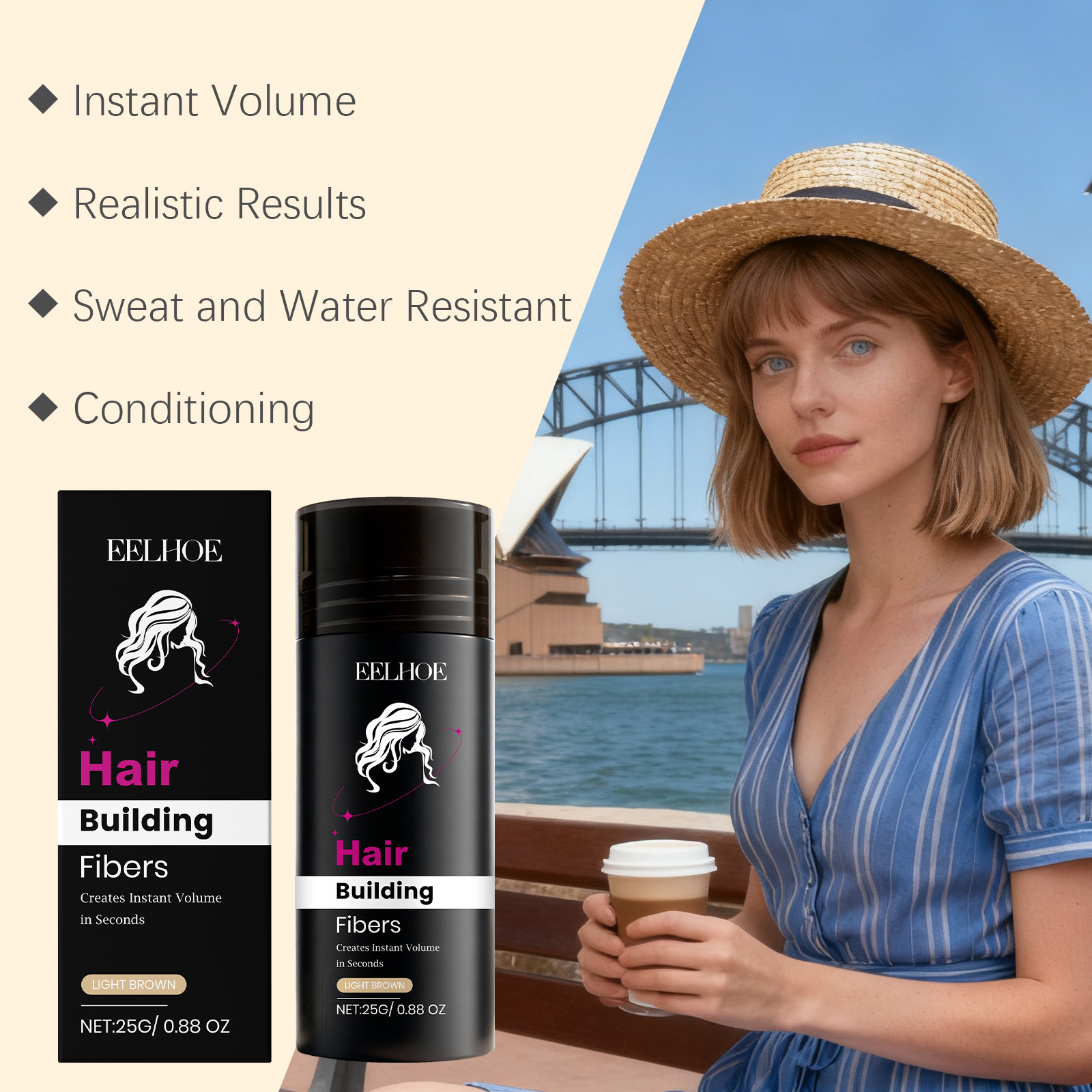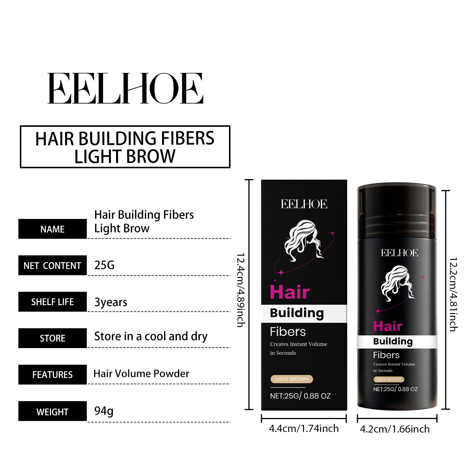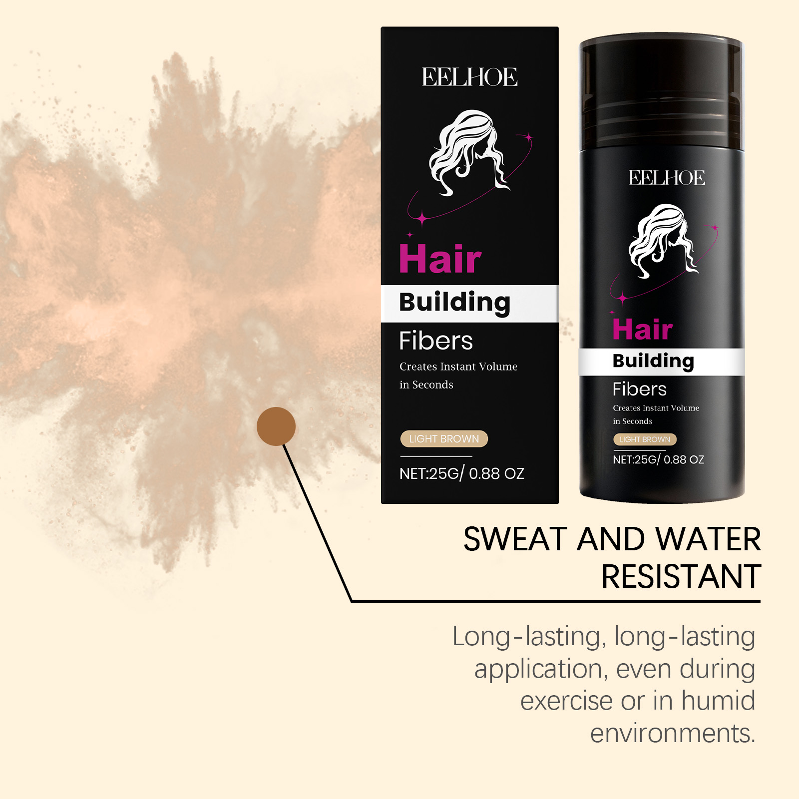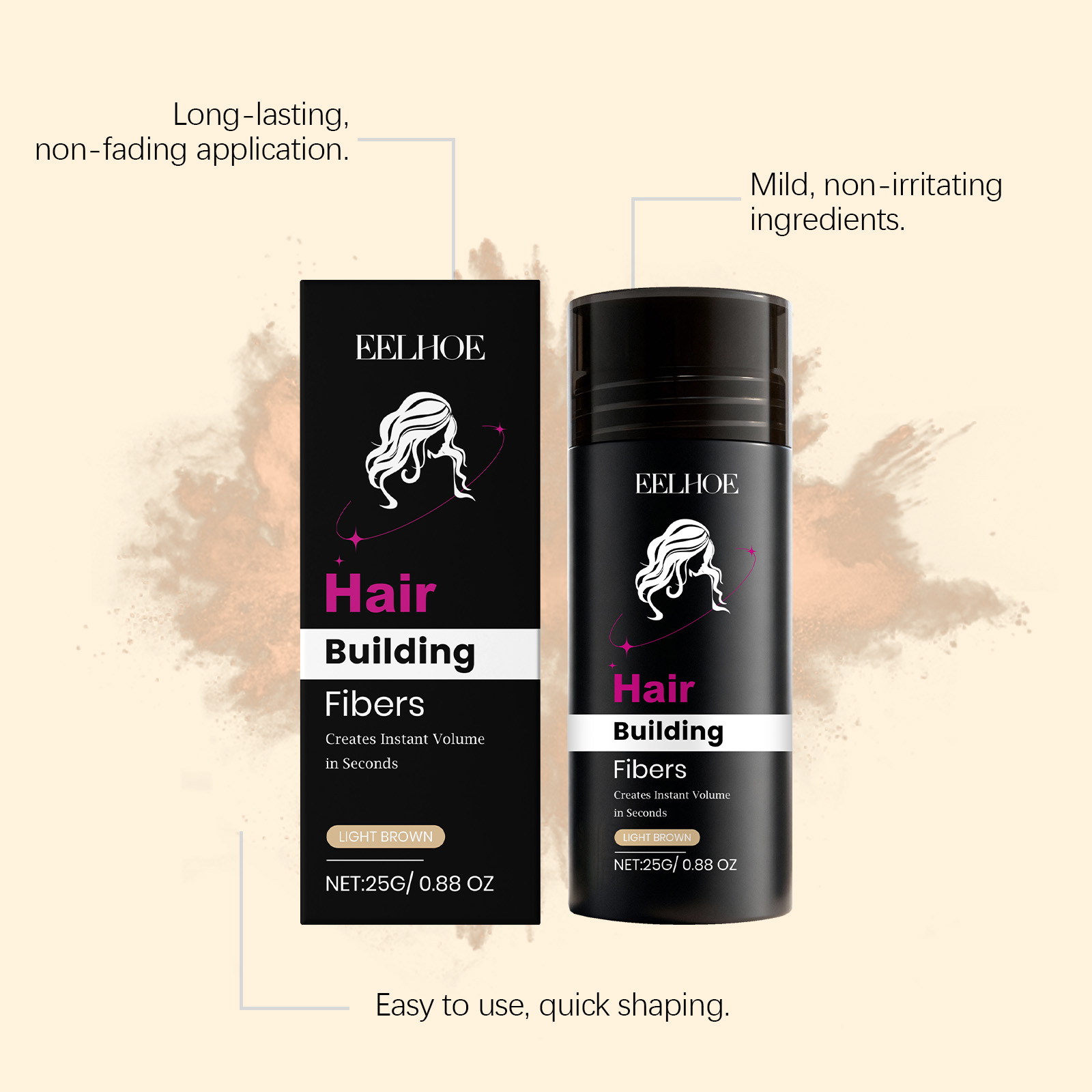 我们的浅棕色角蛋白修饰粉,由碳、滑石粉精心调配而成。专为填补稀疏区域,视觉上增加发量密度,打造丰盈效果设计。使用方法极为便捷:1.将瓶子倾斜约45度,并将其放在稀疏区域一英寸处。轻轻摇晃或撒在稀疏区域上。2.用手或梳子调整纤维以增加或减少发量。拍打你的头发和纤维,直到达到理想效果。3.对于前额发际线,将手或发际线优化器放在发际线下方,以避免纤维进入脸部和眼睛。4.像往常一样造型,享受你的浓密头发。并且它可以持久贴合不脱妆,即使运动或潮湿环境也能保持妆效。