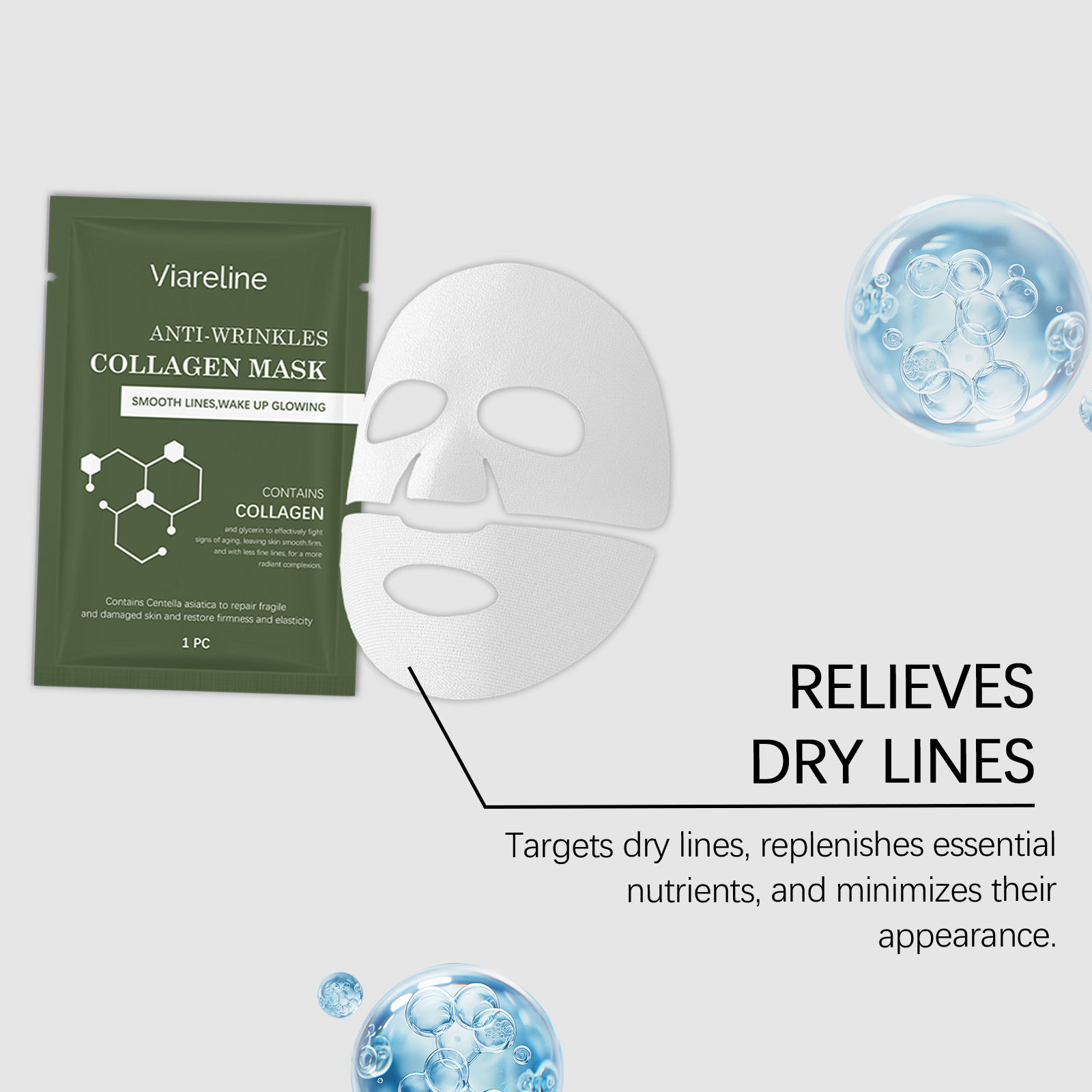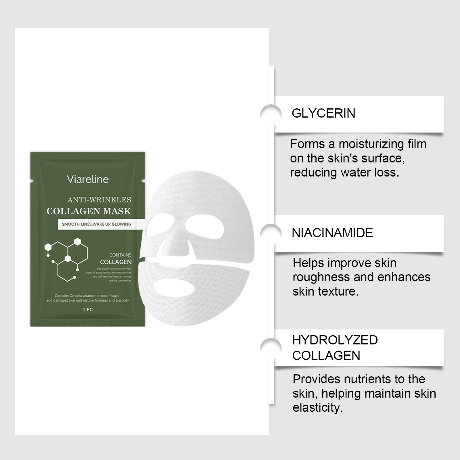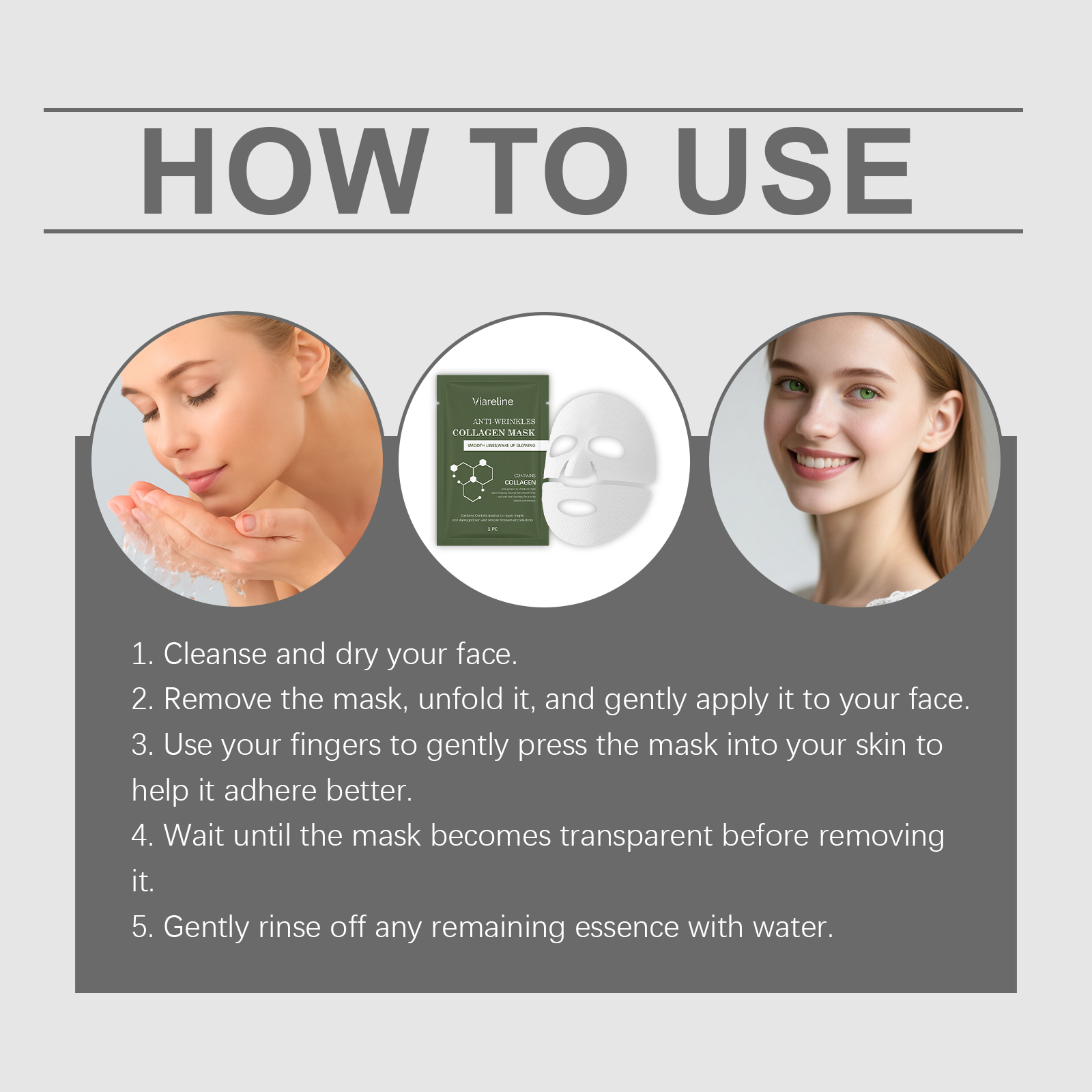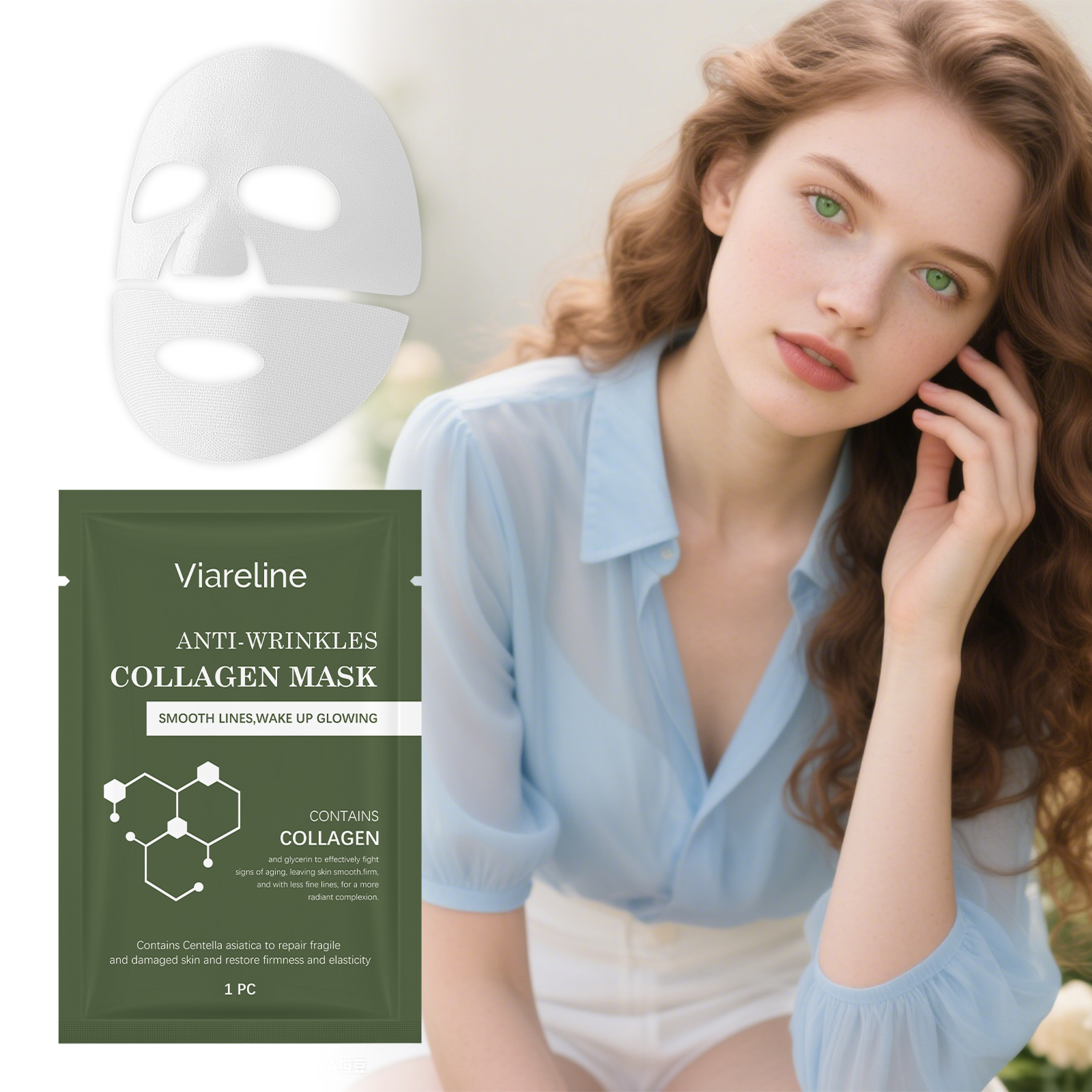 我们的胶原蛋白面膜,由透明质酸、水解胶原蛋白精心调配而成。专为深层滋养,使皮肤保湿和饱满设计。使用方法极为便捷:1.清洁并擦干你的脸。2.取下面膜,展开并轻轻敷在脸上。3.用手指轻轻按压面膜,使其更好地贴合皮肤。4.等待面膜变透明后再将其取下。5.用清水轻轻冲洗掉剩余的精华液。并且可以改善弹性并恢复皮肤的紧致度。