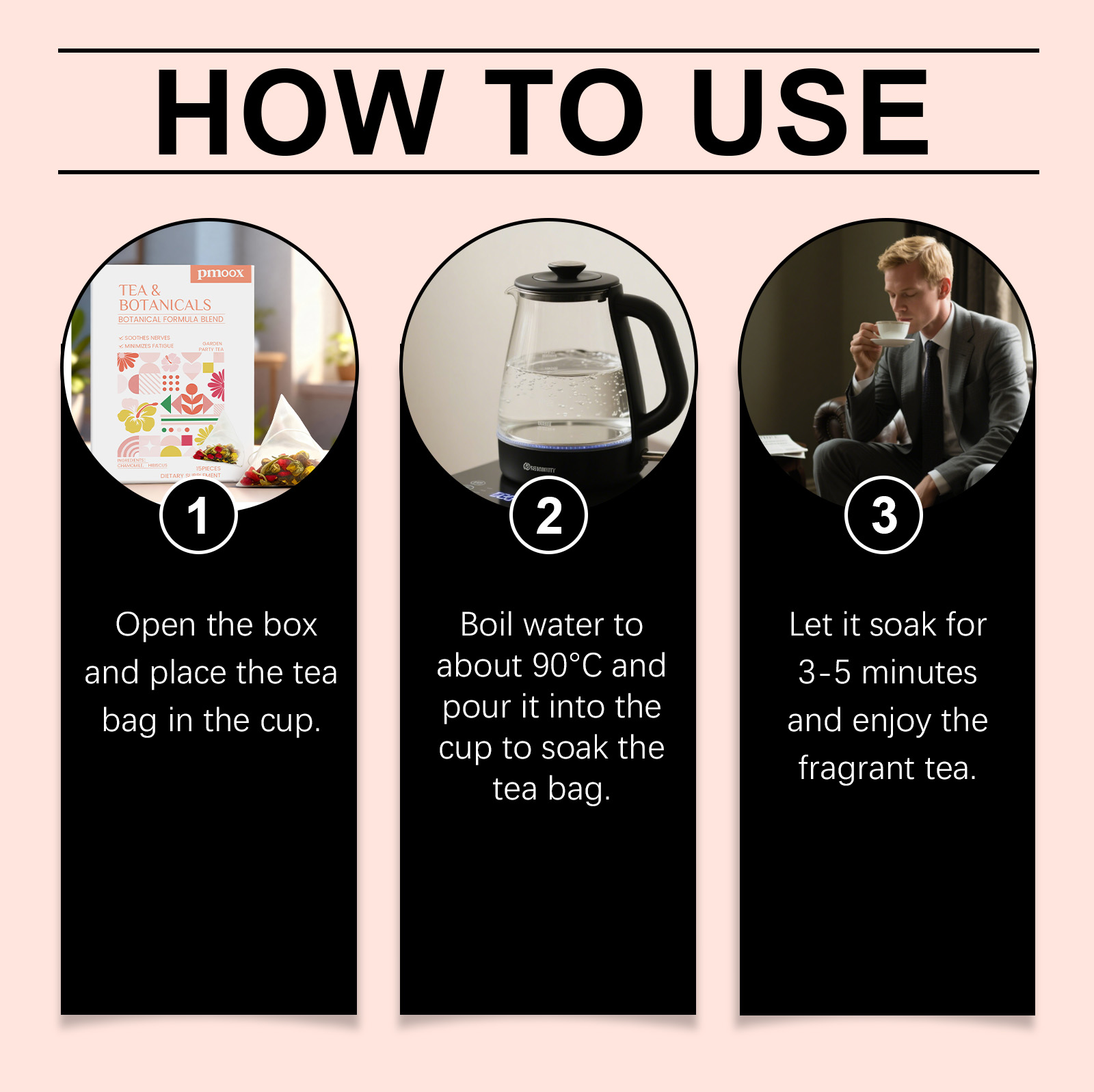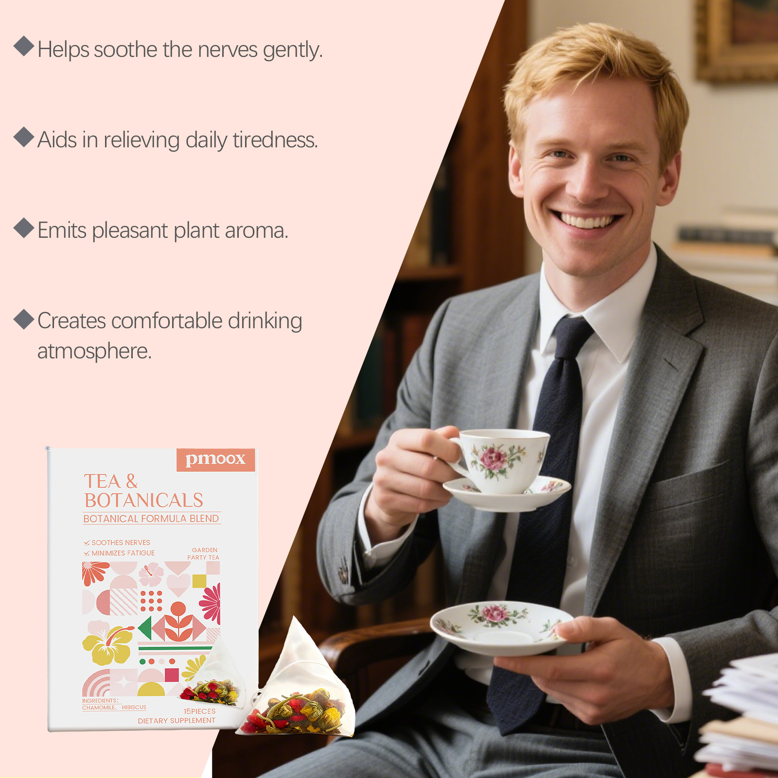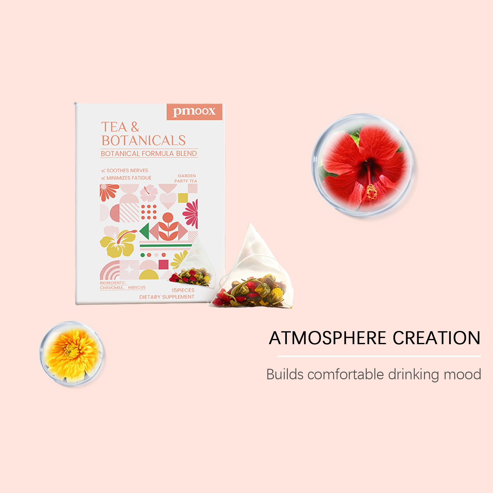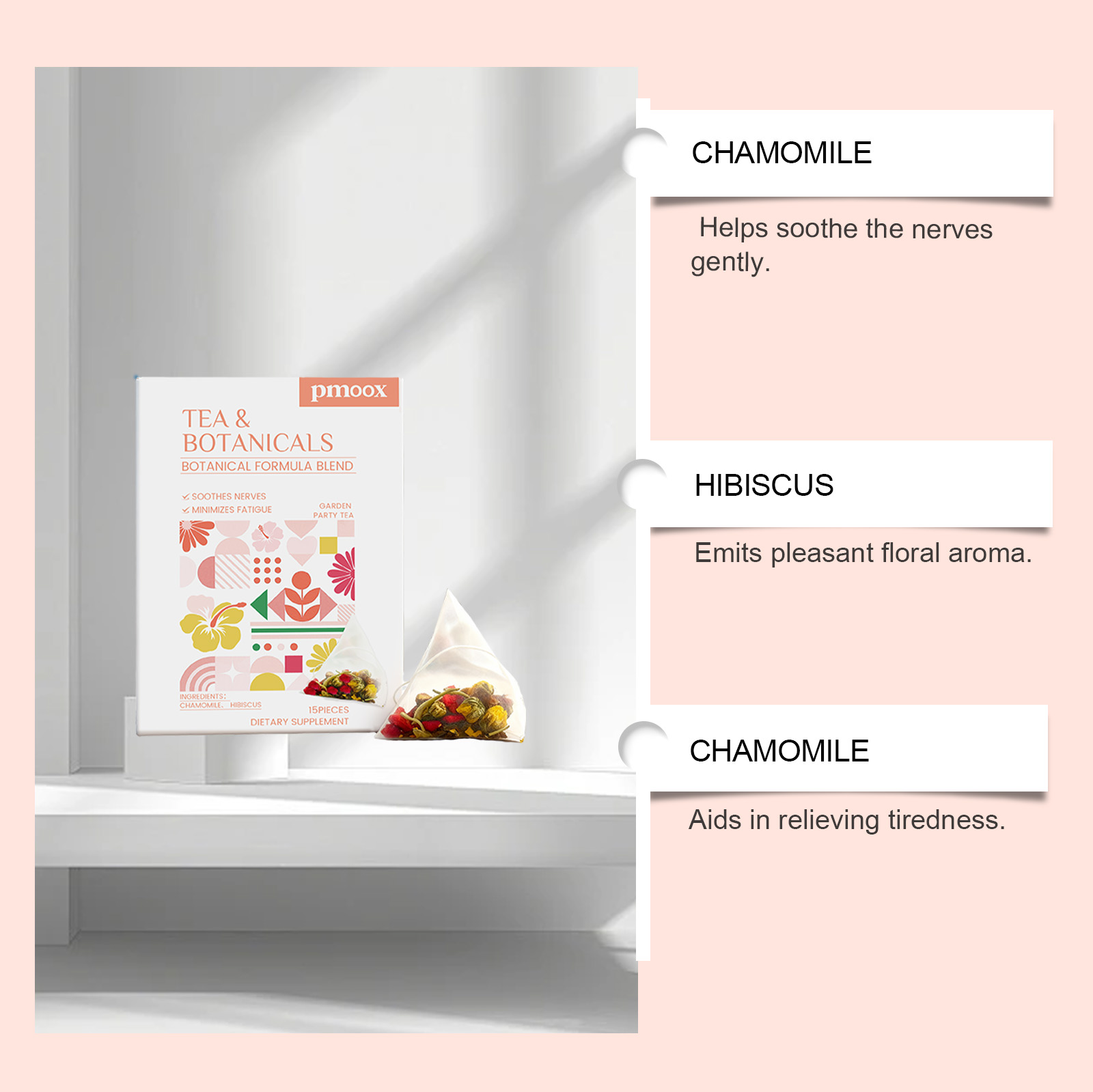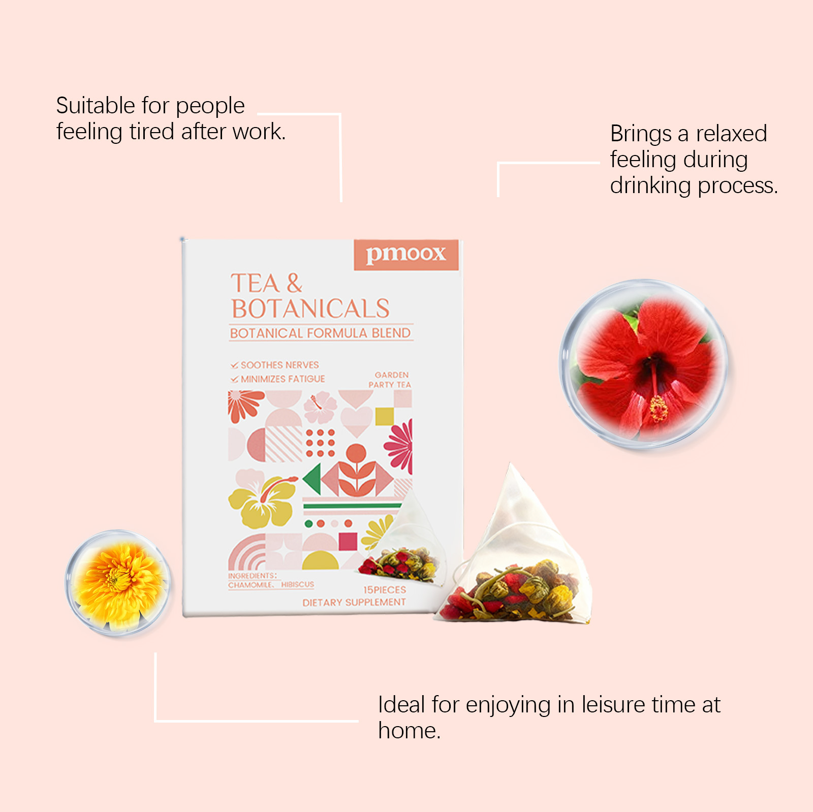我们的植萃花园慢享茶,由洋甘菊、芙蓉花精心调配而成。专为温和地帮助舒缓疲劳设计。使用方法极为便捷:1.打开盒子,将茶包放入杯中。2.将水煮至约90°C,倒入杯中浸泡茶包。3.静置浸泡3-5分钟,尽情享受香醇茶饮。并且它可以散发出宜人的植物香气。