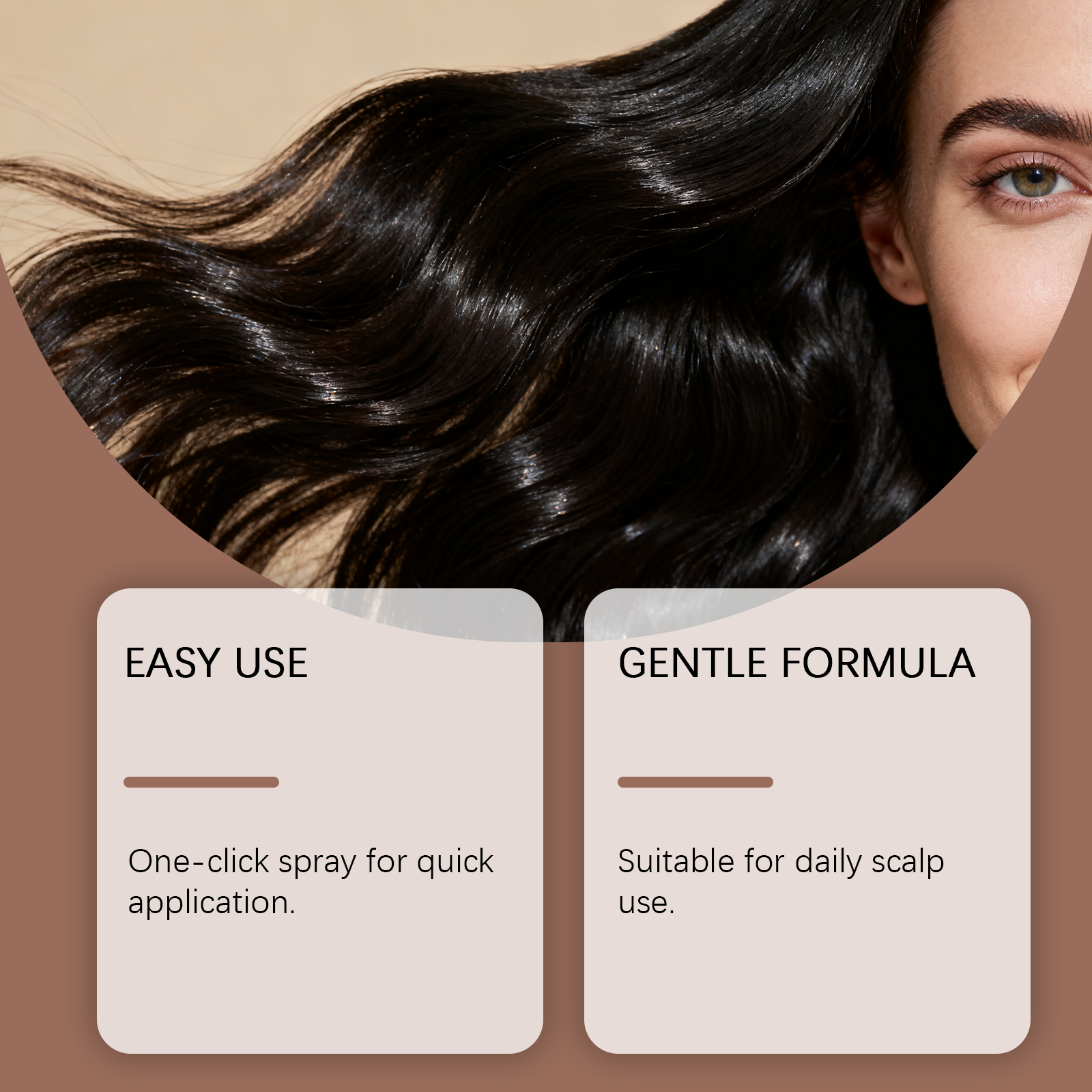我们的保湿护发喷雾,由甘油、1,2-己二醇精心调配而成。专为助力头发健康外观,加强毛囊滋养3. 提升发根活力设计。使用方法极为便捷:1、清洁吹干头发,确保发丝干燥无油脂残留。2、距离头皮10-15cm喷洒,重点覆盖发根区域。3、用指腹轻柔按摩头皮,促进喷雾成分吸收。并且它可以增添头发自然光泽,帮助维持头发密度。