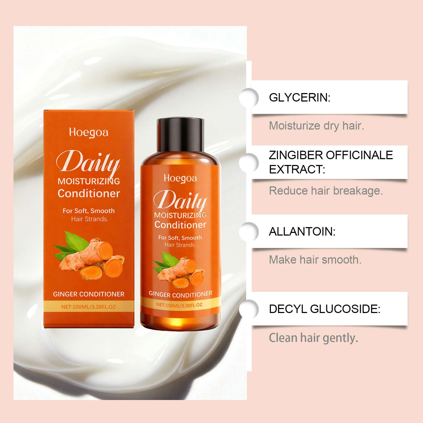 我们的生姜柔顺护发素,由姜提取物、尿囊素精心调配而成。专为滋养干燥的头发设计。使用方法极为便捷:清洁并擦干头发。取适量均匀涂抹于发中至发梢。轻轻按摩至头发中,并停留1-2分钟。用清水彻底冲洗干净。并且可以减少头发断裂。