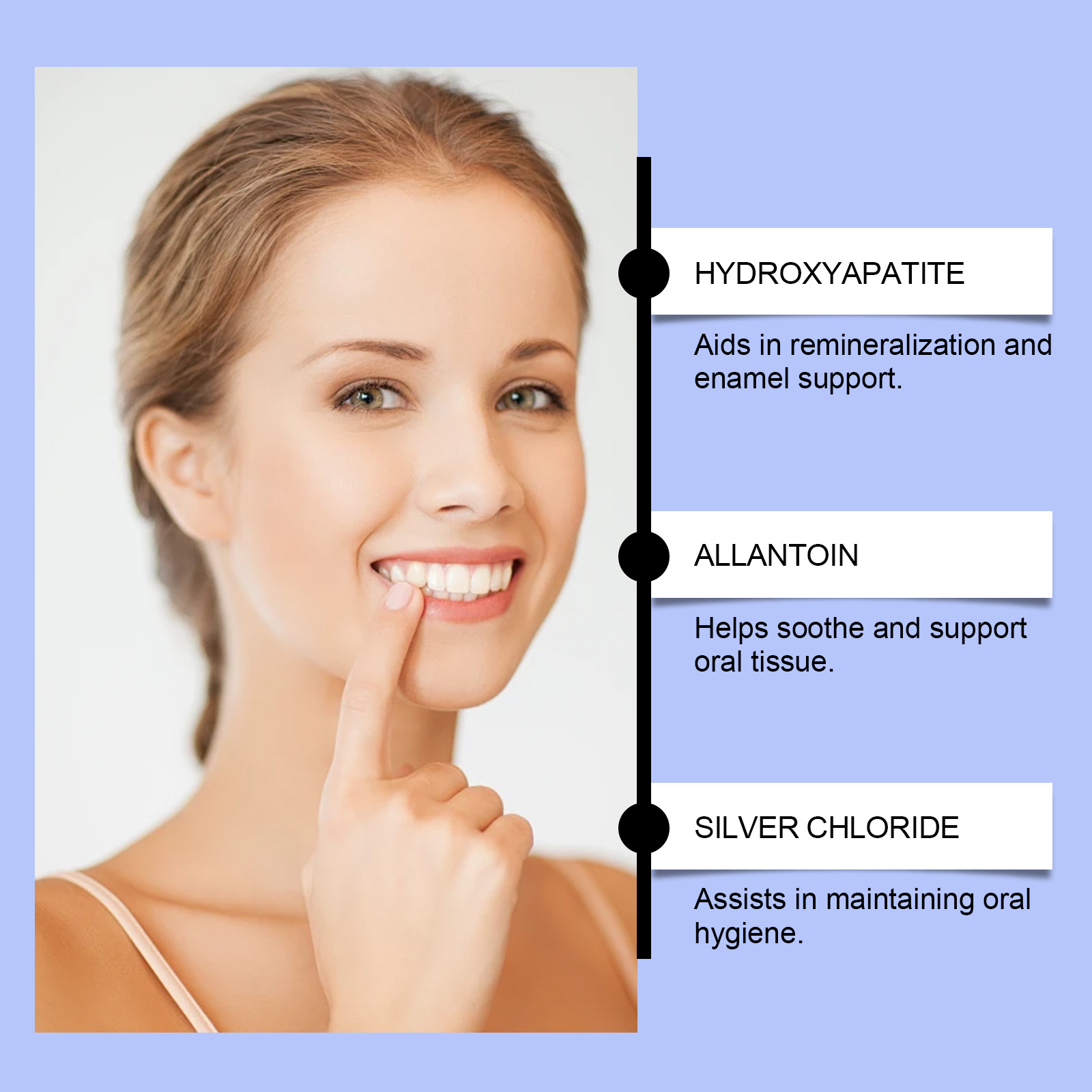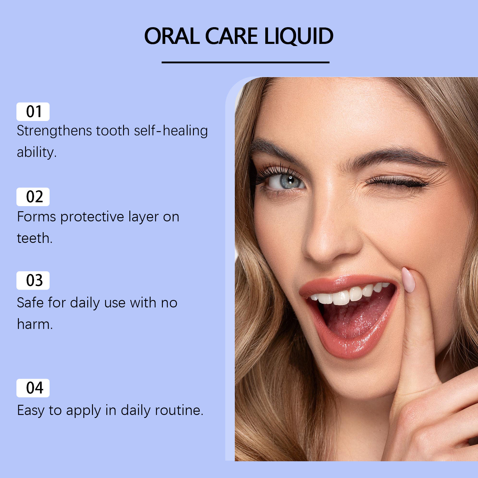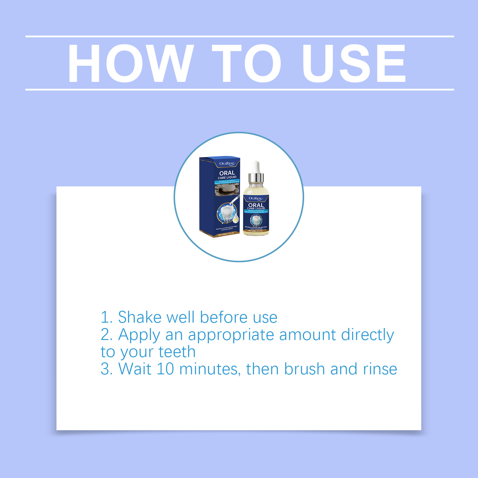 我们的牙齿护理液,由弹性蛋白、氯化银精心调配而成。专为保护牙齿免受外部刺激设计。使用方法极为便捷:1.使用前摇匀。2.直接将适量涂抹在牙齿上。3.等待10分钟,然后刷牙并漱口。并且可以减少牙齿敏感带来的不适。