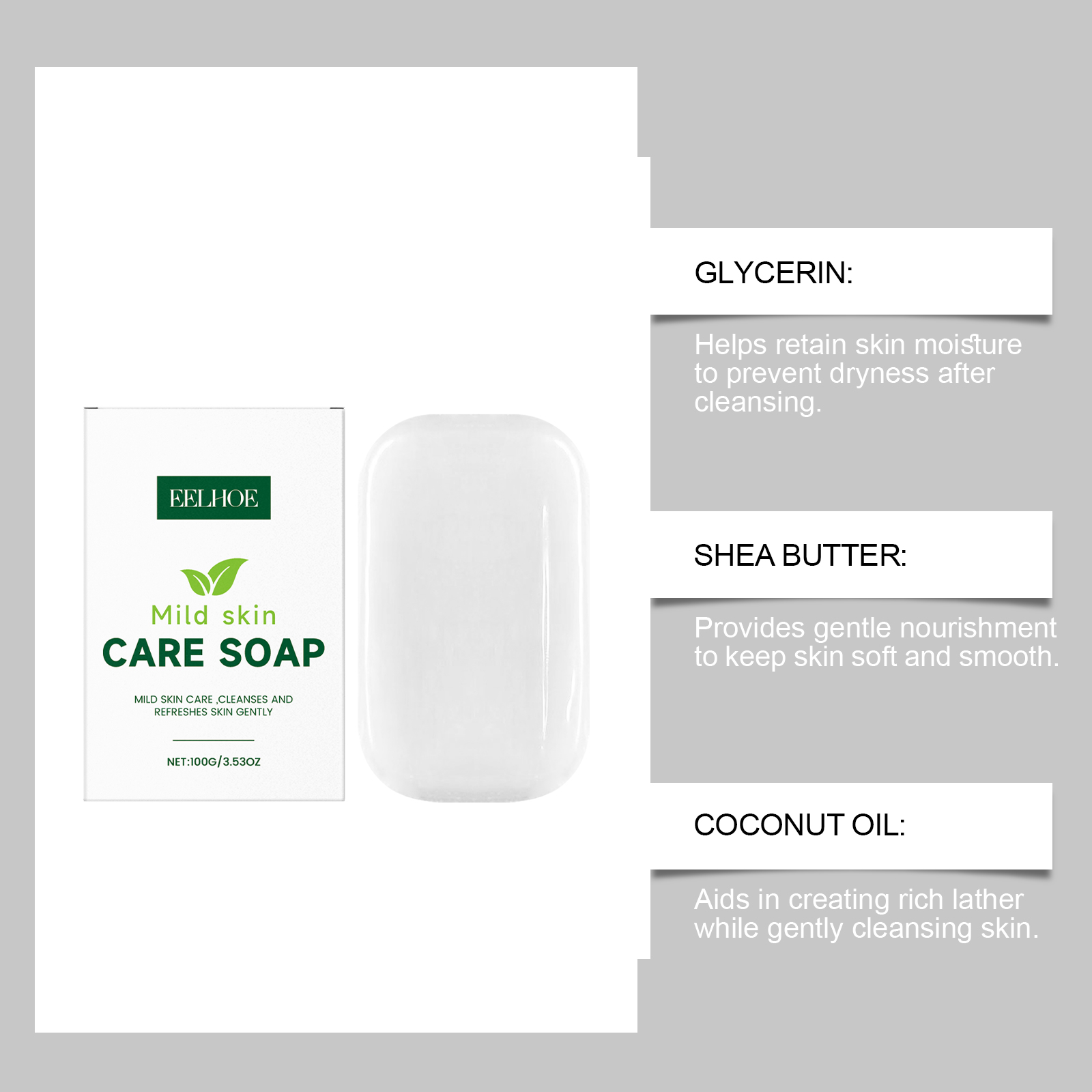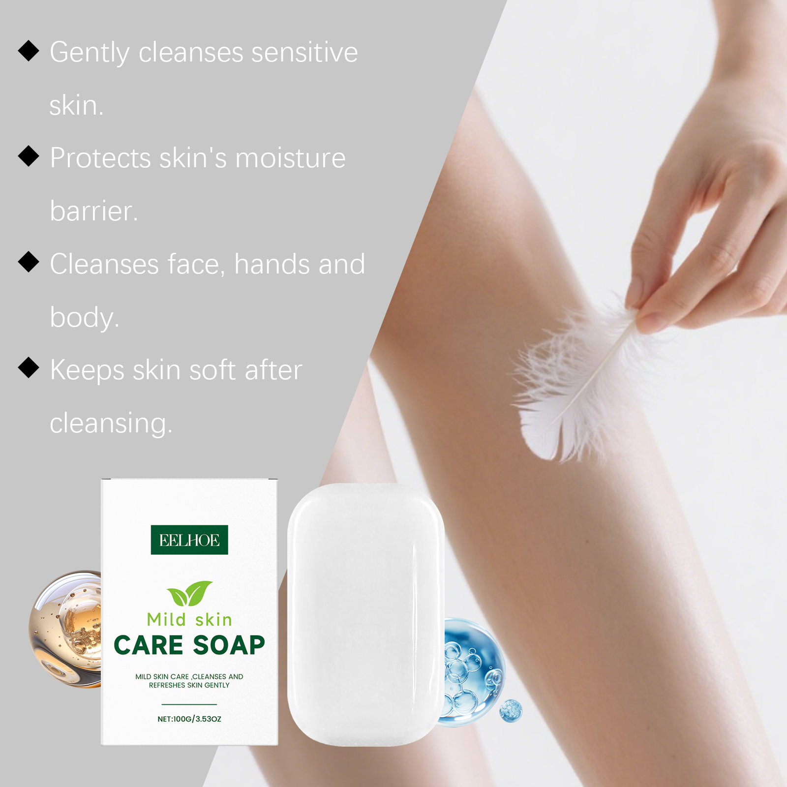 我们的温和无香清洁皂,由椰子油、油橄榄果油精心调配而成。专为温和清洁,不会刺激敏感肌肤设计。使用方法极为便捷:1.将肥皂在水中浸泡并轻轻搓出泡沫。2.将泡沫均匀地涂抹在脸部和身体上,用轻柔的打圈动作按摩并清洁2-3分钟。3.用温水彻底冲洗干净。并且适合清洁面部、手部和全身。