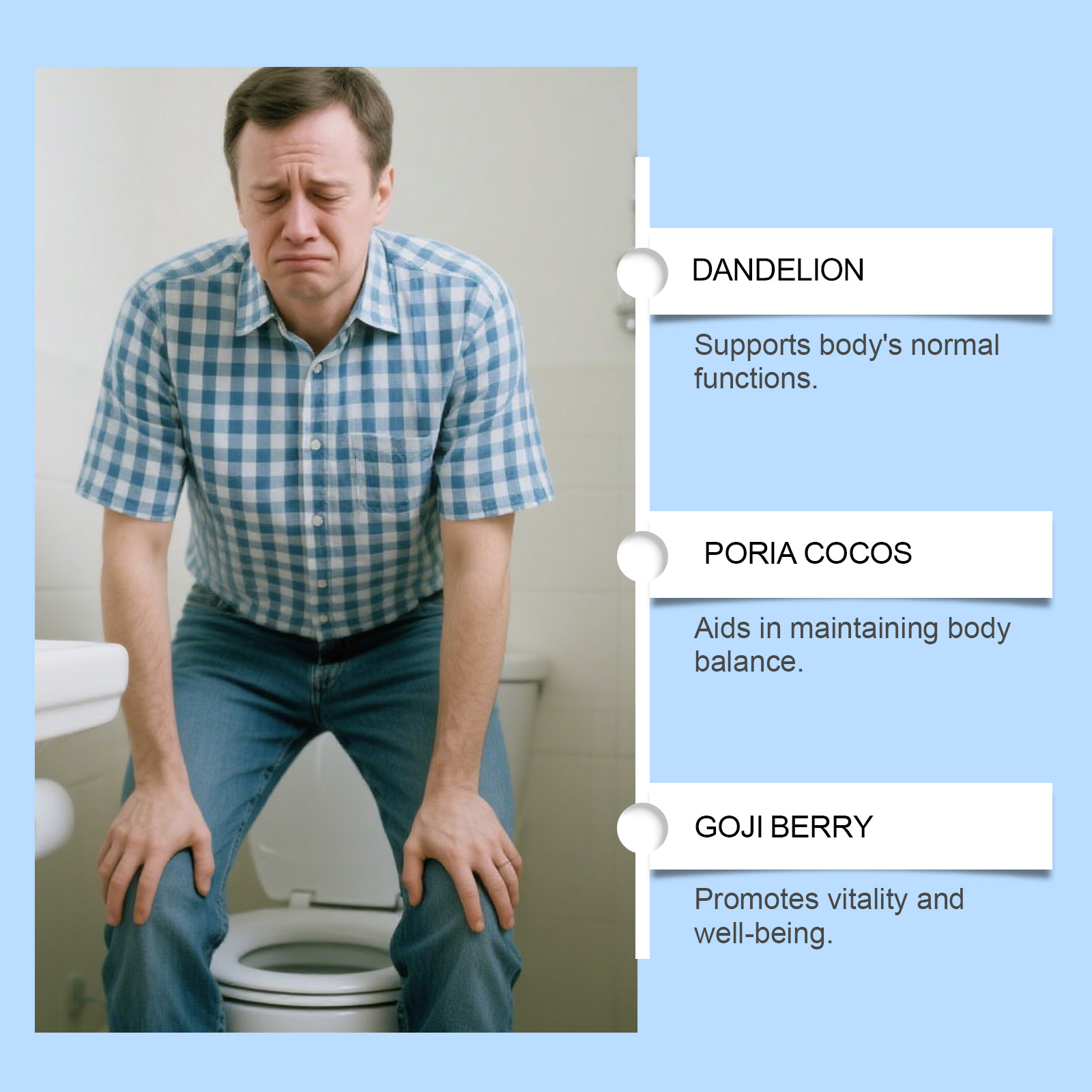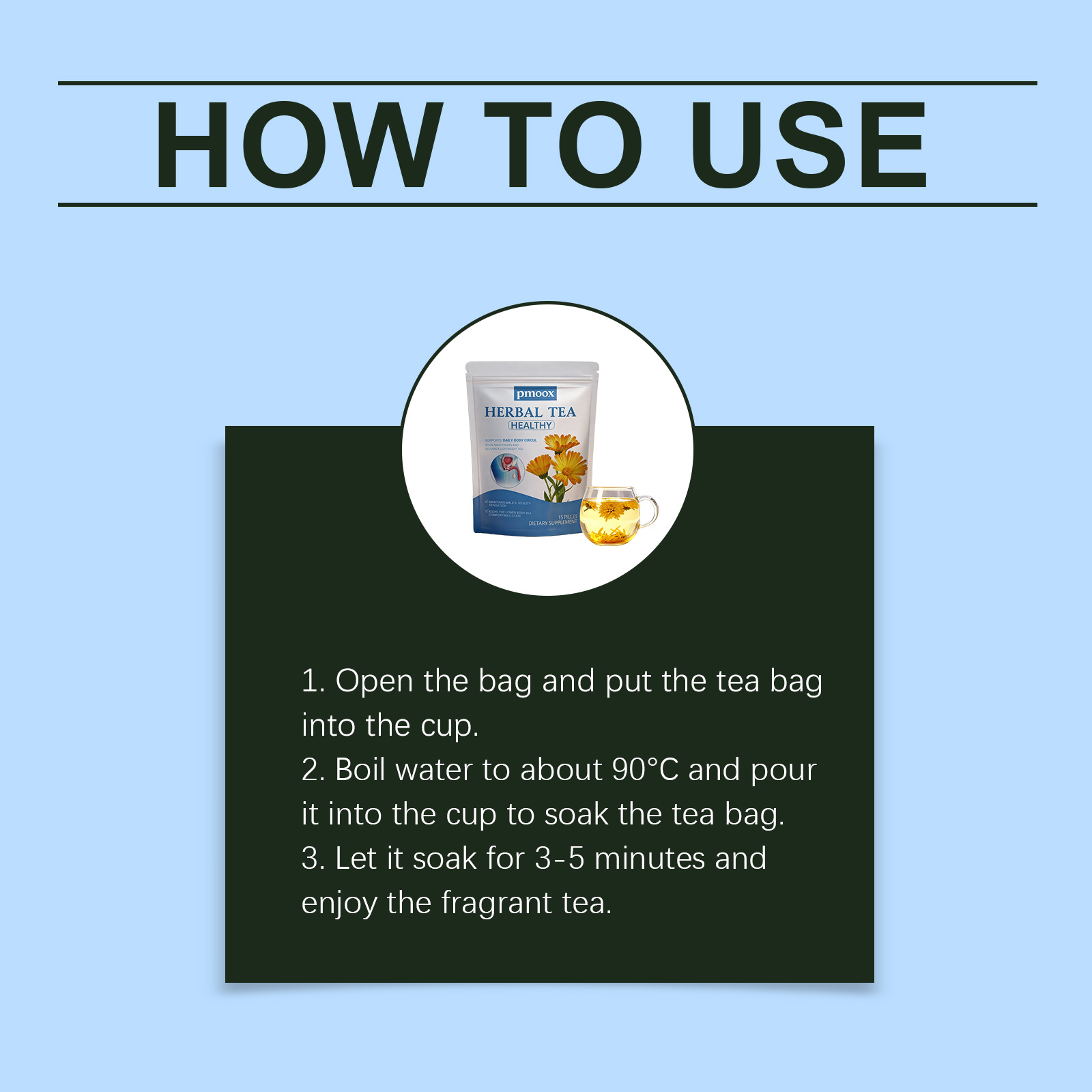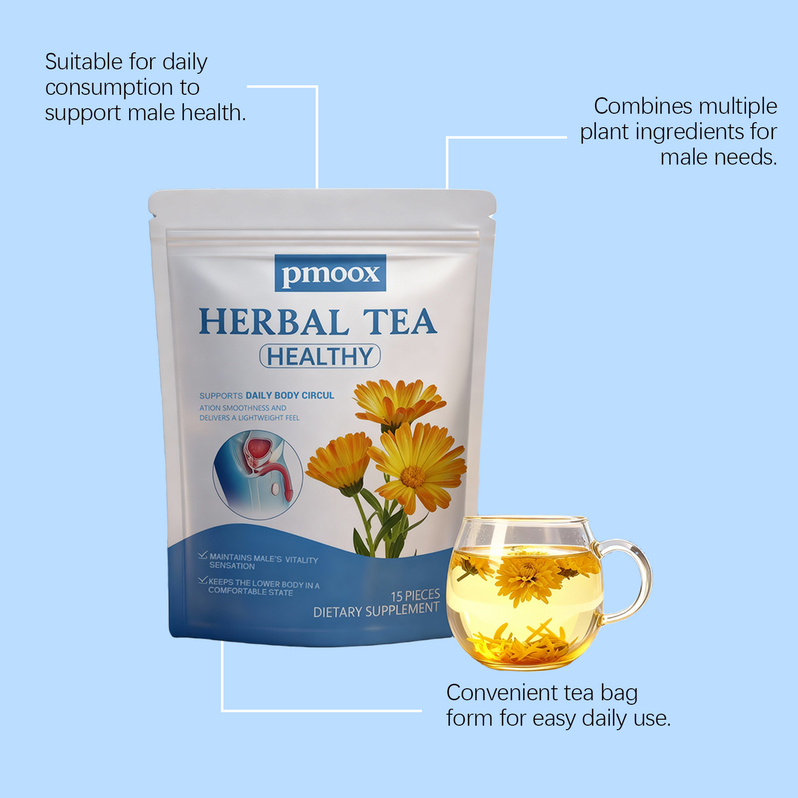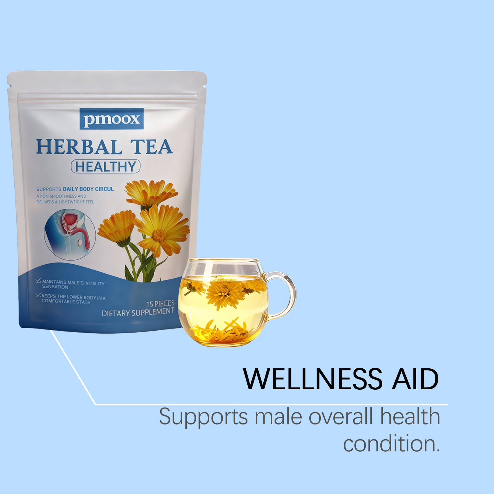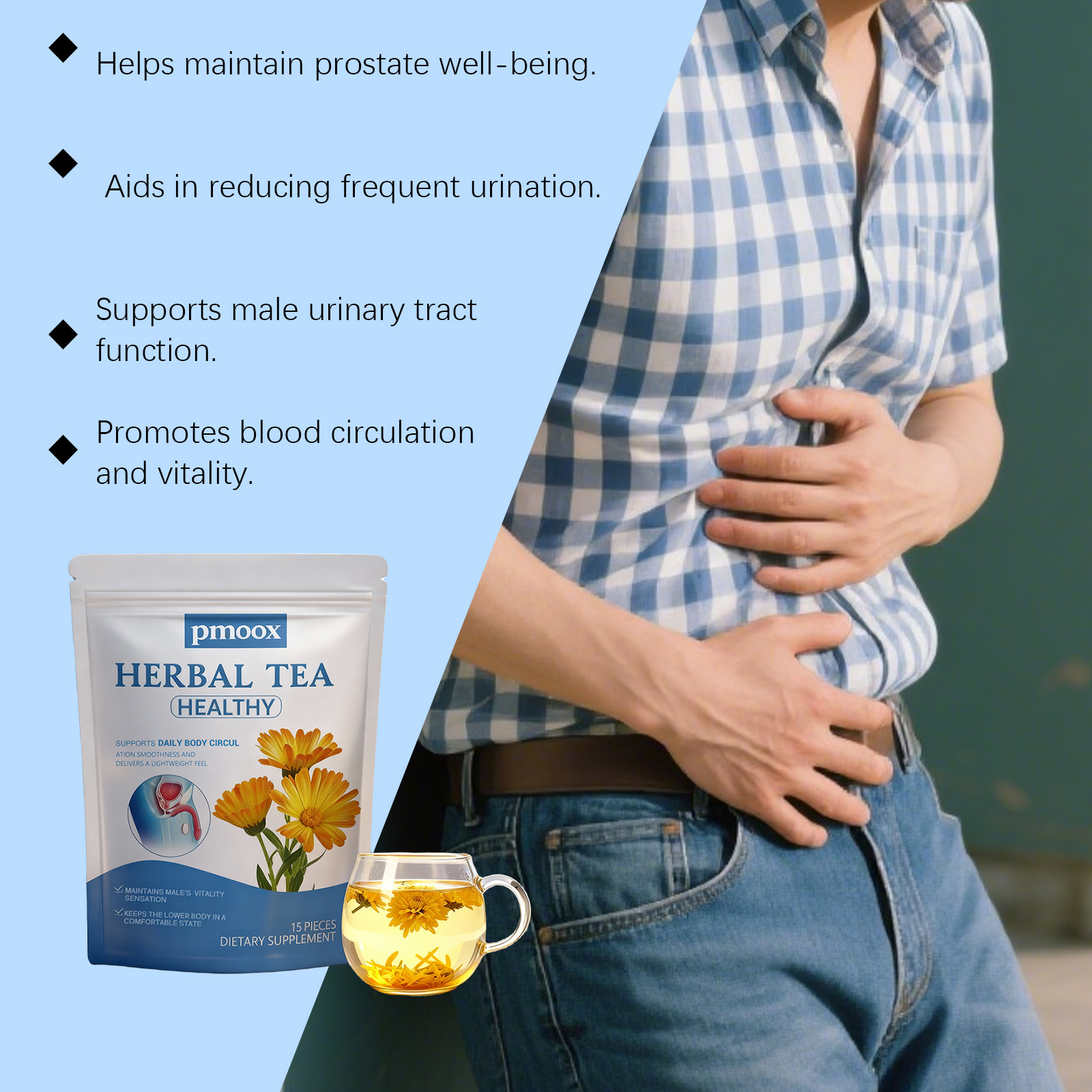我们的男士护理茶,由蒲公英、茯苓精心调配而成。专为有助于维持前列腺健康,有助于减少频繁排尿问题设计。使用方法极为便捷:1.打开包装袋,将茶包放入杯中。2.将水煮至约90°C,倒入杯中浸泡茶包。3.静置浸泡3-5分钟,尽情享受香醇茶饮。并且它可以促进血液循环和能量水平。