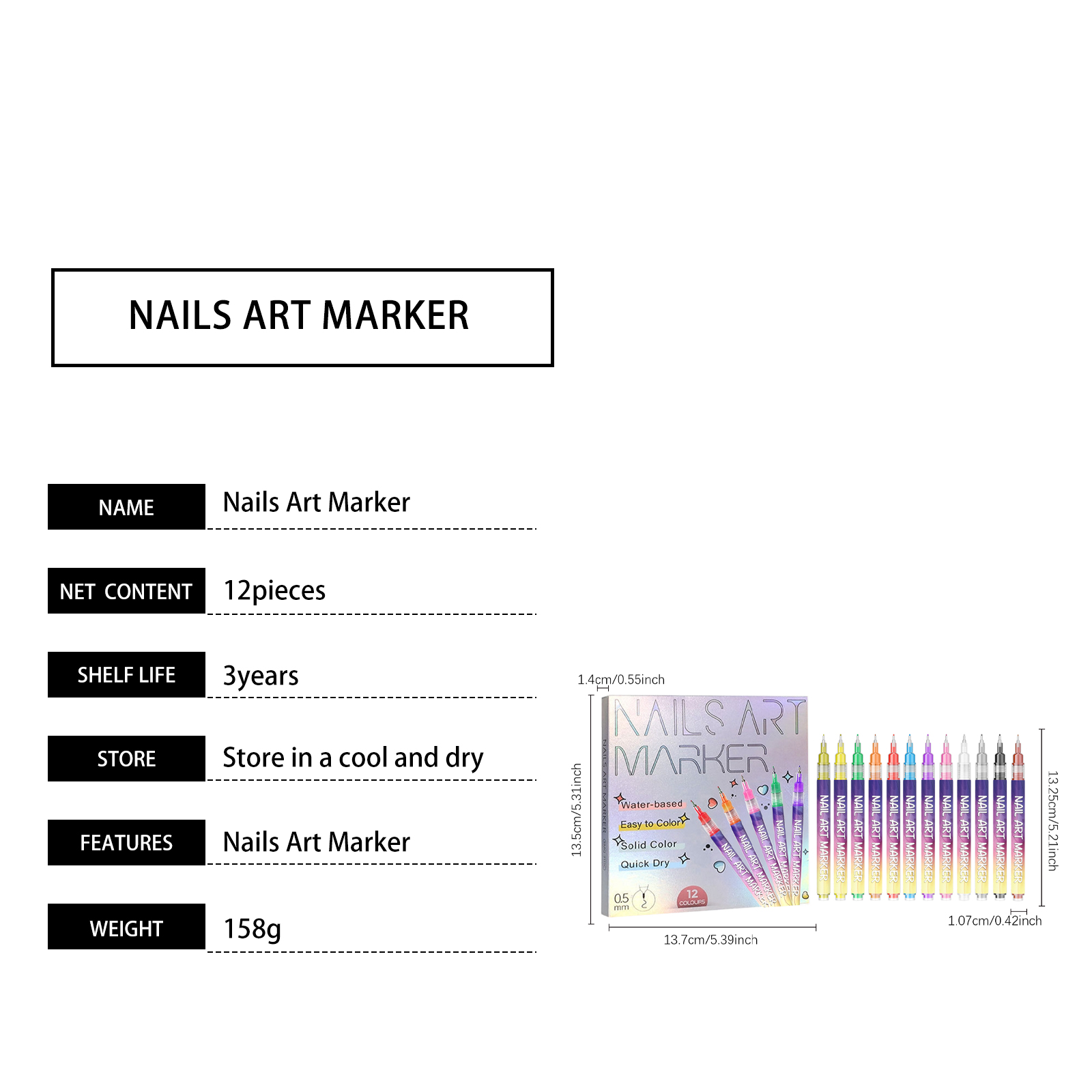 我们的DIY美甲彩绘笔,由氟碳树脂、膨润土精心调配而成。专为丰富而鲜艳的色彩,适合时尚美甲和精细装饰,细尖笔头可顺畅涂抹颜料,使初学者和专业人士都能轻松创作复杂图案设计。使用方法极为便捷:使用前请摇晃笔身,以充分混合墨水。笔尖朝上时,按压笔尖以释放压力。将笔旋转使笔尖朝下,持续按压直至墨水流出。墨水干燥后即具备防水功能。使用后,请牢固盖上笔帽,以防墨水干涸影响后续使用。并且它在家即可创作,包括花卉和抽象图案,无需专业沙龙服务。