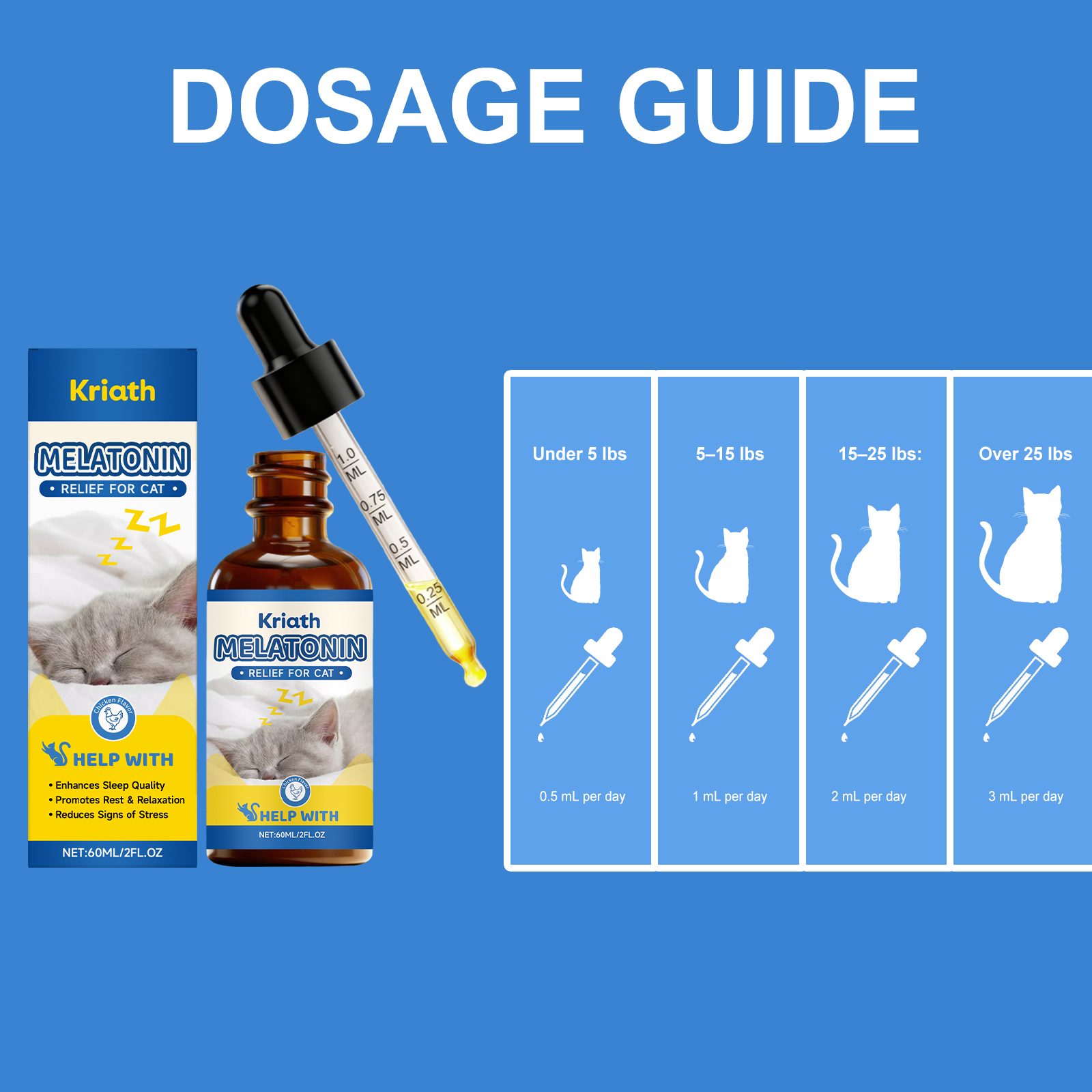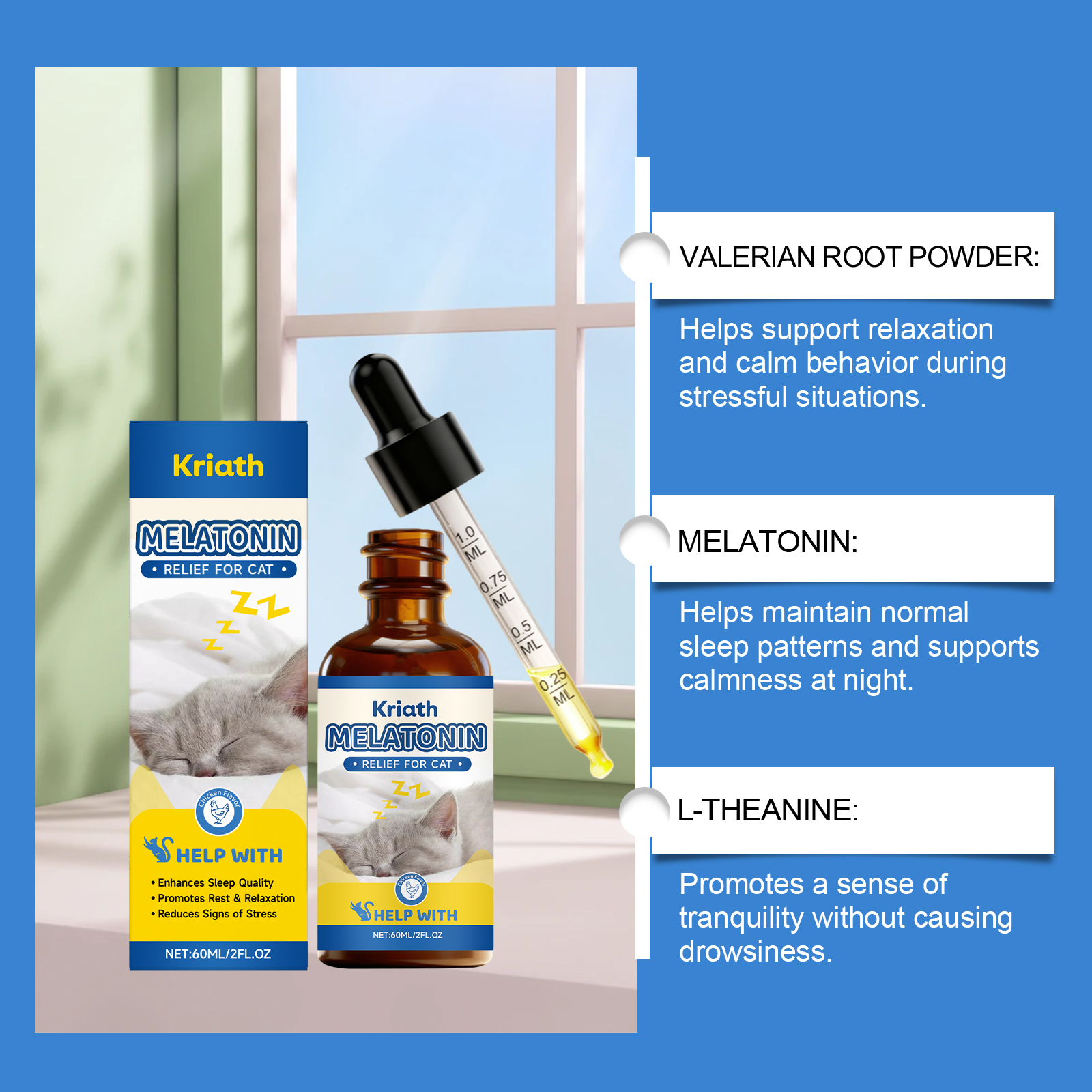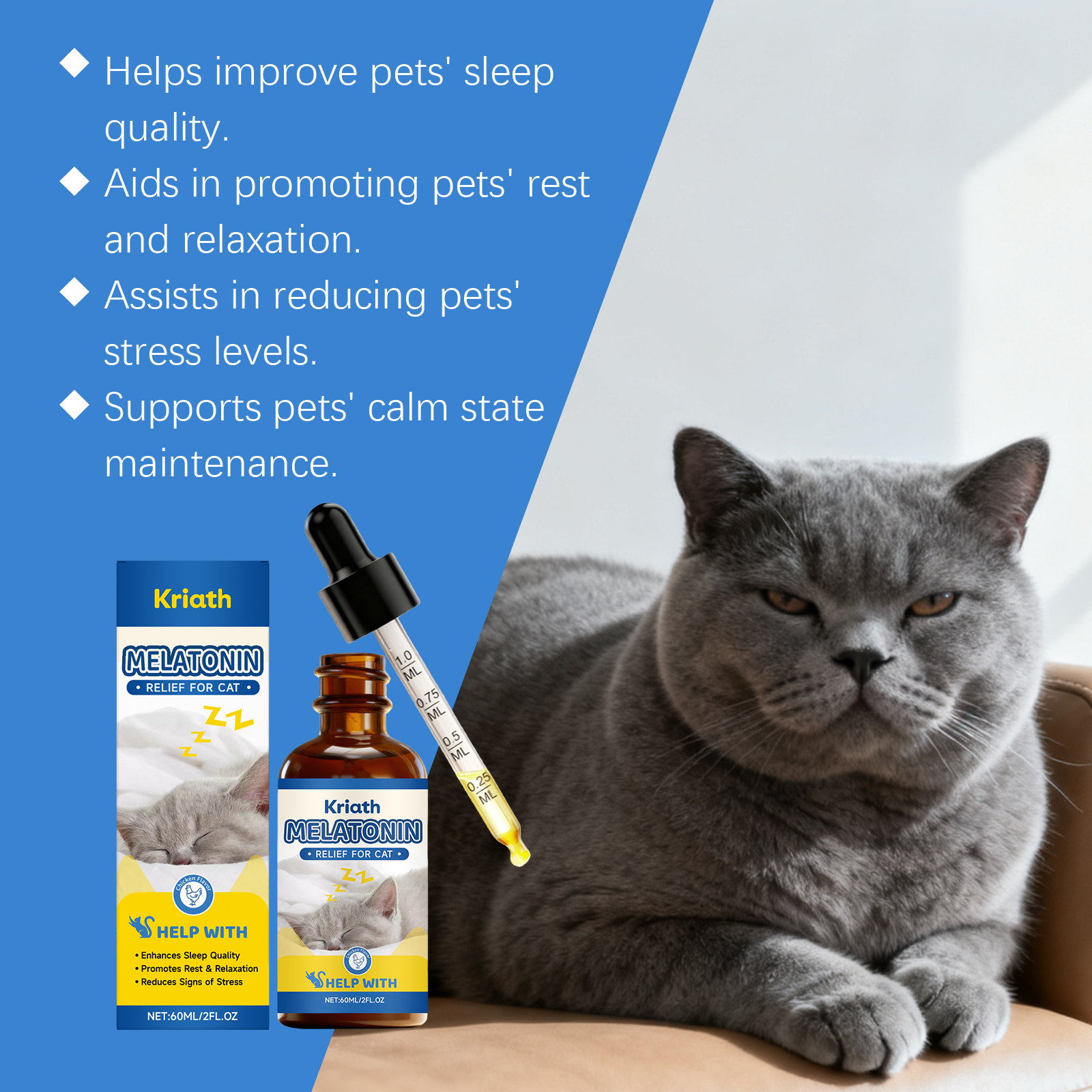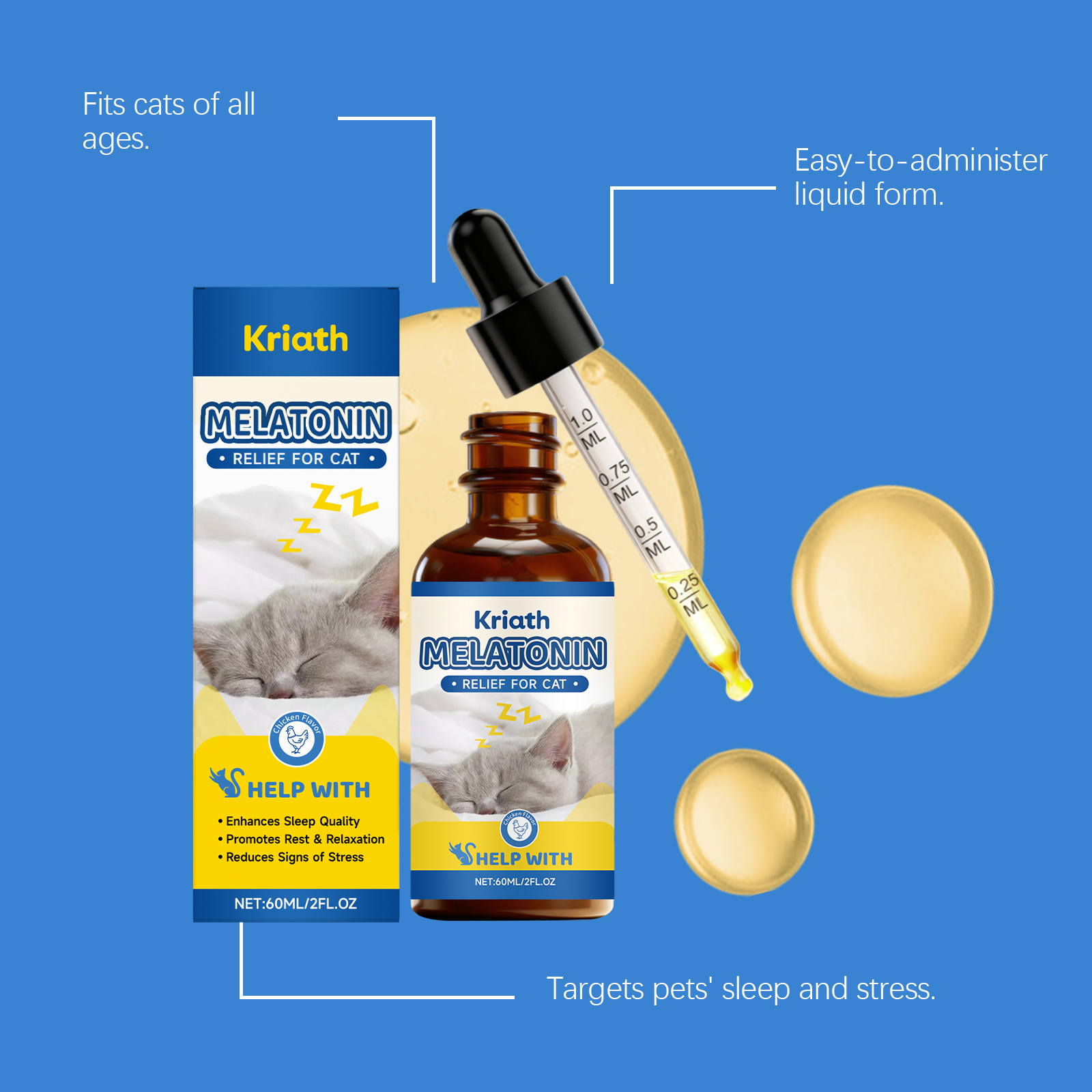 我们的猫用睡眠护理滴剂,由缬草根粉、褪黑激素精心调配而成。专为帮助提升宠物睡眠质量,助力促进宠物休息放松设计。使用方法极为便捷:喂食说明:仅限猫使用。可直接喂食或与食物混合喂食。使用说明:5磅以下:每日0.5毫升,5-15磅:每日1毫升,15-25磅:每日2毫升,25磅以上:每日3毫升。并且它可以协助减轻宠物压力程度,支持维持宠物平静状态。