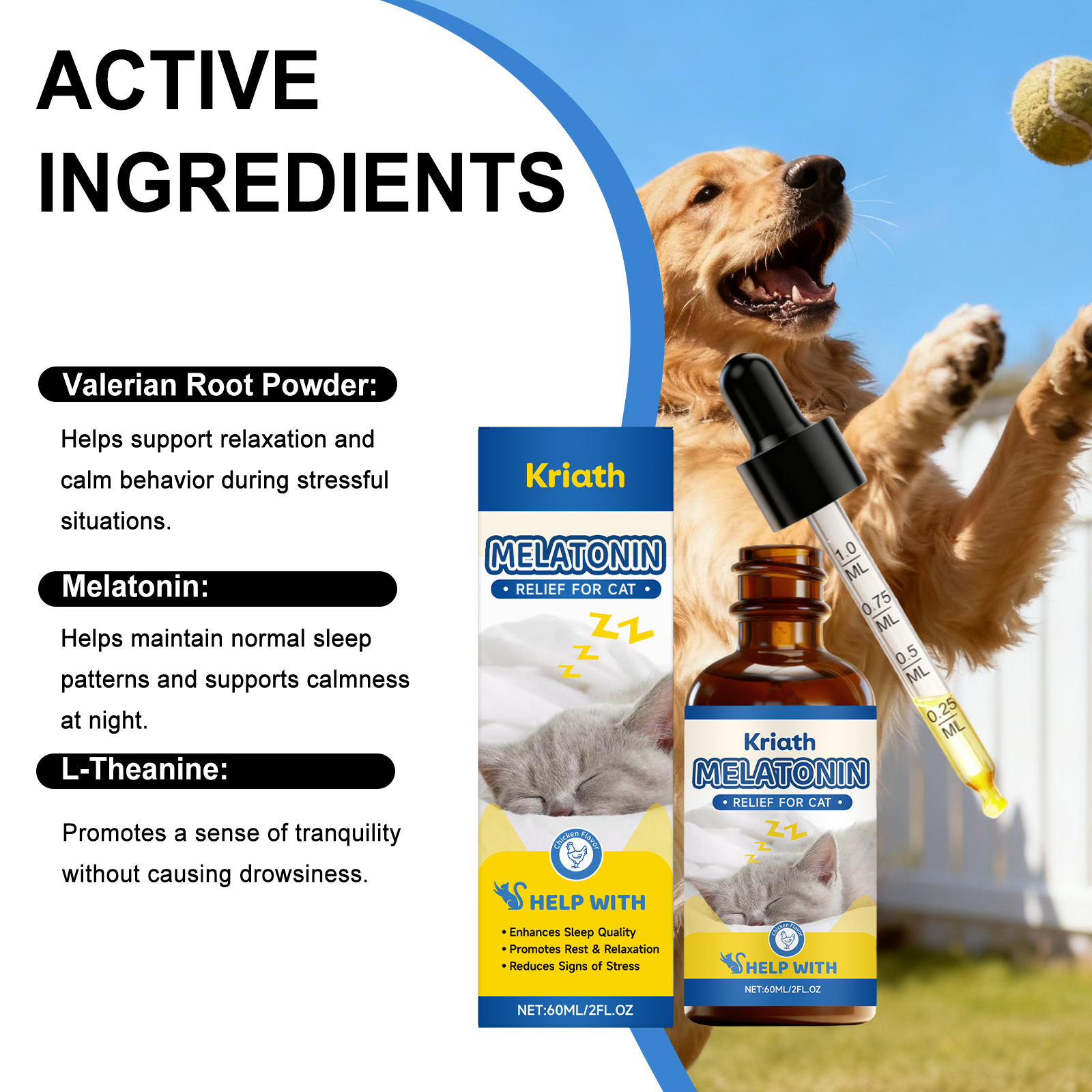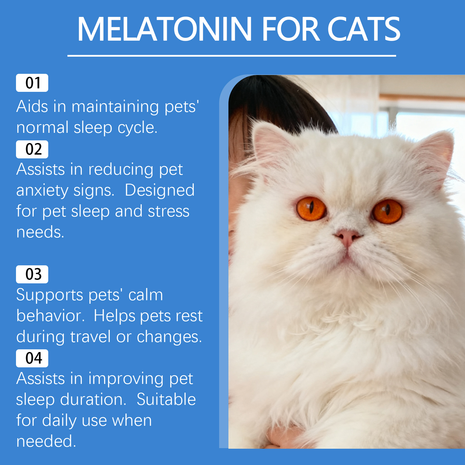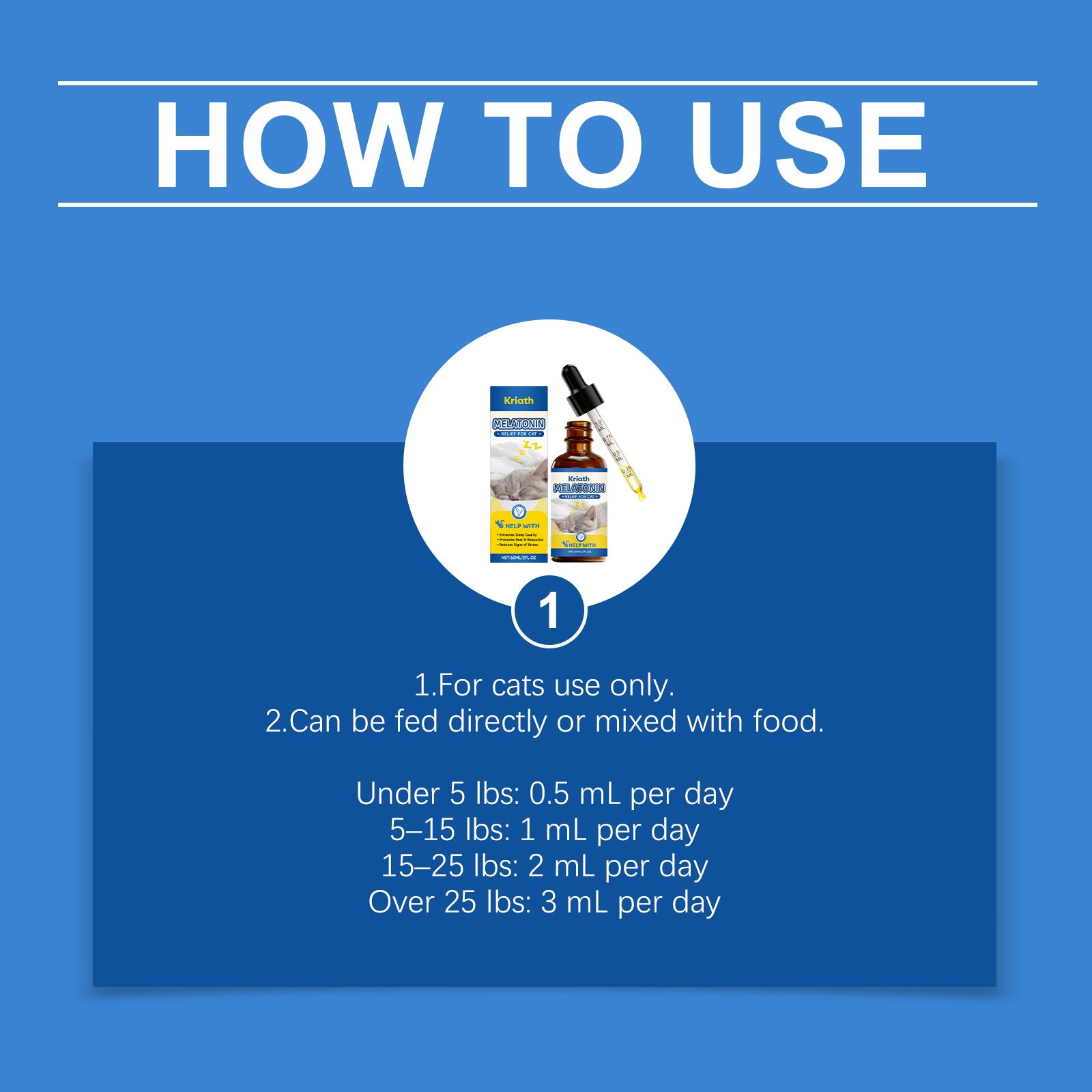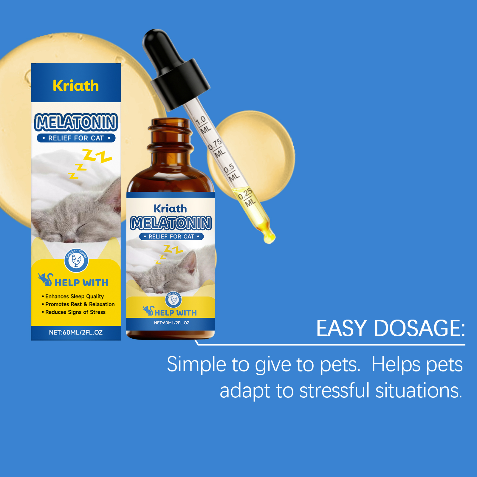 我们的猫用睡眠护理滴剂,由缬草根粉、褪黑激素精心调配而成。专为帮助提升宠物睡眠质量,助力促进宠物休息放松设计。使用方法极为便捷:喂食说明:仅限猫使用。可直接喂食或与食物混合喂食。使用说明:5磅以下:每日0.5毫升,5-15磅:每日1毫升,15-25磅:每日2毫升,25磅以上:每日3毫升。并且它可以协助减轻宠物压力程度,支持维持宠物平静状态。