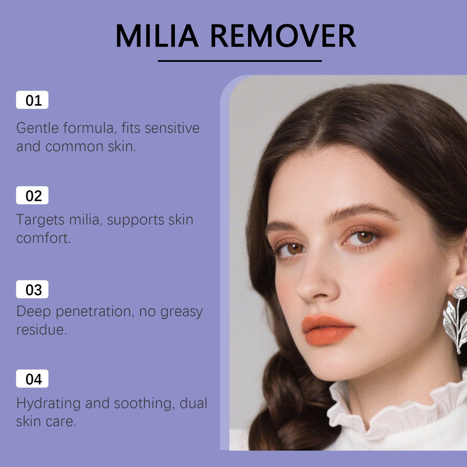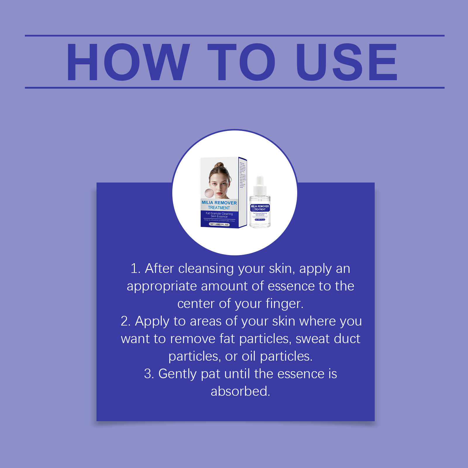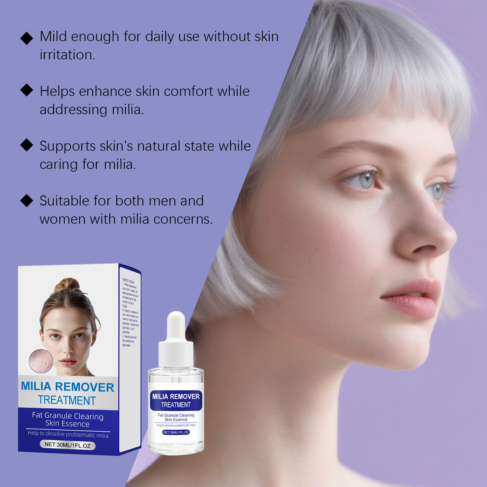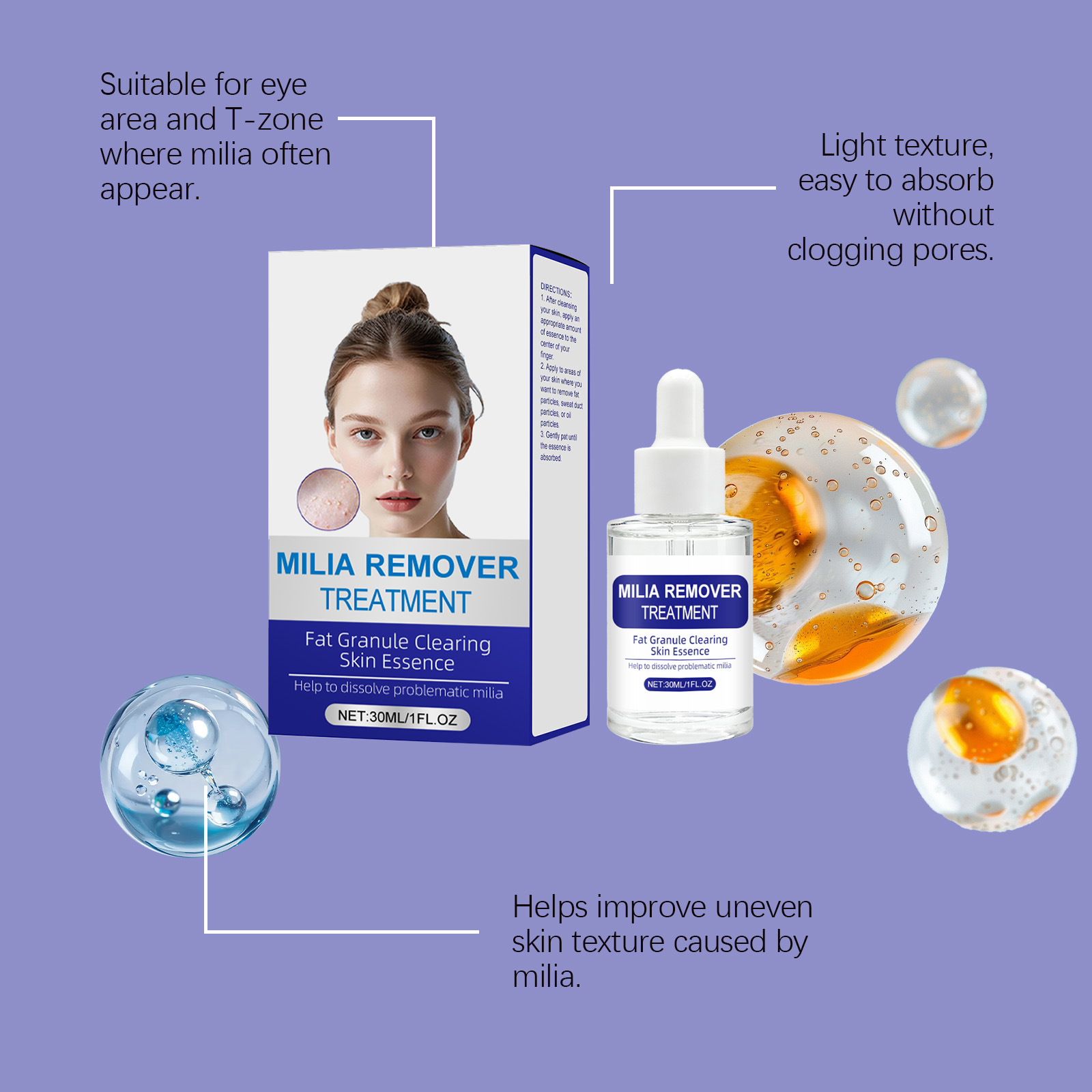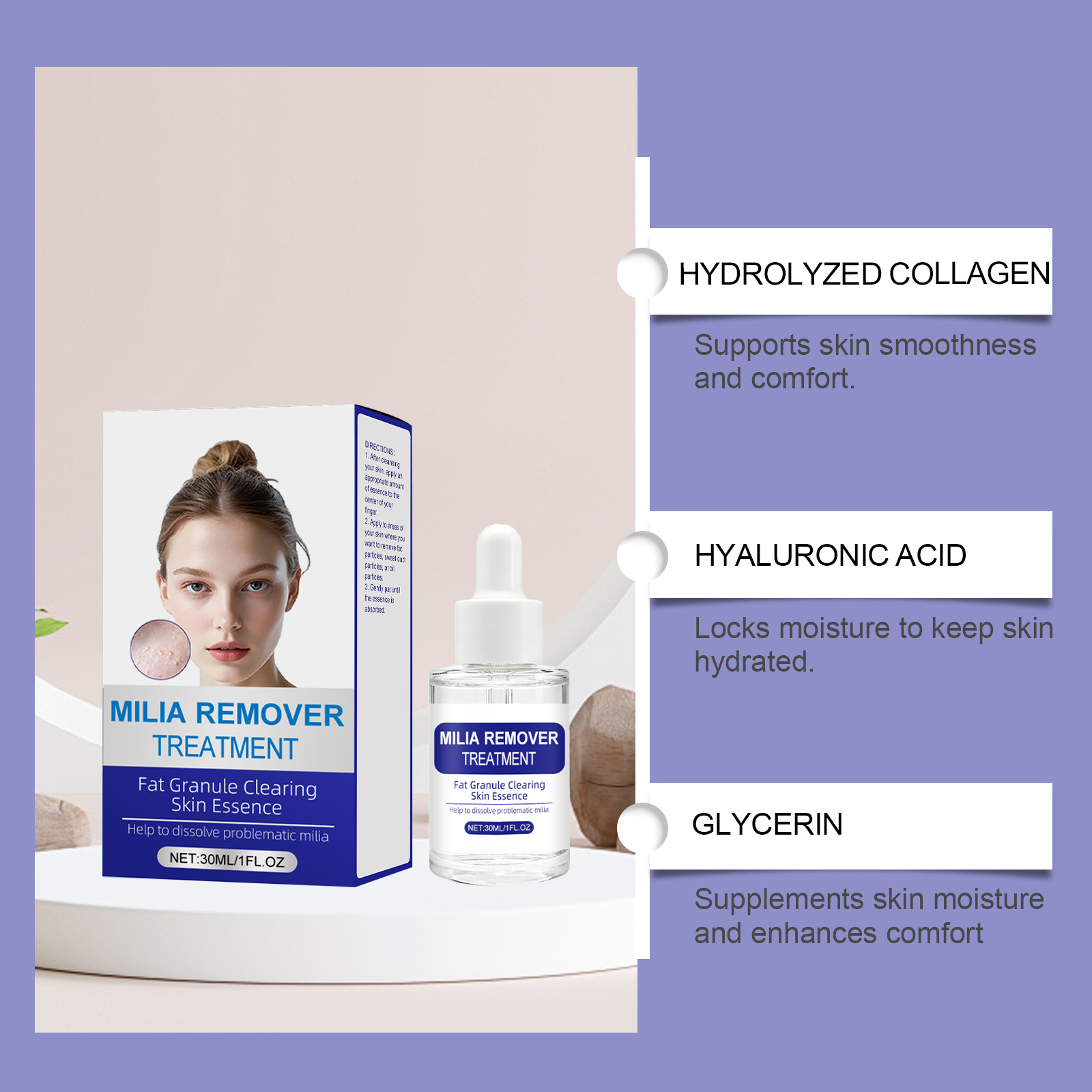 我们的净肤修护精华液,由甘油、矿油精心调配而成。专为温和促渗呵护,针对脂肪粒并舒缓肌肤,助力改善脂肪粒,支持其自然脱落设计。使用方法极为便捷:1.在清洁完皮肤后,取适量精华液涂抹于手指中央。2.将此产品涂抹于您想要去除脂肪颗粒、汗腺颗粒或油脂颗粒的皮肤区域。3.轻轻拍打,直至精华被吸收。并且它可以补充水分,维持肌肤光滑与舒适状态,舒缓肌肤困扰,呵护肌肤良好状态。