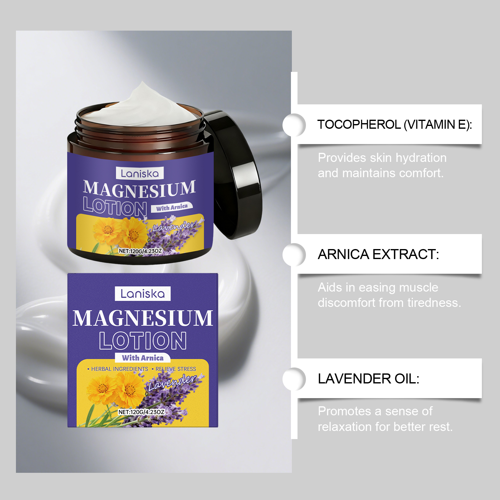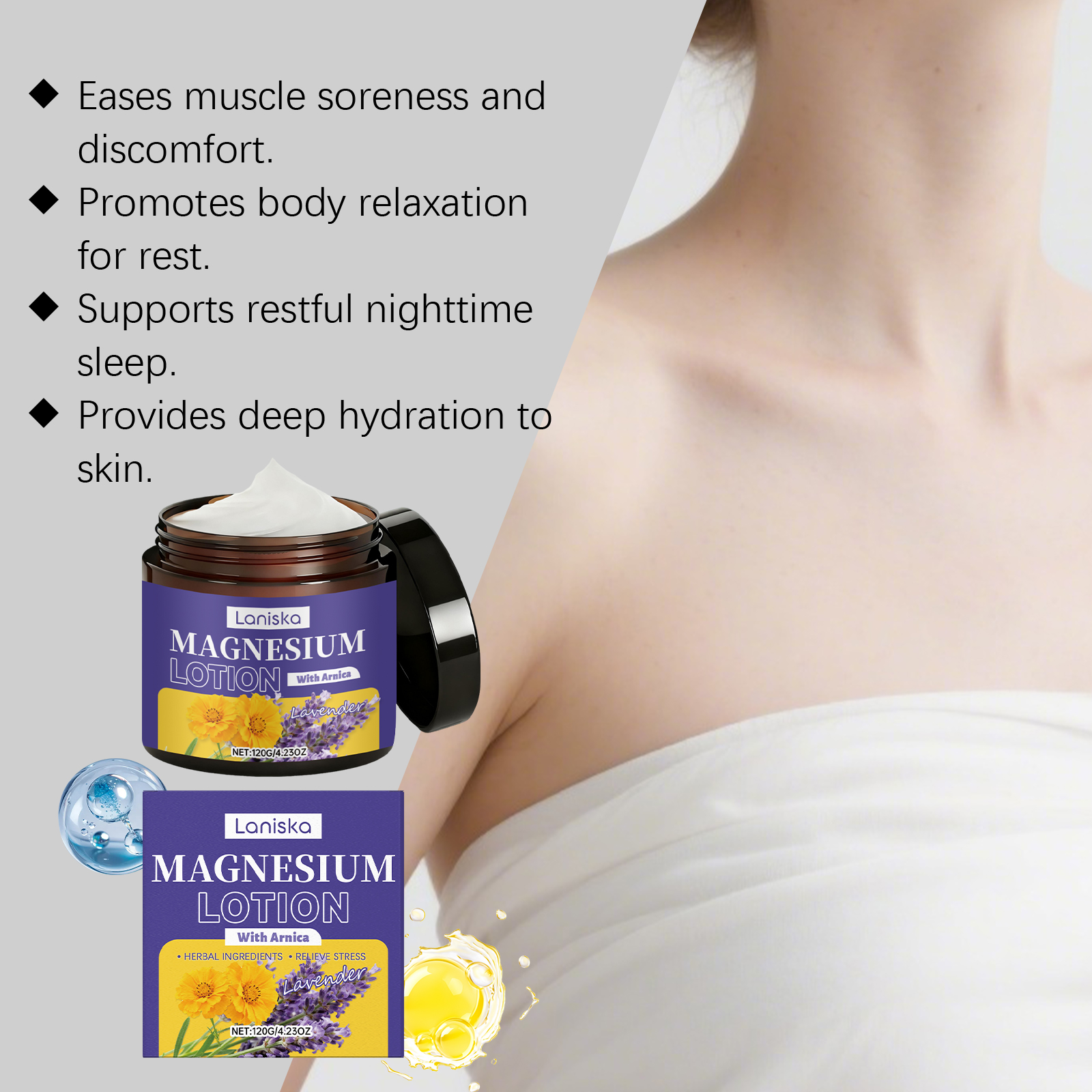 我们的睡眠护理镁霜,由薰衣草油、牛油果树果脂精心调配而成。专为缓解疲劳肌肉不适设计。使用方法极为便捷:1.清洁并擦干皮肤。2.在腿部、手臂或胸部均匀涂抹适量产品。3.轻轻按摩至吸收。并且可以促进放松,助您安睡。.gif)