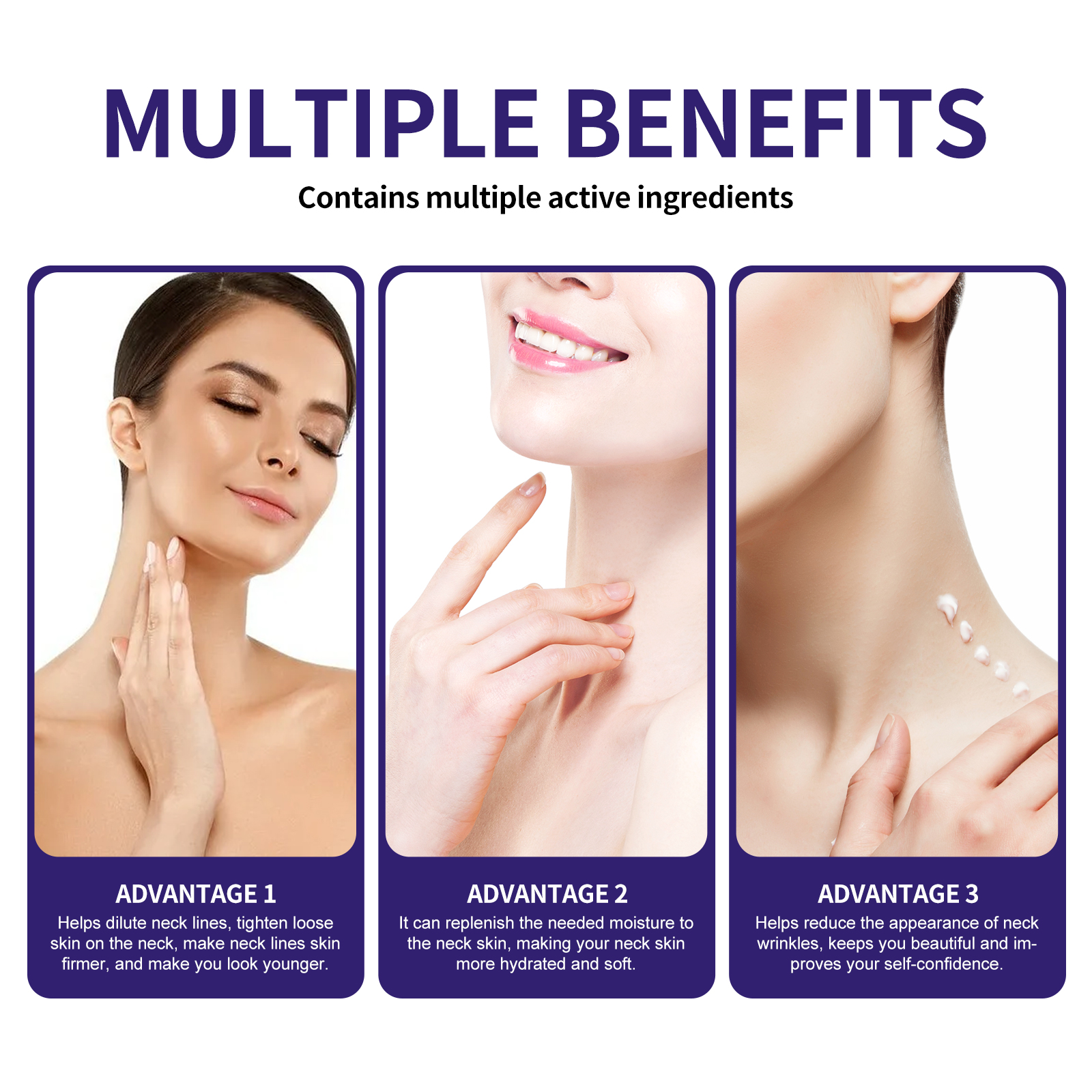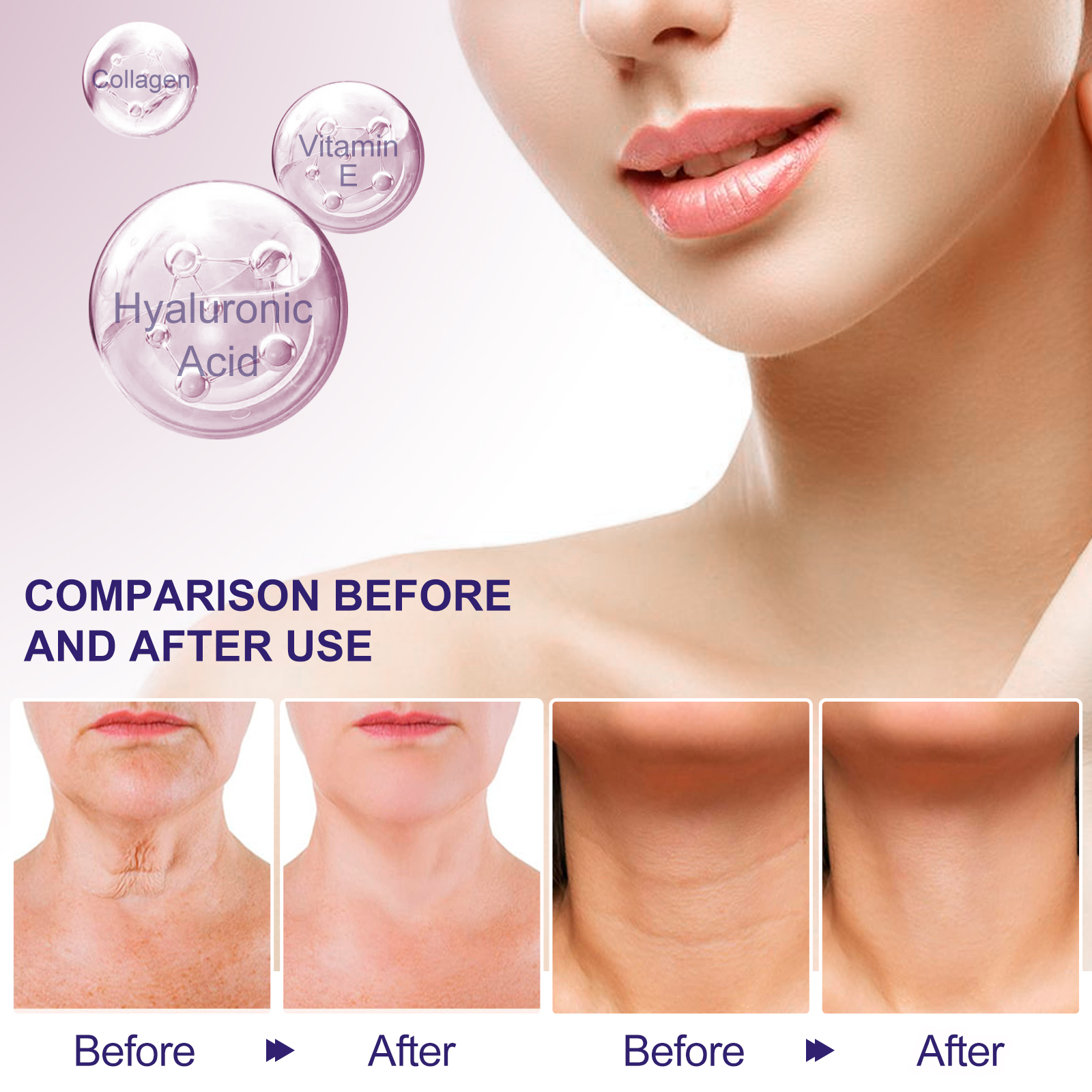 我们的淡化颈纹霜含有芦荟提取物、透明质酸、椰子油。它可以恢复皮肤的年轻状态,补充必要的水分,并达到淡化和减少颈纹的外观。它的使用方法很简单:清洁皮肤并擦干,取适量本品均匀涂于颈部肌,用指尖轻轻按摩,直至完全吸收即可。可以有效对抗皱纹、细纹、肤色不均匀、质地粗糙和皮肤不紧实等问题,让你的颈部看起来更紧致、更年轻。