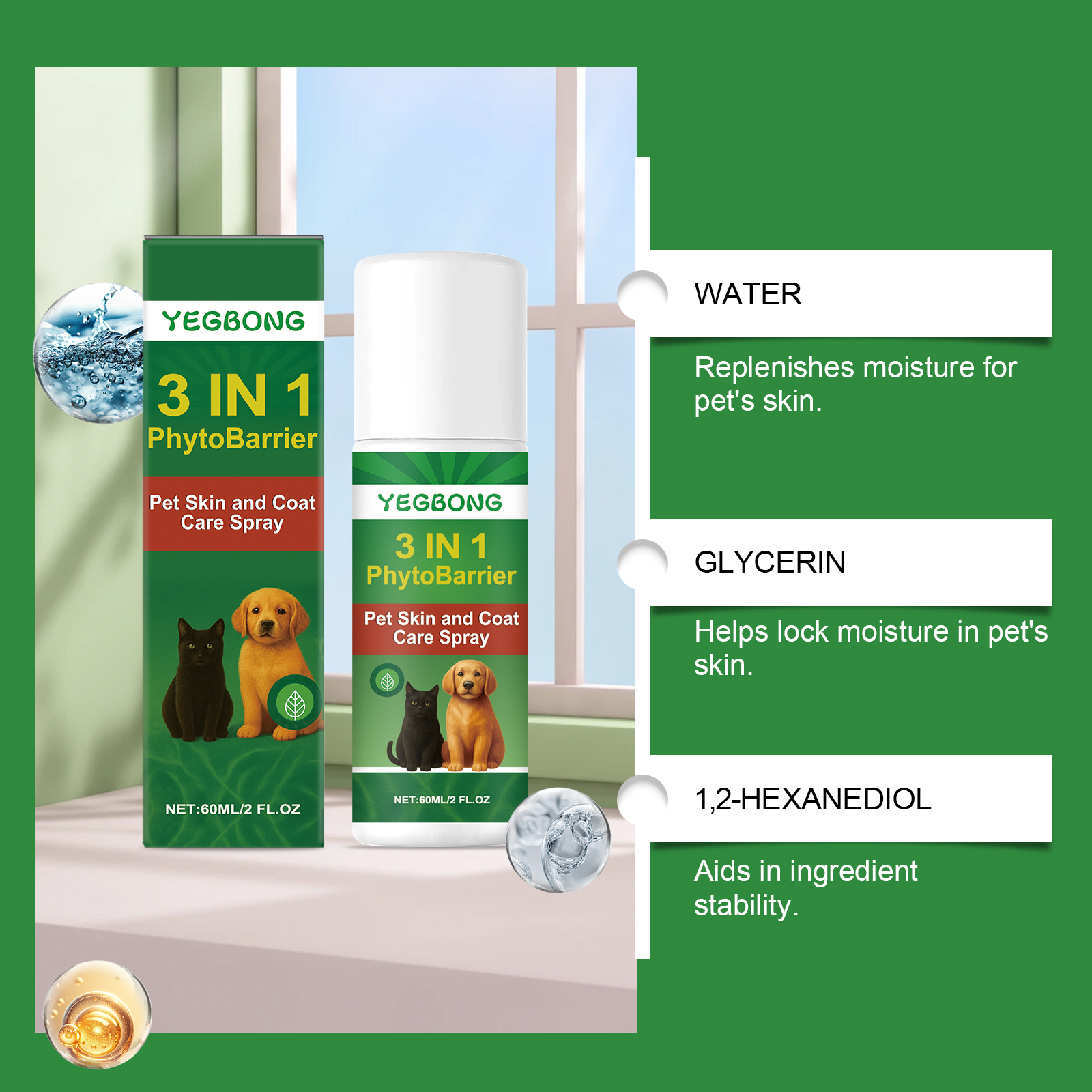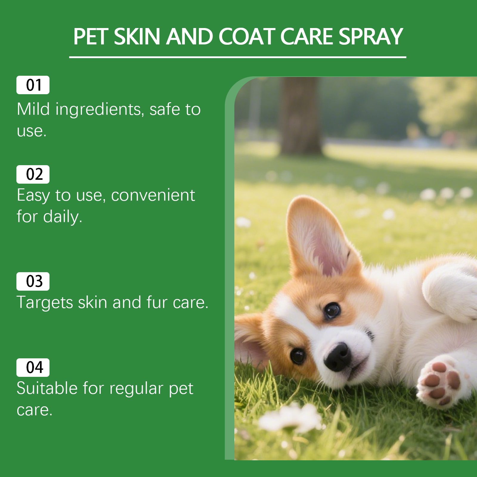 我们的宠物皮肤和毛发护理喷雾,由甘油、1,2-己二醇精心调配而成。专为适合宠物日常皮肤护理,有助于保持宠物皮肤的水分设计。使用方法极为便捷:1.宠物清洁完皮肤并保持皮肤干燥。2.使用前摇匀本品,均匀喷于患处或皮赘上。 3.轻轻按摩至完全吸收。并且它可以有助于保持宠物毛发光滑。