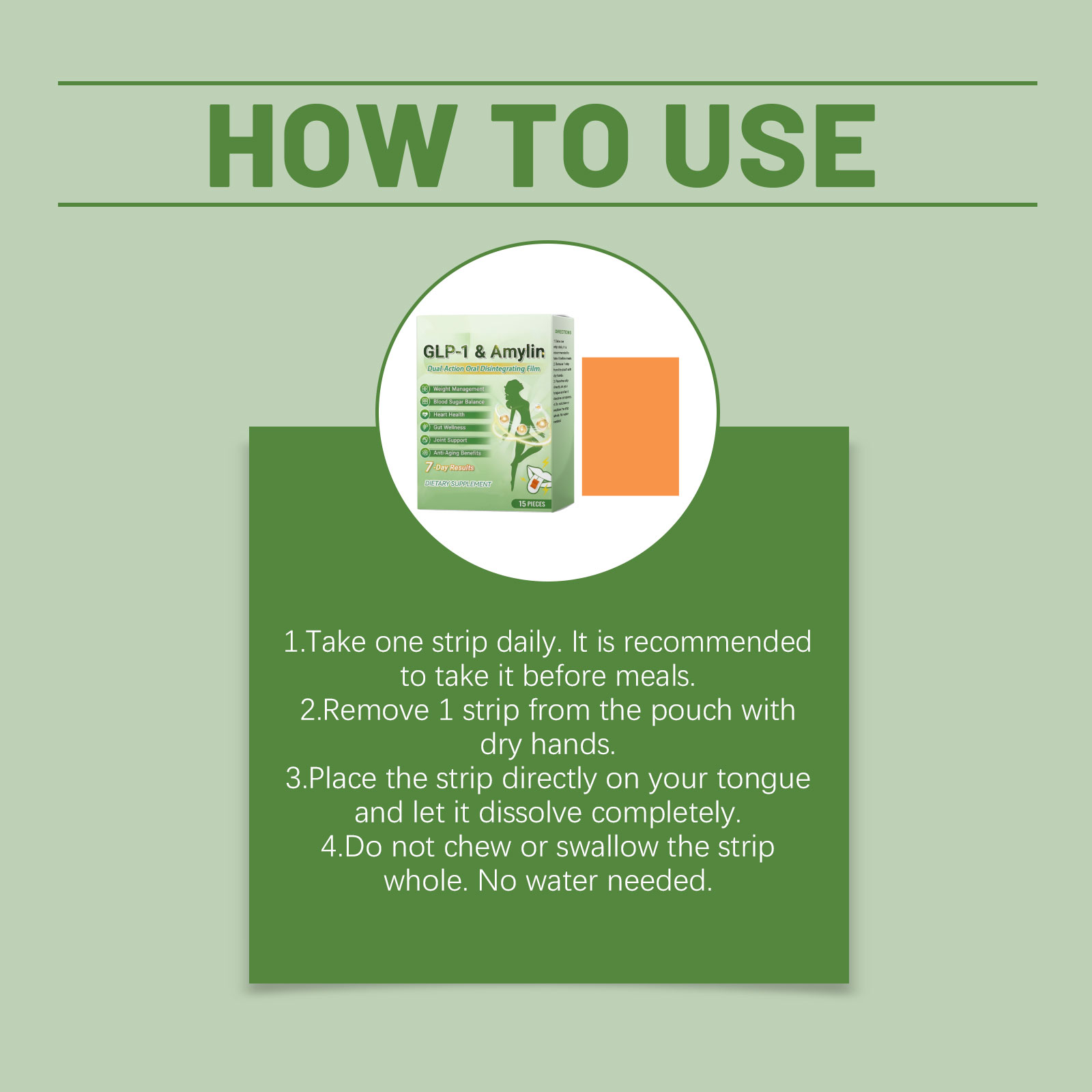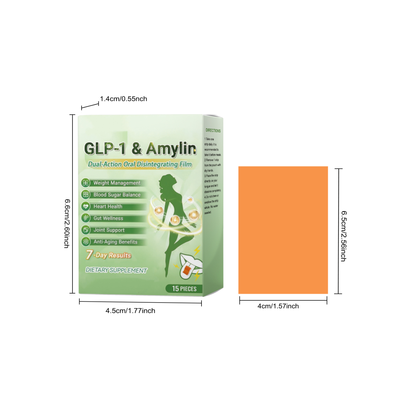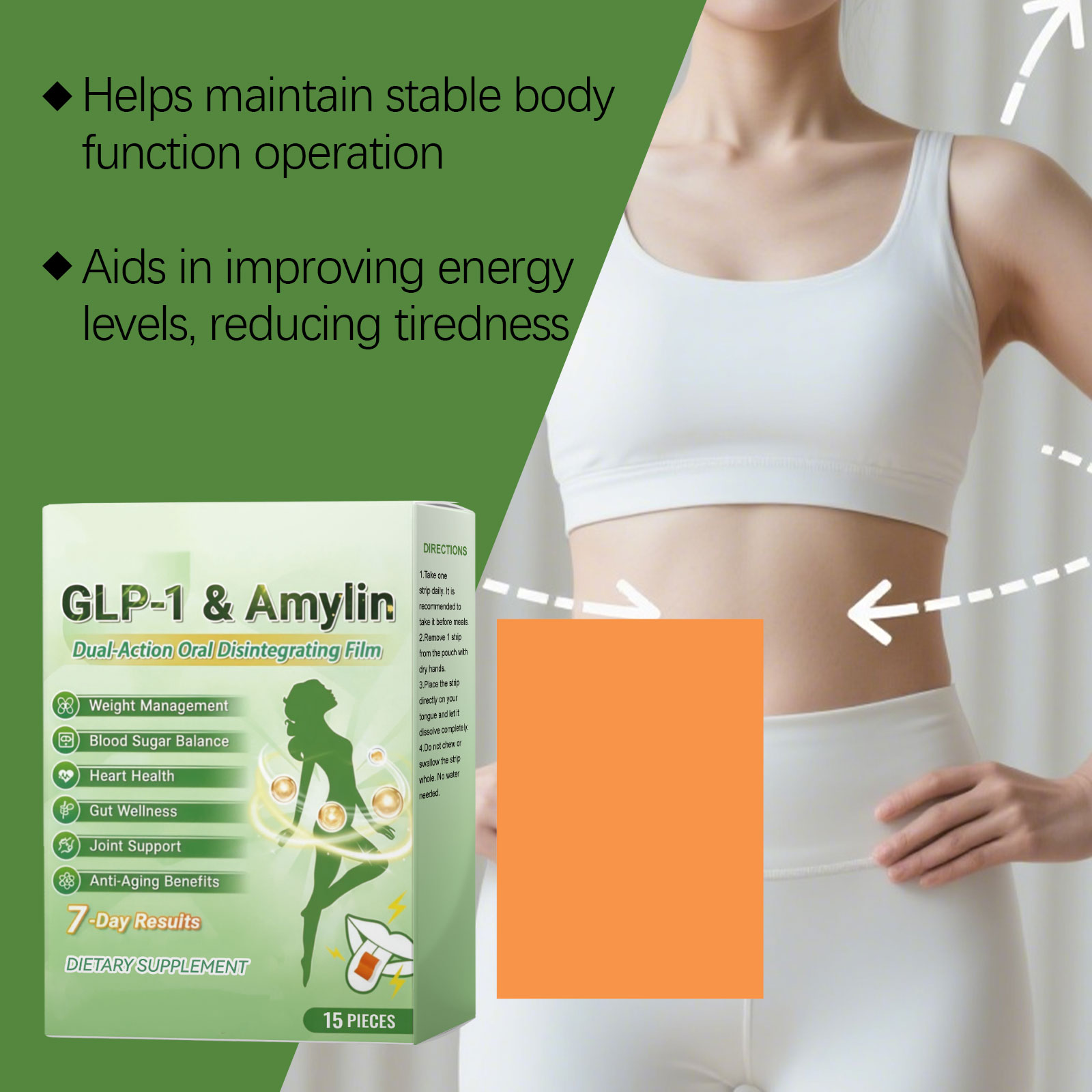 我们的身形护理口含片 ,由橙子、薄荷精心调配而成。专为抑制食欲,辅助血糖调节设计。使用方法极为便捷:1.每日服用一片。建议在餐前服用。2.用干燥的手从袋中取出一条试纸。3.将试纸直接放在舌头上,让其完全溶解。4.请勿咀嚼或整片吞服试纸。无需用水冲洗。并且可以促进新陈代谢,支持脂肪燃烧。