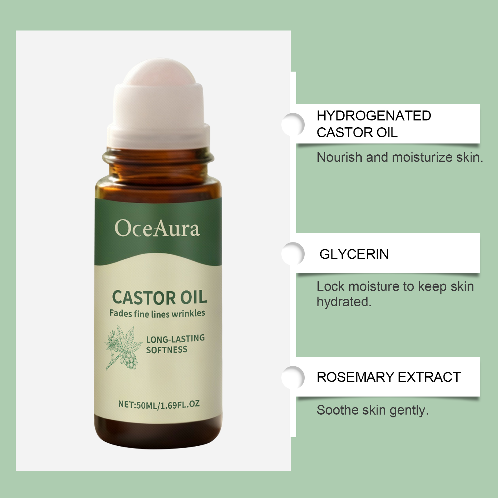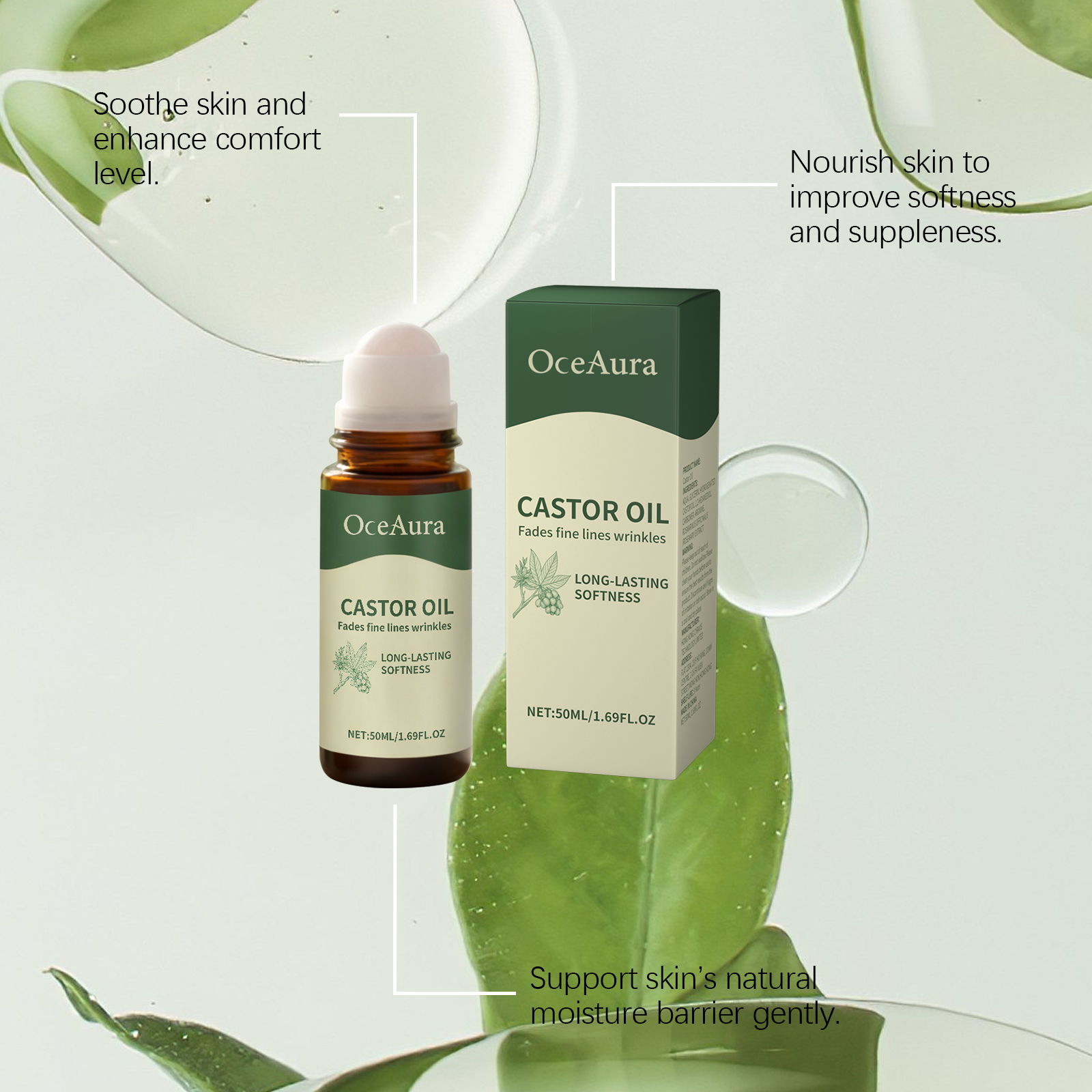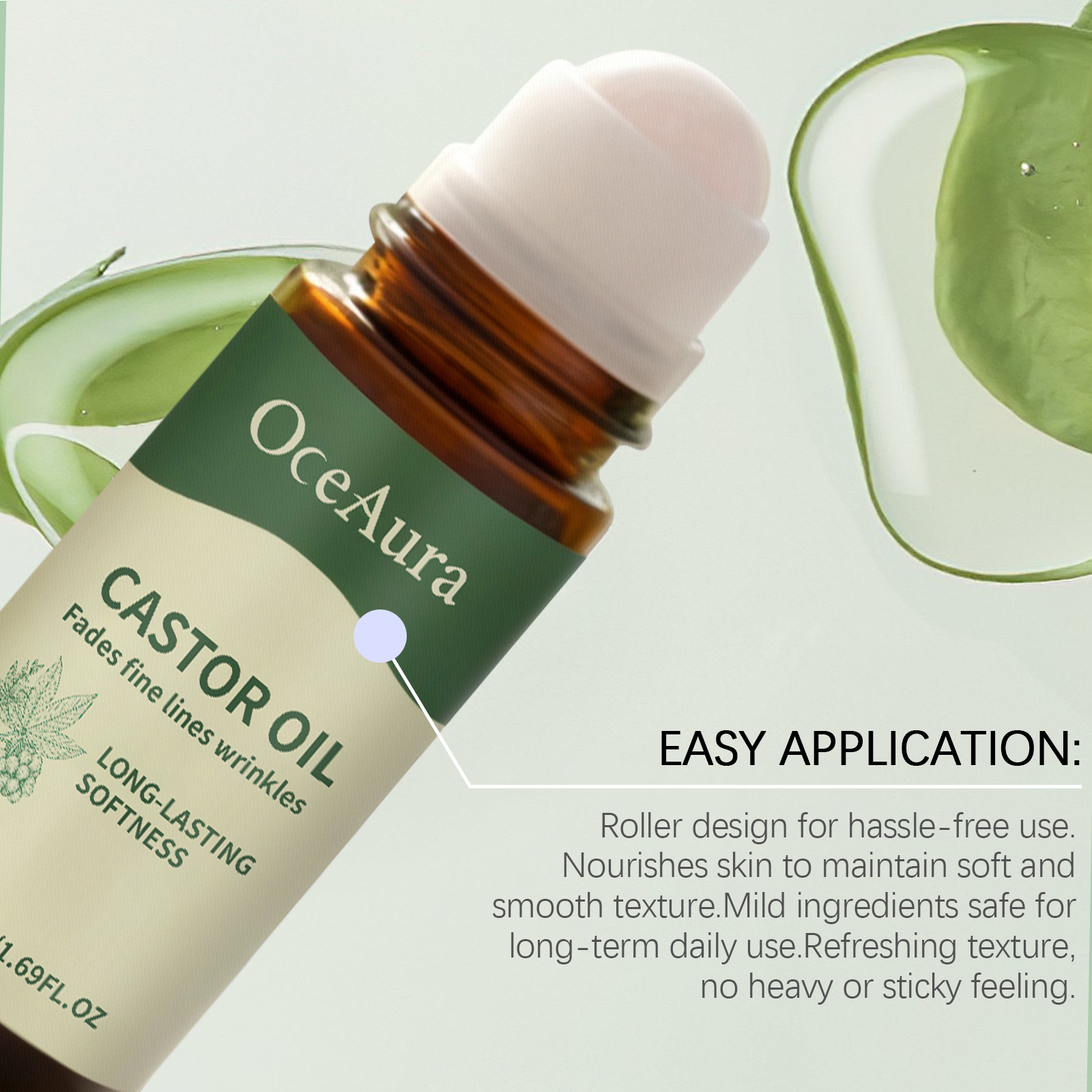 我们的蓖麻油滚珠精油,由甘油、氢化蓖麻油精心调配而成。专为彻底补充皮肤水分,舒适肌肤,无刺激设计。使用方法极为便捷:将本品直接滚动涂抹在皮肤上,轻轻按摩直至吸收。并且它可以深层滋润肌肤,持久保湿。舒缓肌肤并提升舒适感,滋养肌肤以改善柔软度和弹性,温和支持皮肤的天然保湿屏障。