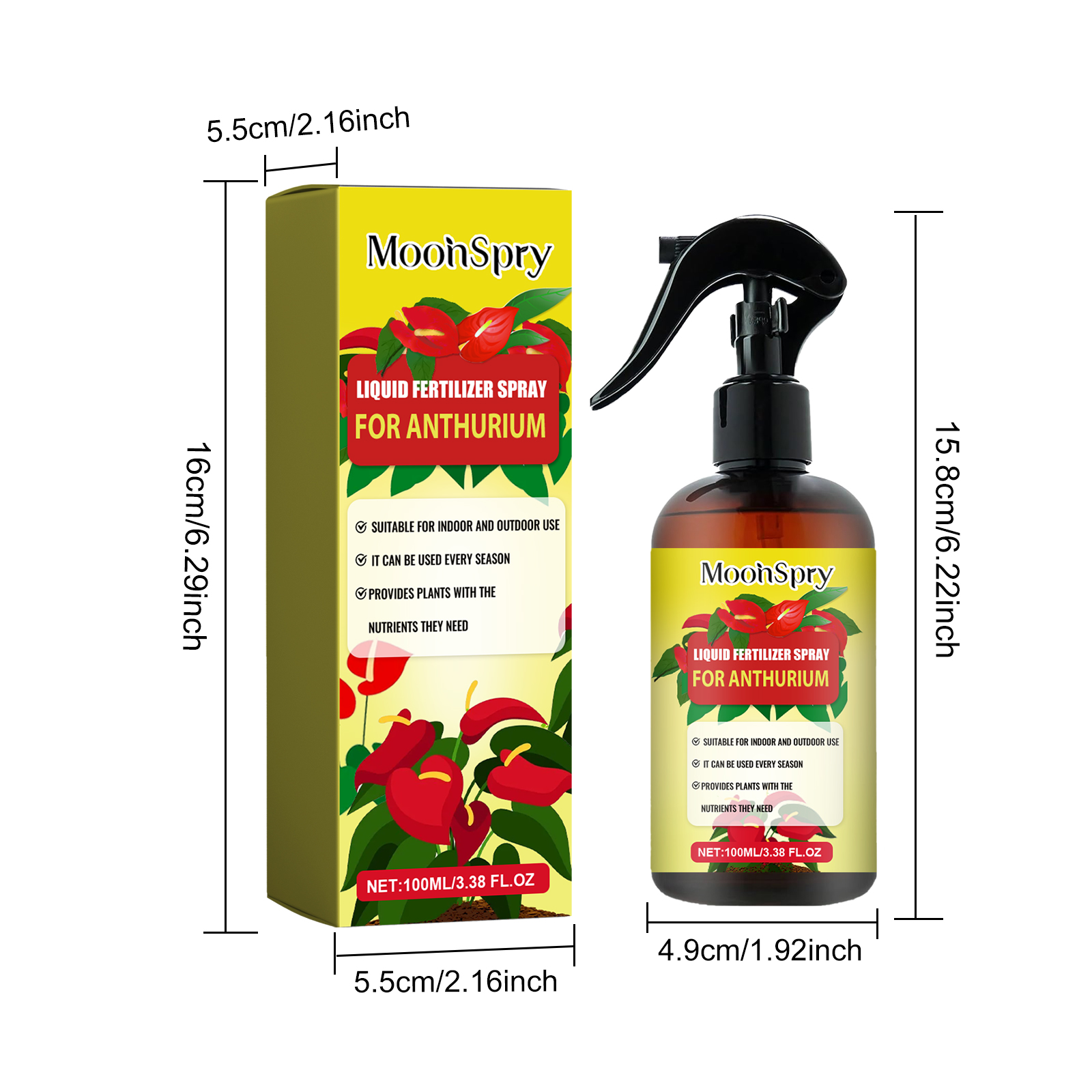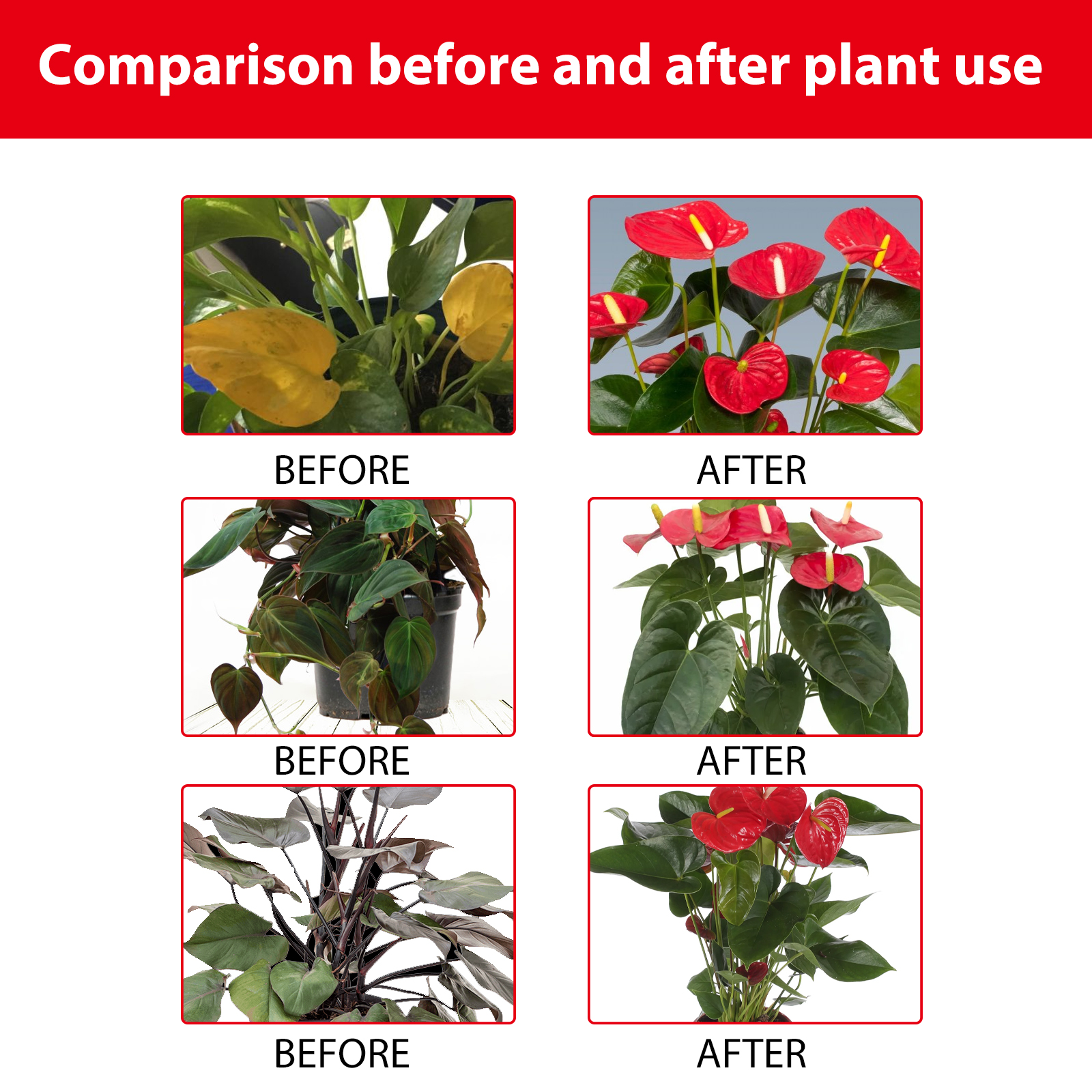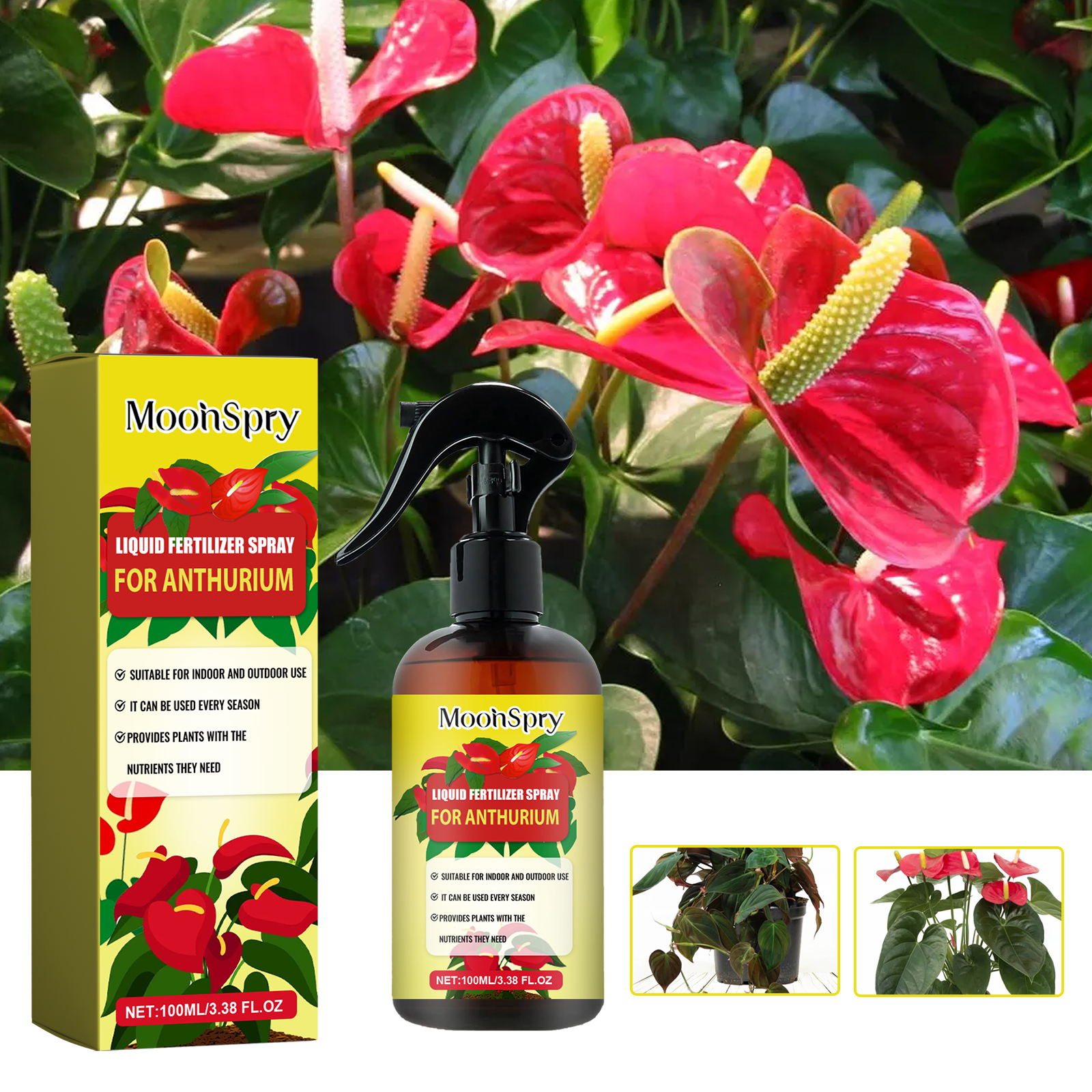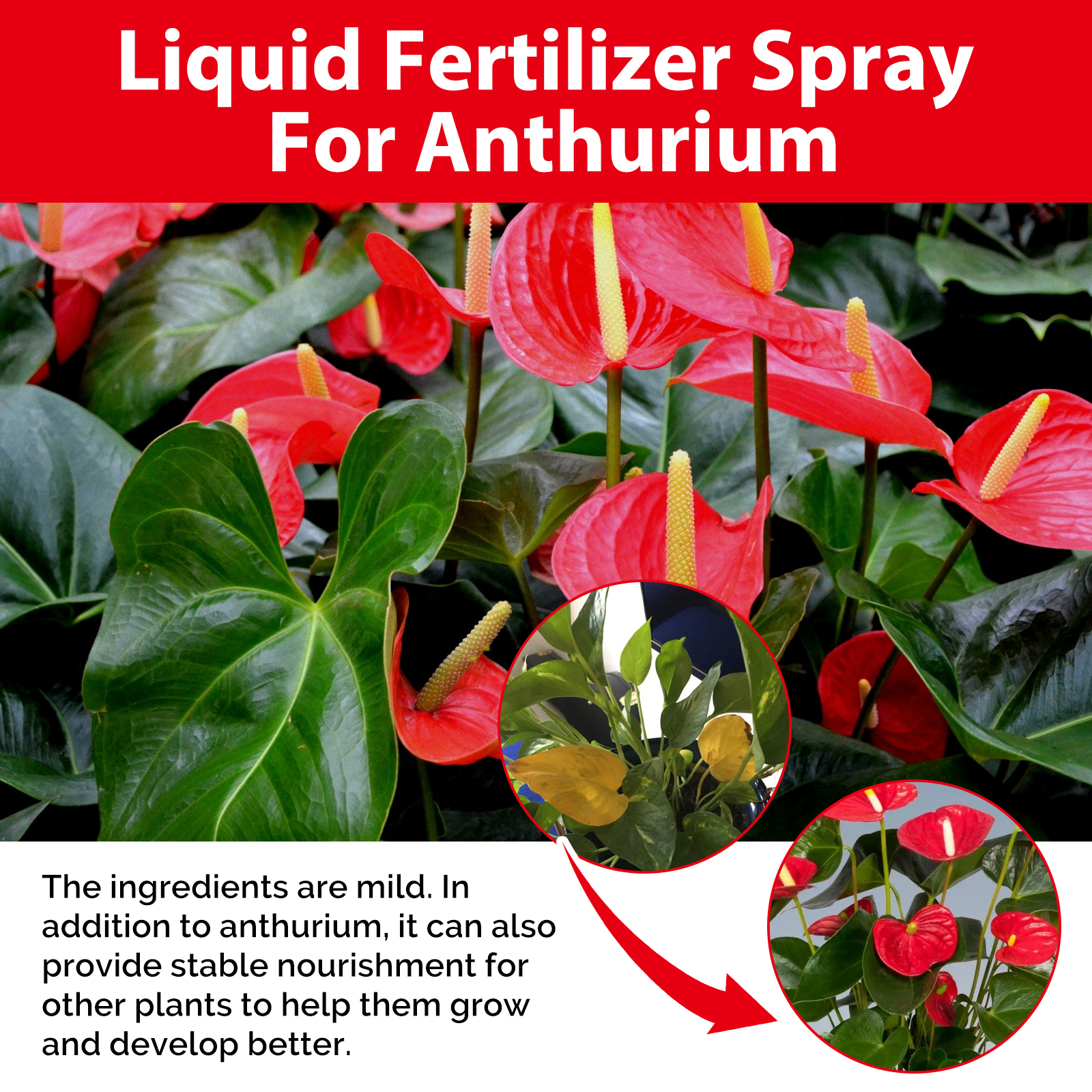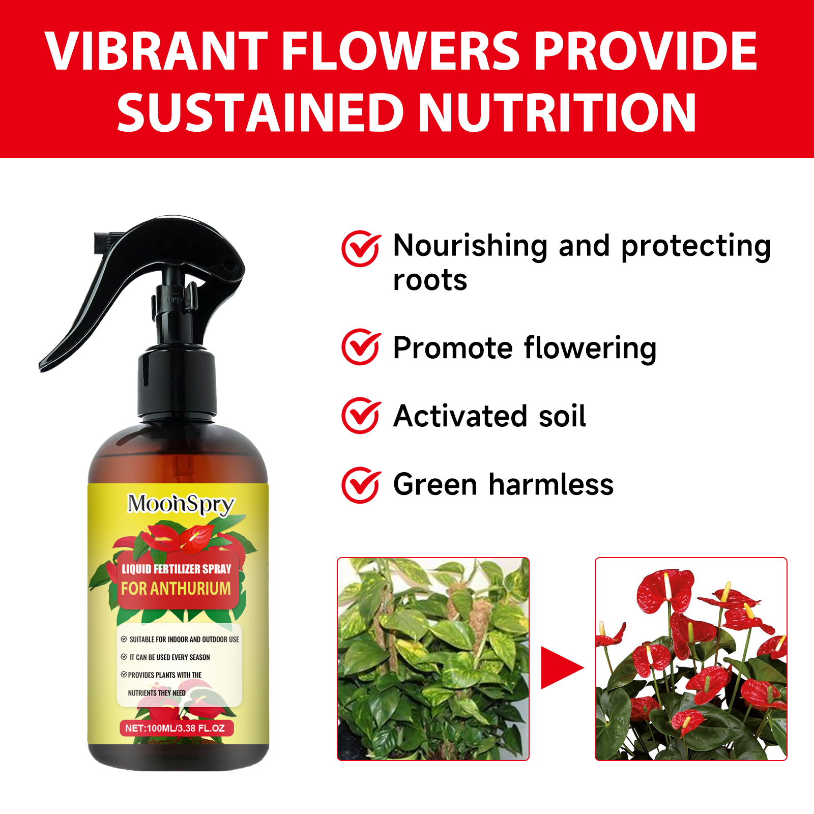 我们的红掌肥料喷雾含有高活性苄氨基嘌呤,硫酸镁配合物,对氯苯氧乙酸。它可以改善红掌土壤质地,提高土壤肥力和渗透性,刺激红掌花芽分化,提高开花频率和数量,使花更鲜艳,叶更绿。它的使用方法很简单:使用前摇匀,确保充分混合,将喷雾瓶放置在离叶子和茎大约12英寸的地方,均匀地喷洒溶液,确保完全覆盖。每周或每次浇水时使用本产品,以获得最佳效果,但要避免过度浇水。可以为其他植物提供稳定的营养,帮助它们更好地生长发育。