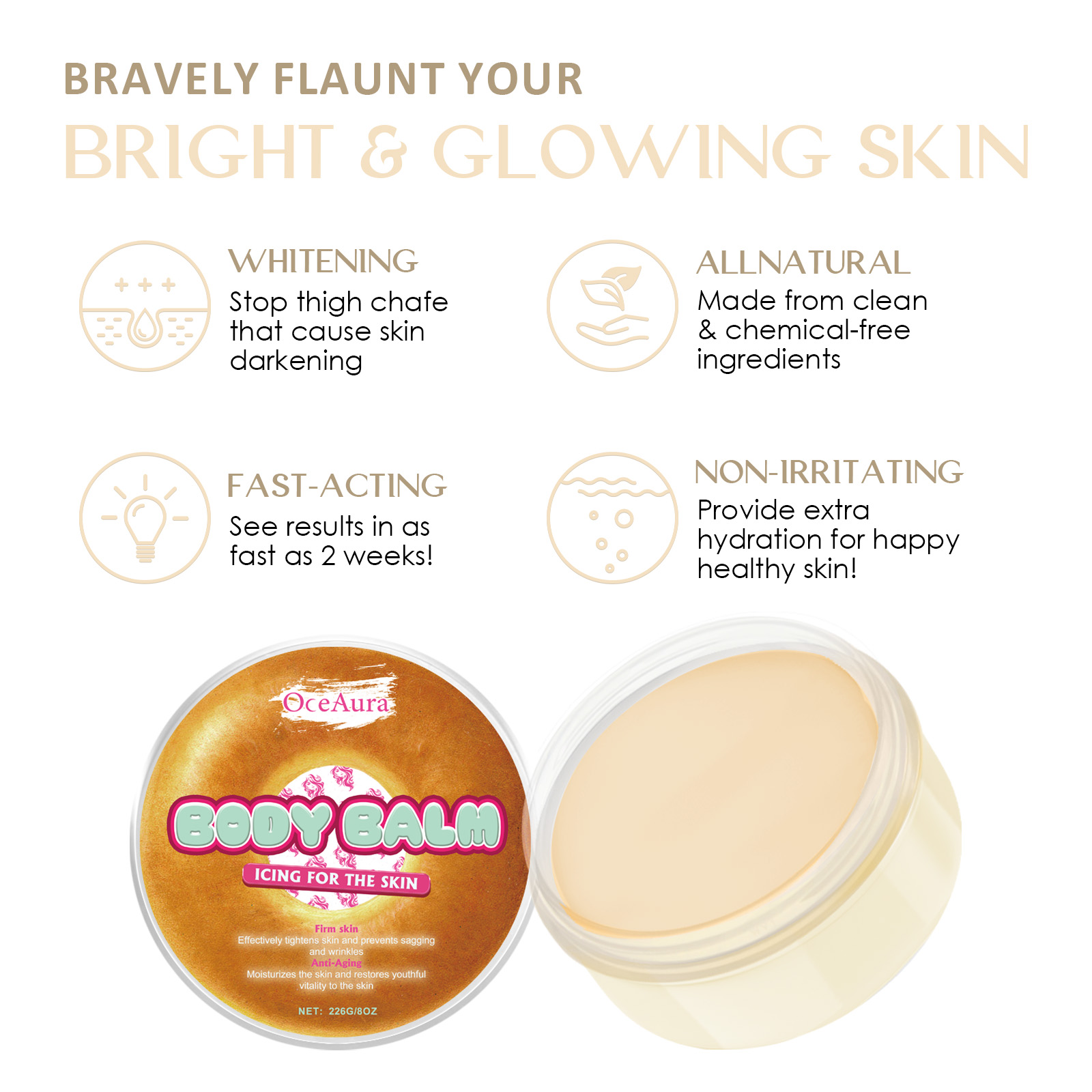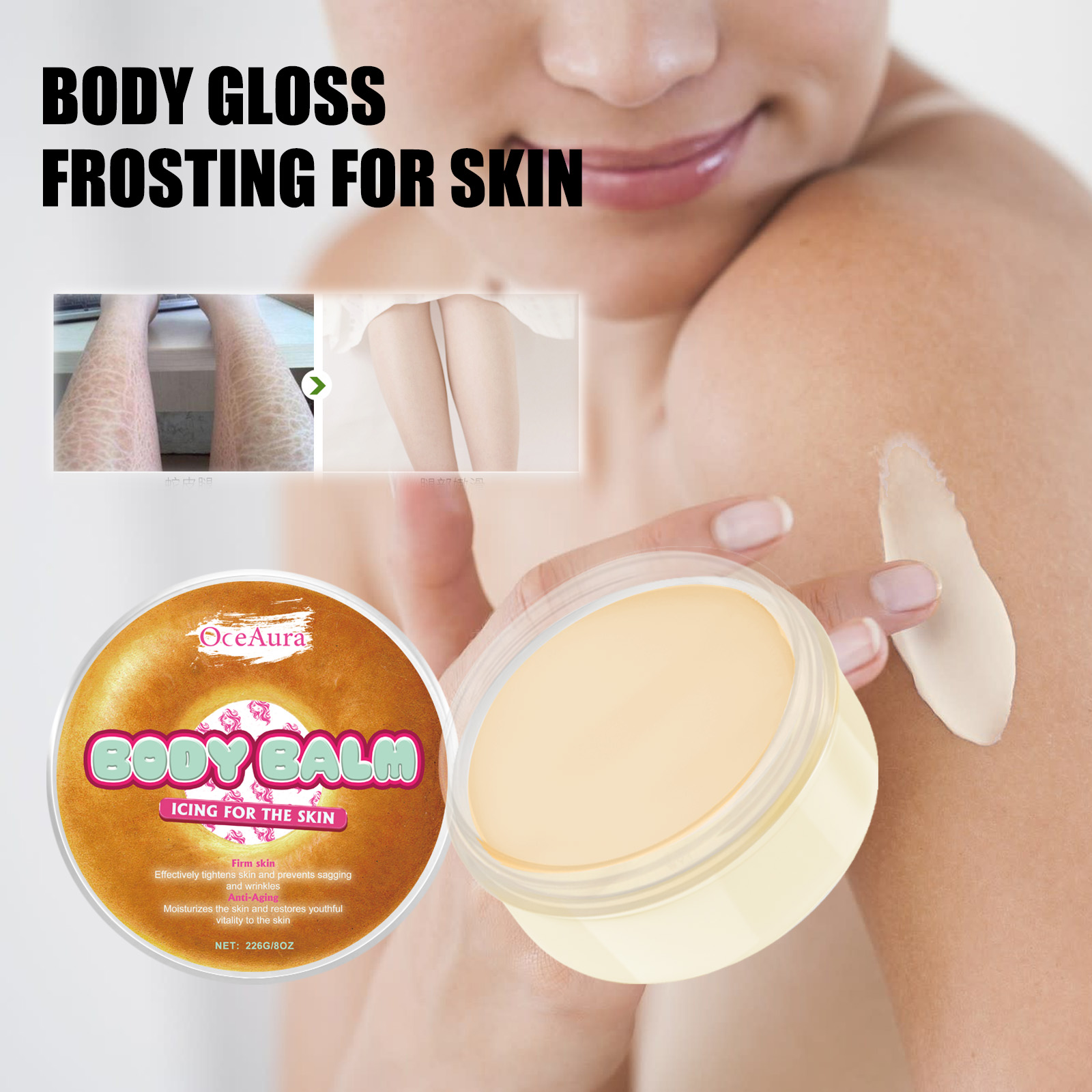 我们的甜甜圈身体保湿滋润膏含有棕榈果油、蜂蜡、葵花籽油。它可以通过促进皮肤脱落和细胞更新来修复受损皮肤,从而帮助减少受损皮肤的厚度和暗沉。它的使用方法很简单:清洁身体肌肤后,取适量本品,均匀涂抹于身体肌肤并轻轻按摩至吸收即可。深层滋润肌肤,保持皮肤的白皙嫩滑,适用于身体任何部位,包括颈部、背部腋下、膝盖、肘部等。