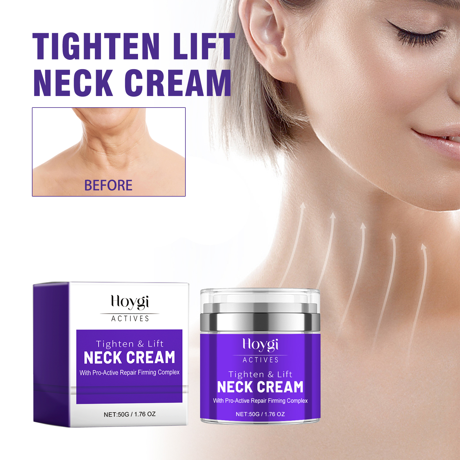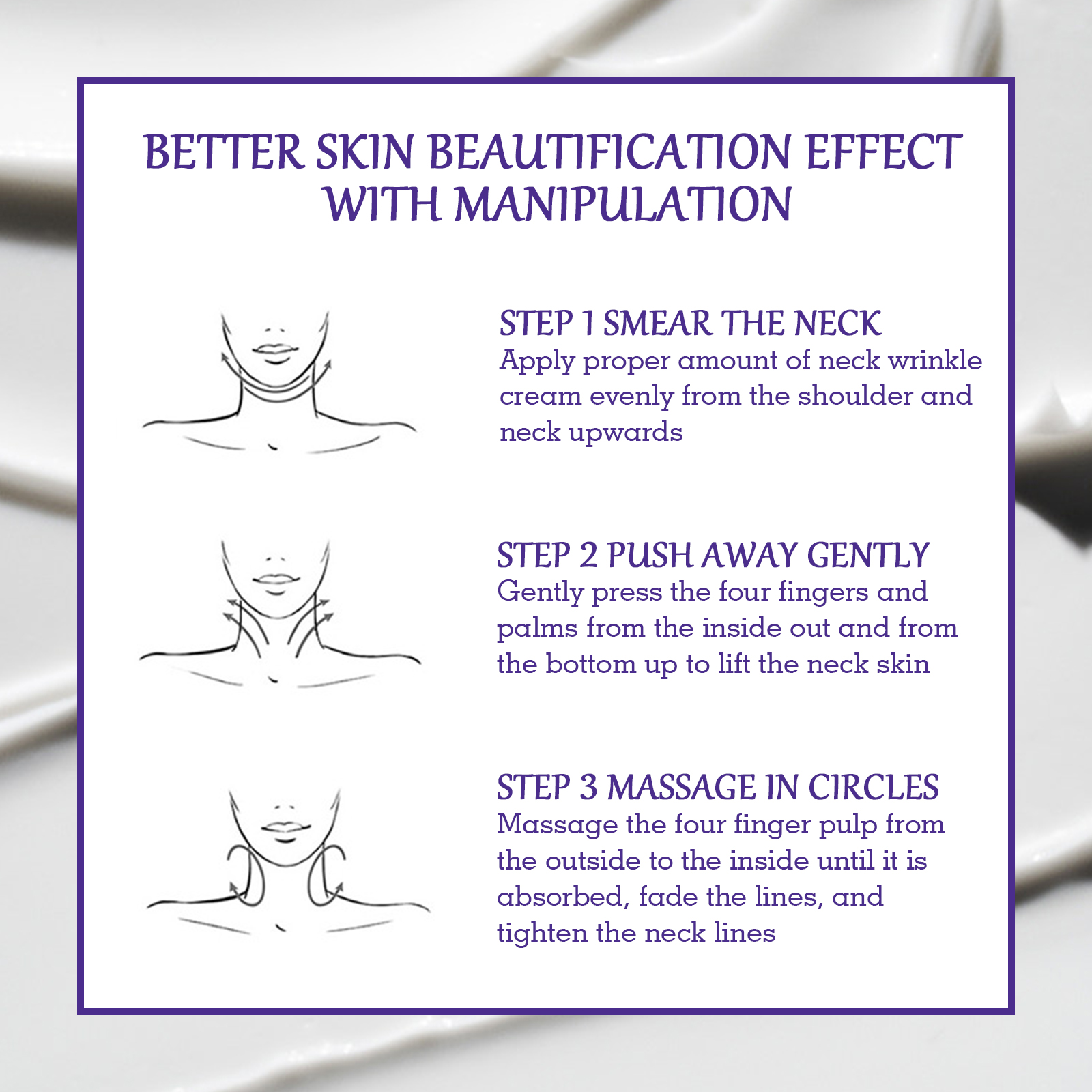 我们的颈部紧致提升霜含有甘油、透明质酸、牛油果树果脂油。它可以深层滋润肌肤,补充肌肤水分,修复干燥粗糙的颈部肌肤,使其柔软光滑。它的使用方法很简单:取适量本品涂抹颈部,由肩颈向上均匀涂抹,用四指和手掌由内而外由下而上轻轻按压,提拉颈部肌肤,四指腹由外向内按摩至吸收即可。可以显著减少颈部发红、肿胀和变色,紧致和调节肌肤,同时改善弹性。