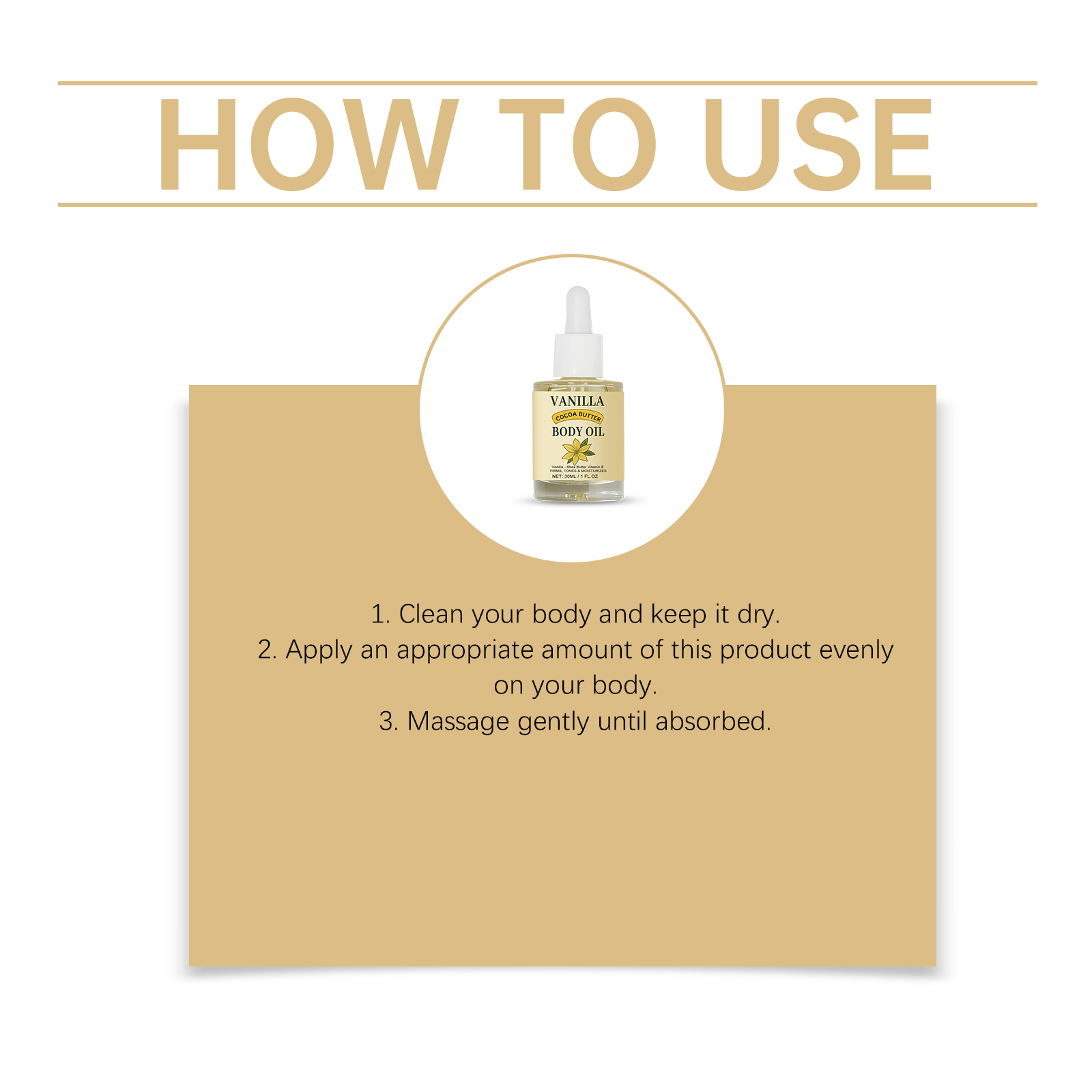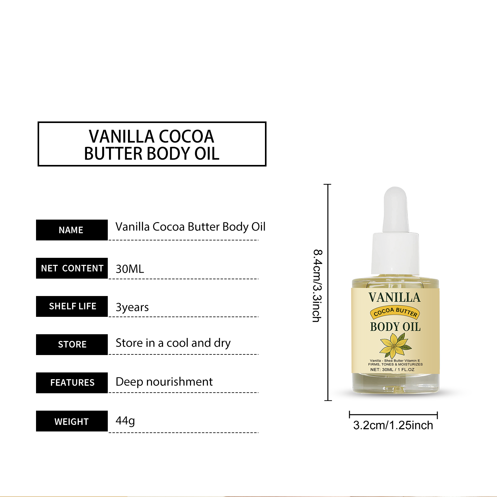 我们的香草可可润体油,由牛油果树果脂、生育酚(维生素E)精心调配而成。专为深层滋养肌肤设计。使用方法极为便捷:1.清洁身体并保持干燥。2.将适量本产品均匀涂抹于身体。3.轻柔按摩直至吸收。并且它温和无刺激,适合所有肤质。