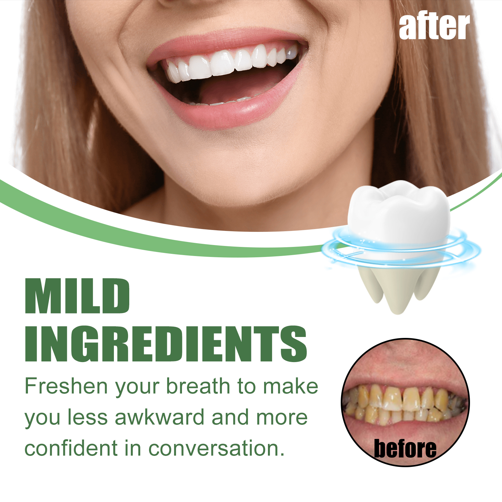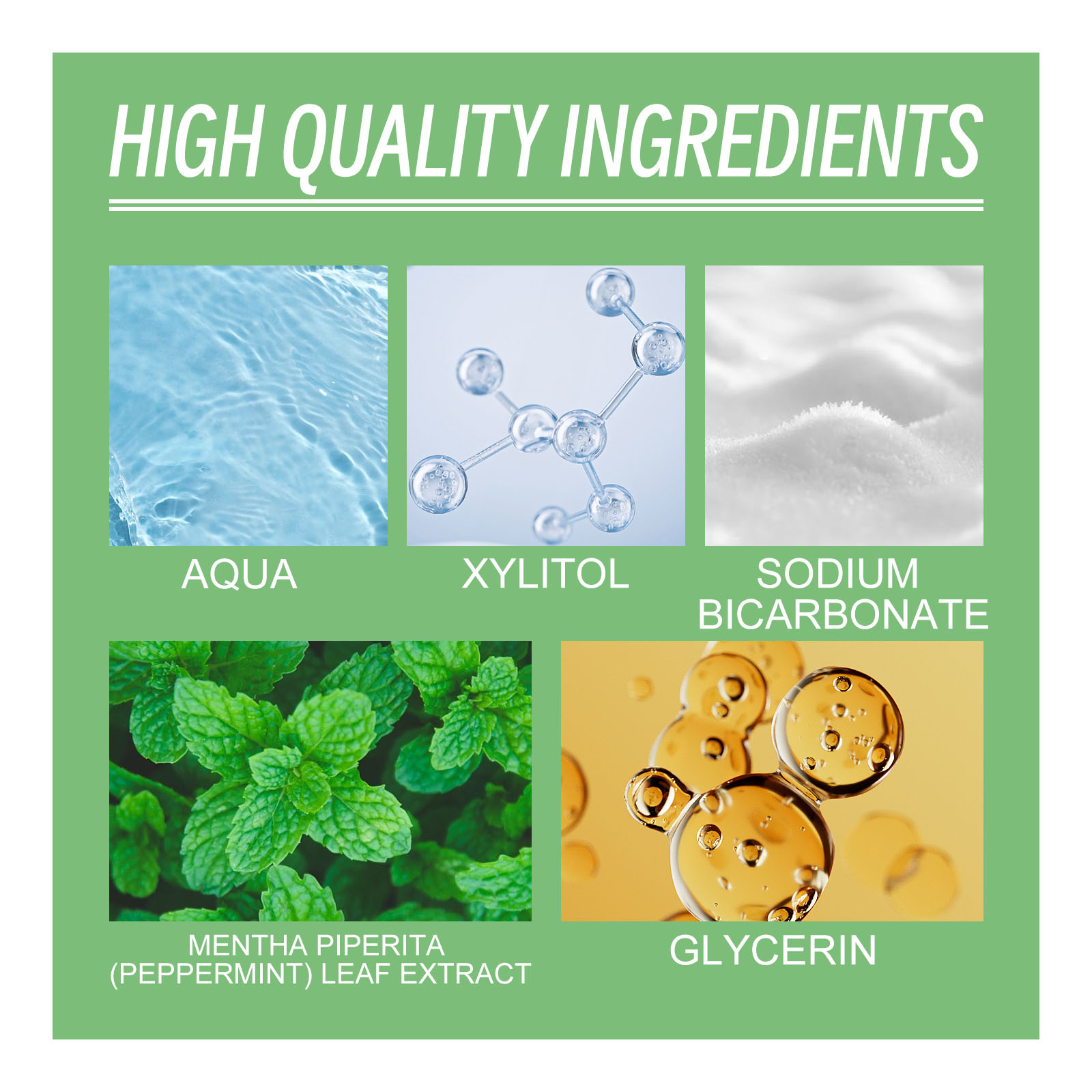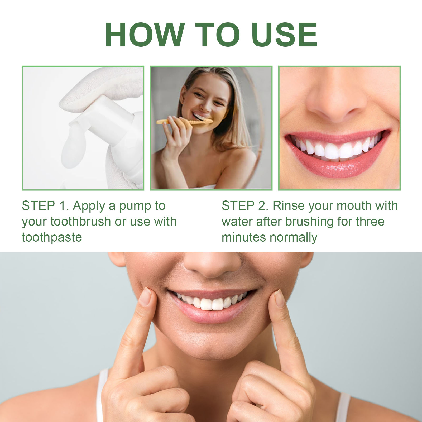 我们的牙齿焕白泡沫牙膏含有薄荷提取物、小苏打、木糖醇。它可以帮助清除牙齿污垢,美白牙齿,使牙齿更亮更白,预防蛀牙,改善牙龈的质地,让牙齿更健康。它的使用方法很简单:将适量牙膏挤在牙刷上,正常刷牙三分钟后,用清水漱口即可。可以清新口气,让您在交谈中不那么尴尬,更自信。
