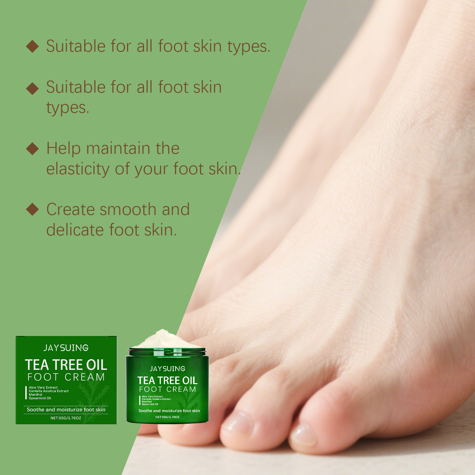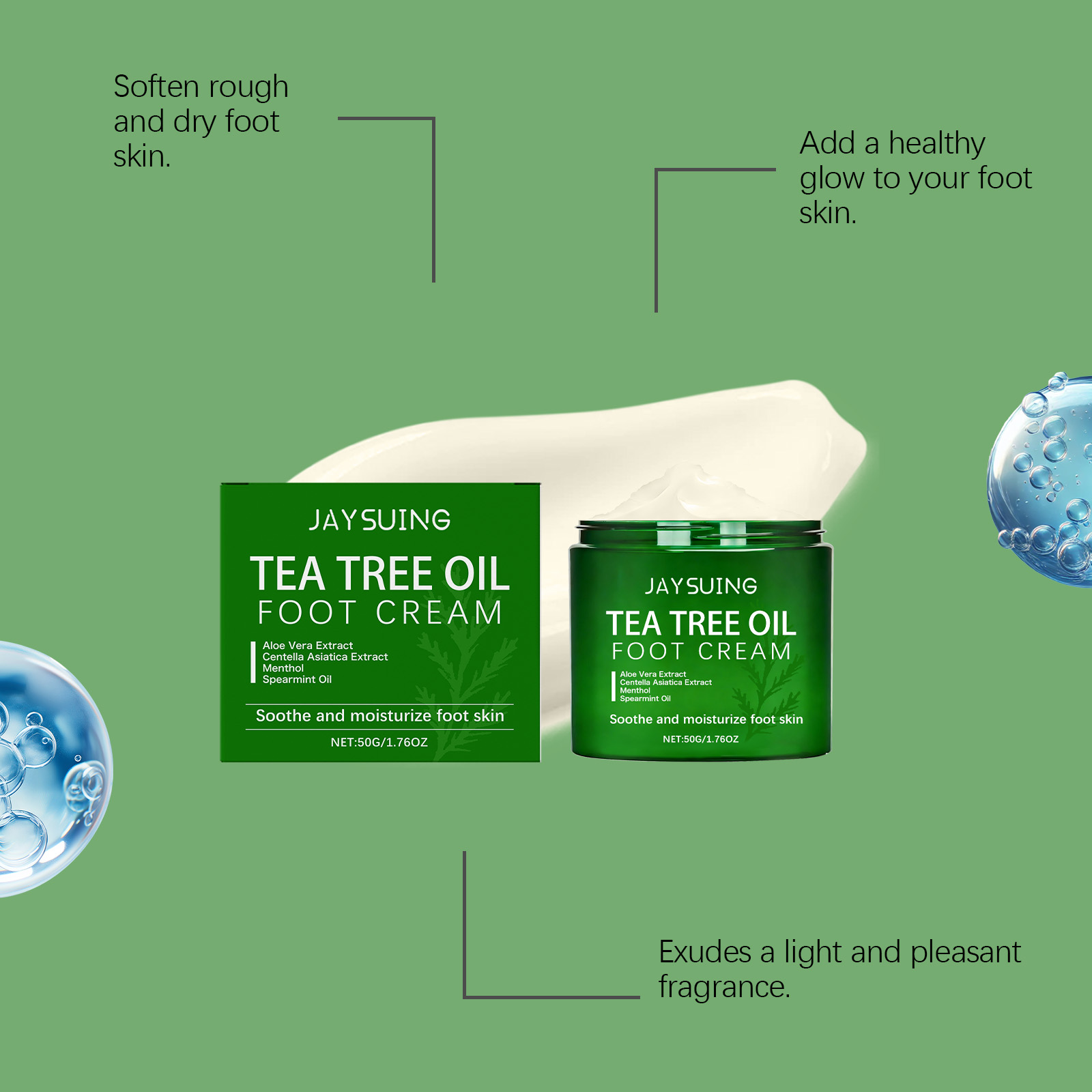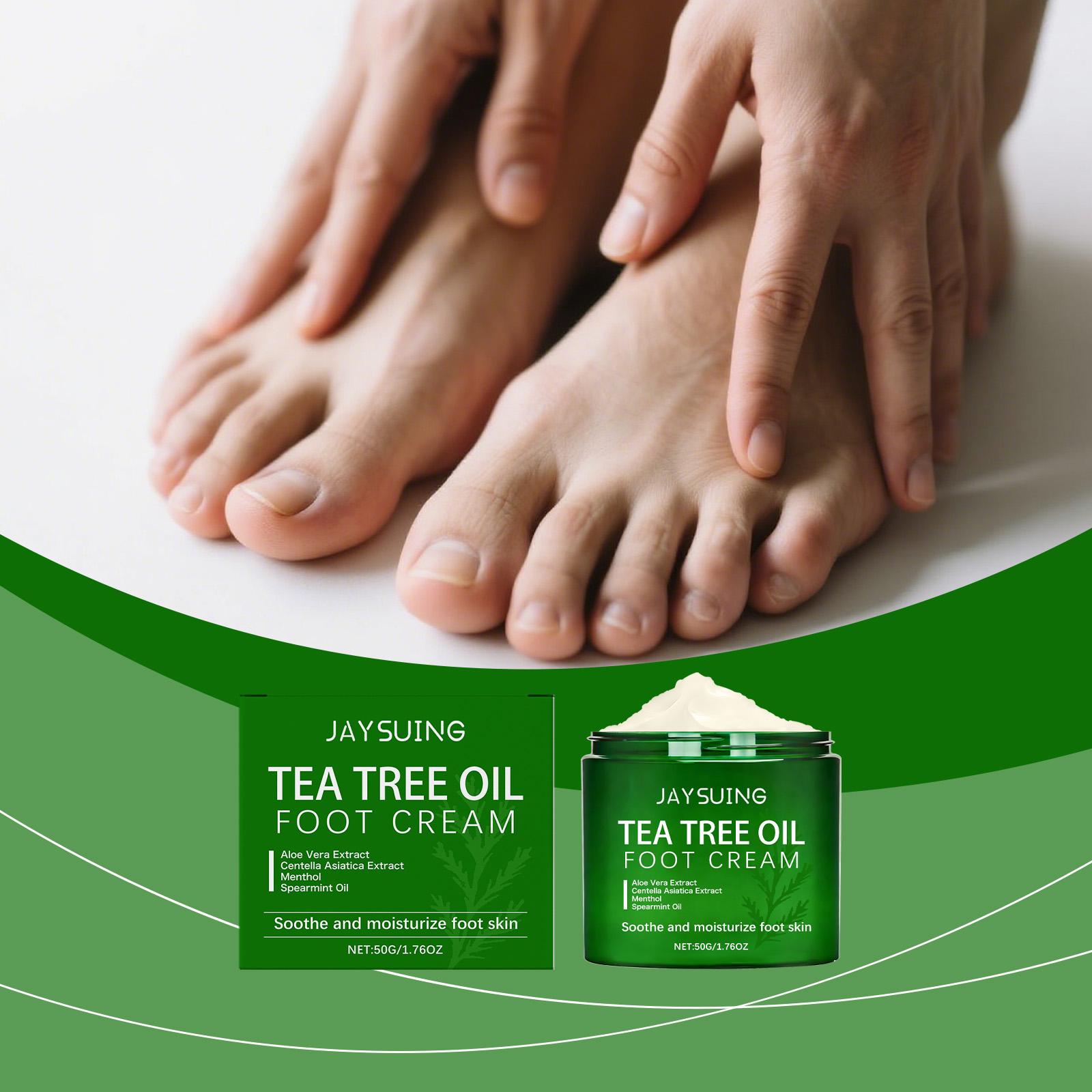 我们的茶树油护理足霜,由薄荷脑、留兰香叶油精心调配而成。专为让您的双脚感到水润设计。使用方法极为便捷:1. 先将双脚清洁并擦干,然后取适量的足霜涂抹在脚上。2. 均匀地涂抹于双脚肌肤上。3. 轻轻按摩直至完全吸收。有助于让食材更好地渗透和吸收的措施。并且可以改善脚部干燥。
