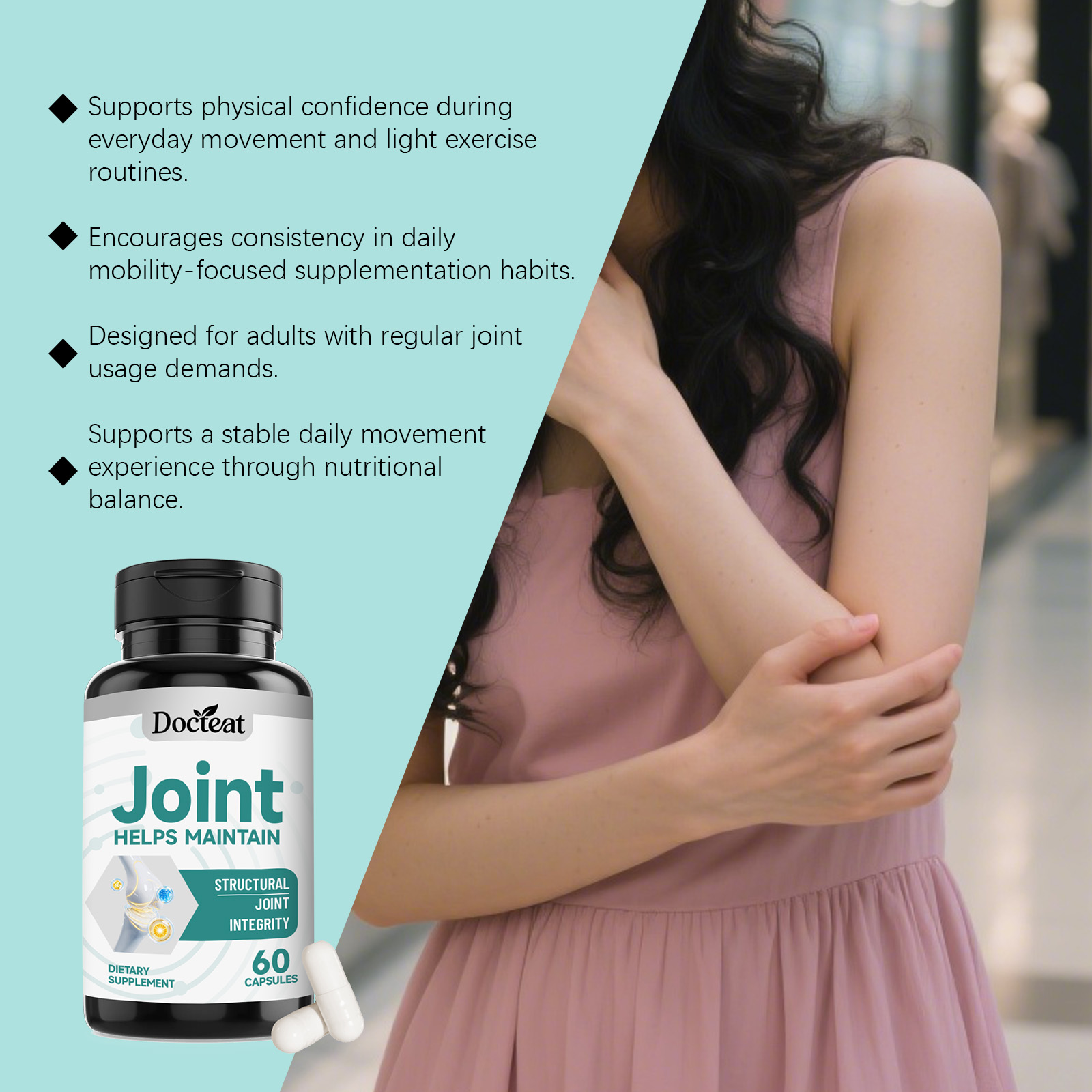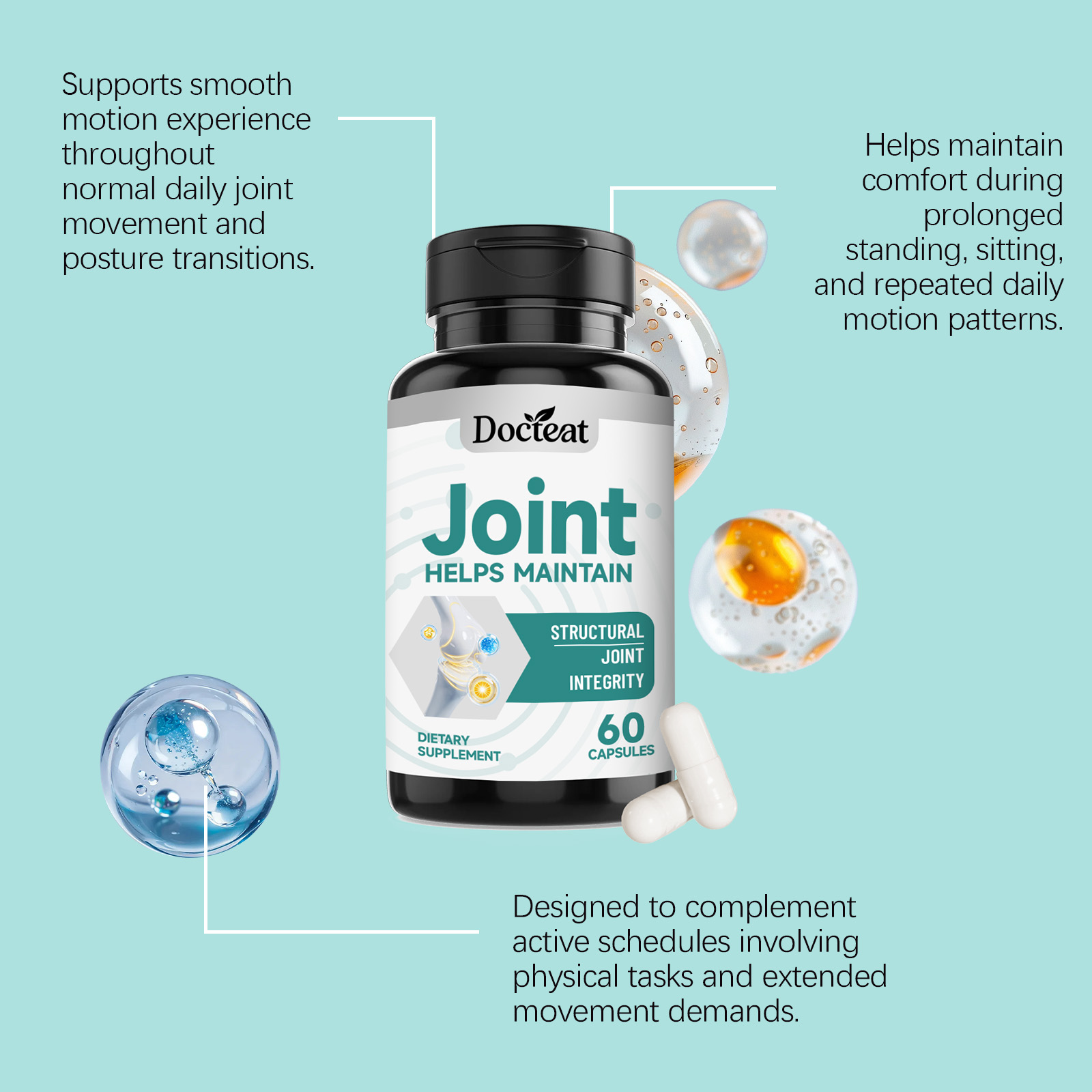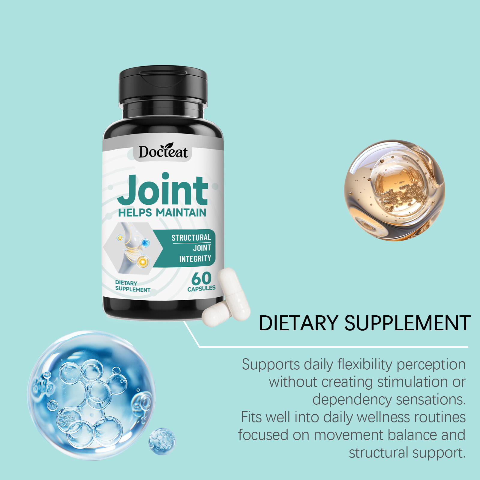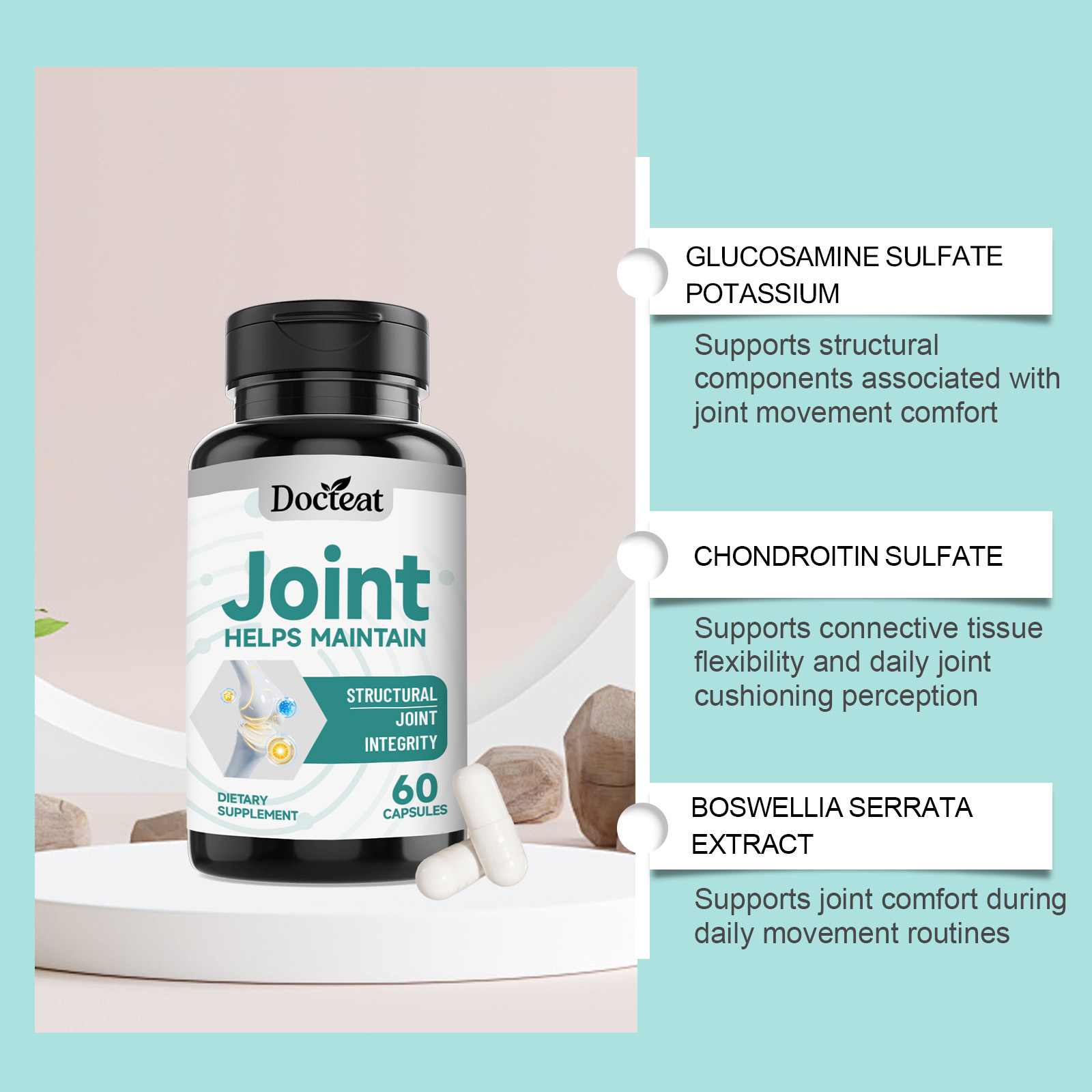 我们的关节健康支持胶囊,由硫酸氨基葡萄糖钾、硫酸软骨素精心调配而成。专为支持与关节活动舒适度相关的结构基础设计。使用方法极为便捷:每天一次,每次3粒。并且它可以支持结缔组织灵活度与关节缓冲感受。